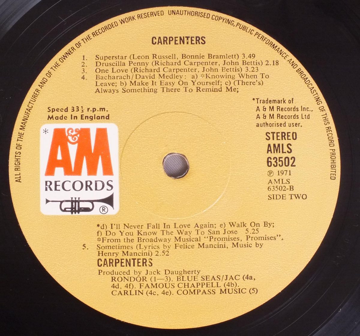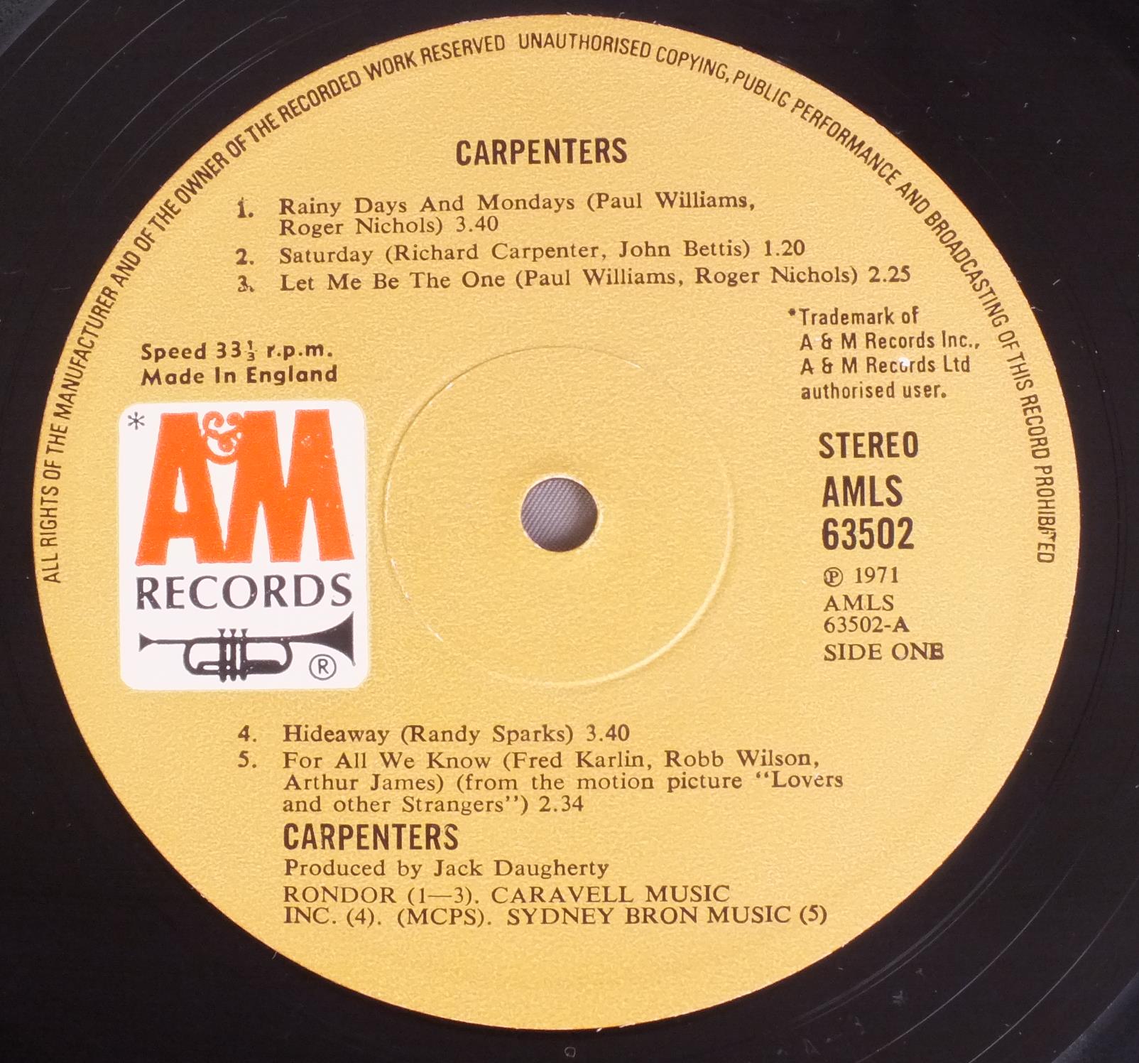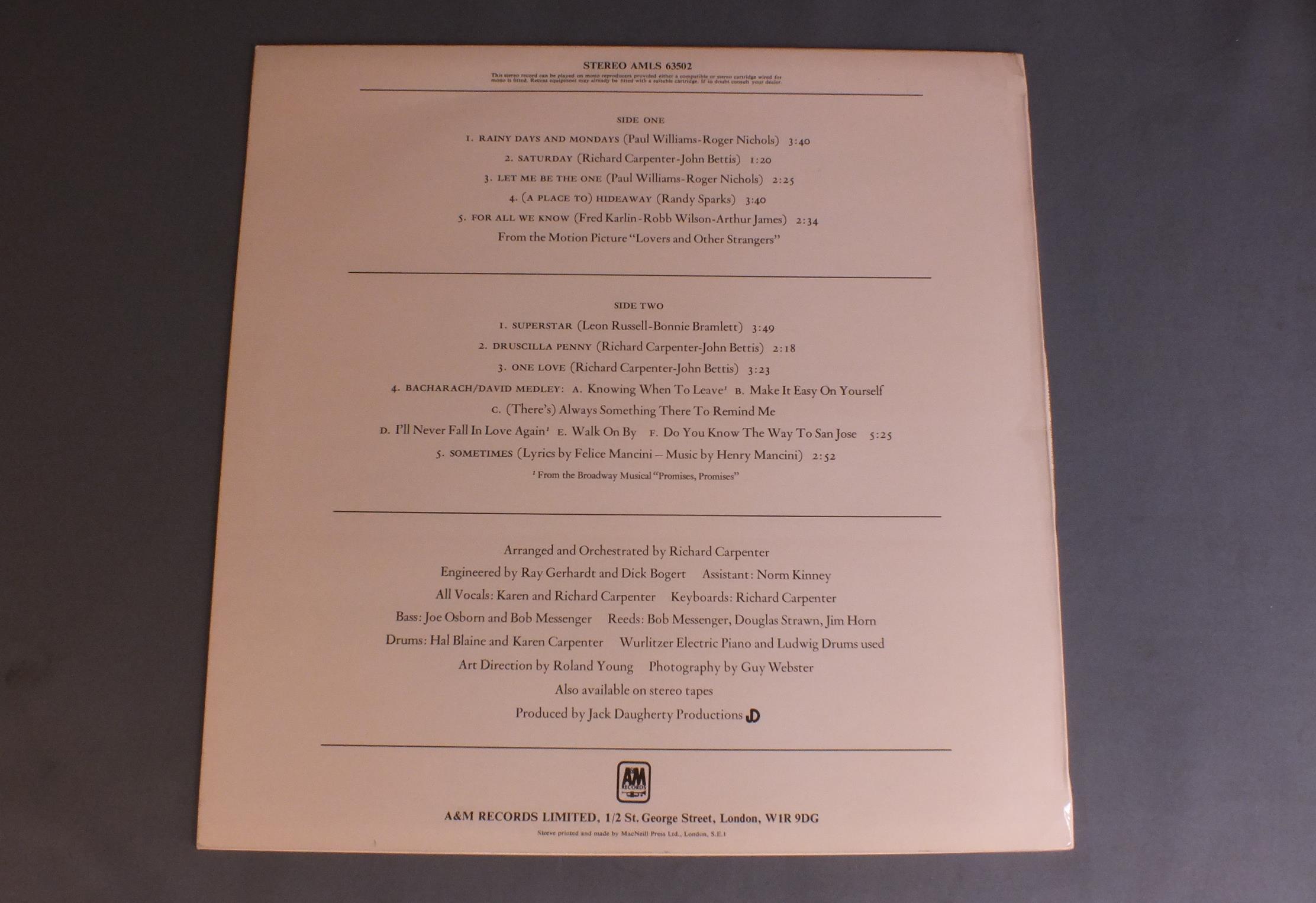 CARPENTERS/CARPENTERS AMLS63502 製造国:英国盤 / Media:LPMatrix:A-3*T 2B-3*T外観:EX盤の状態:EX 価格(税込):¥4,950(売約済) 送料 7inch:定形外郵便 360円~LP:定形外郵便 660円~送料は、注文の最終画面で確認頂けます。 > > CARPENTERS/CARPENTERS 外観 (EX)特記事項:両面共厚手のコーティング仕様。背に沿ってコーティングの浮き有り。全体的にコーティングのヨレシワも少なく、スレやスリキズ等も薄い状態。ヨレ感のないしっかりした状態。外観EXの共通説明:ダメージが限定的。中古品としては保存状態がよい方。シミ、ヨゴレ、スレ 少し~軽度。 盤の状態 (EX)特記事項:薄いスリキズ・スレ少しある程度。音に出そうなものもなく一見してきれいな状態です。曲間など、静かなところを中心に聴いて見ましたが、チリノイズ少ないきれいな再生具合でした。盤EXの共通説明:盤面のスリキズが薄いものが少し~軽度 音に出そうなものは無いように見える(軽微なソフトティック音は除く)。 その他:3作目にしてセルフ・タイトル。(UKでは2nd ALBUM)名盤です。 Tweet それぞれの画像をクリックすると、大きい写真が見られます こちらの商品もお勧めです 5,060円 JONI MITCHELL / CHALK MARK IN A RAIN STORM 7,700円 SUSAN MAUGHAN / I WANNA BE BOBBY`S GIRL 3,850円 NICO / THE END 4,950円 JONI MITCHELL / DOG EAT DOG 4,400円 JONI MITCHELL / DOG EAT DOG 4,950円 SANDY DENNY / RENDEZVOUS