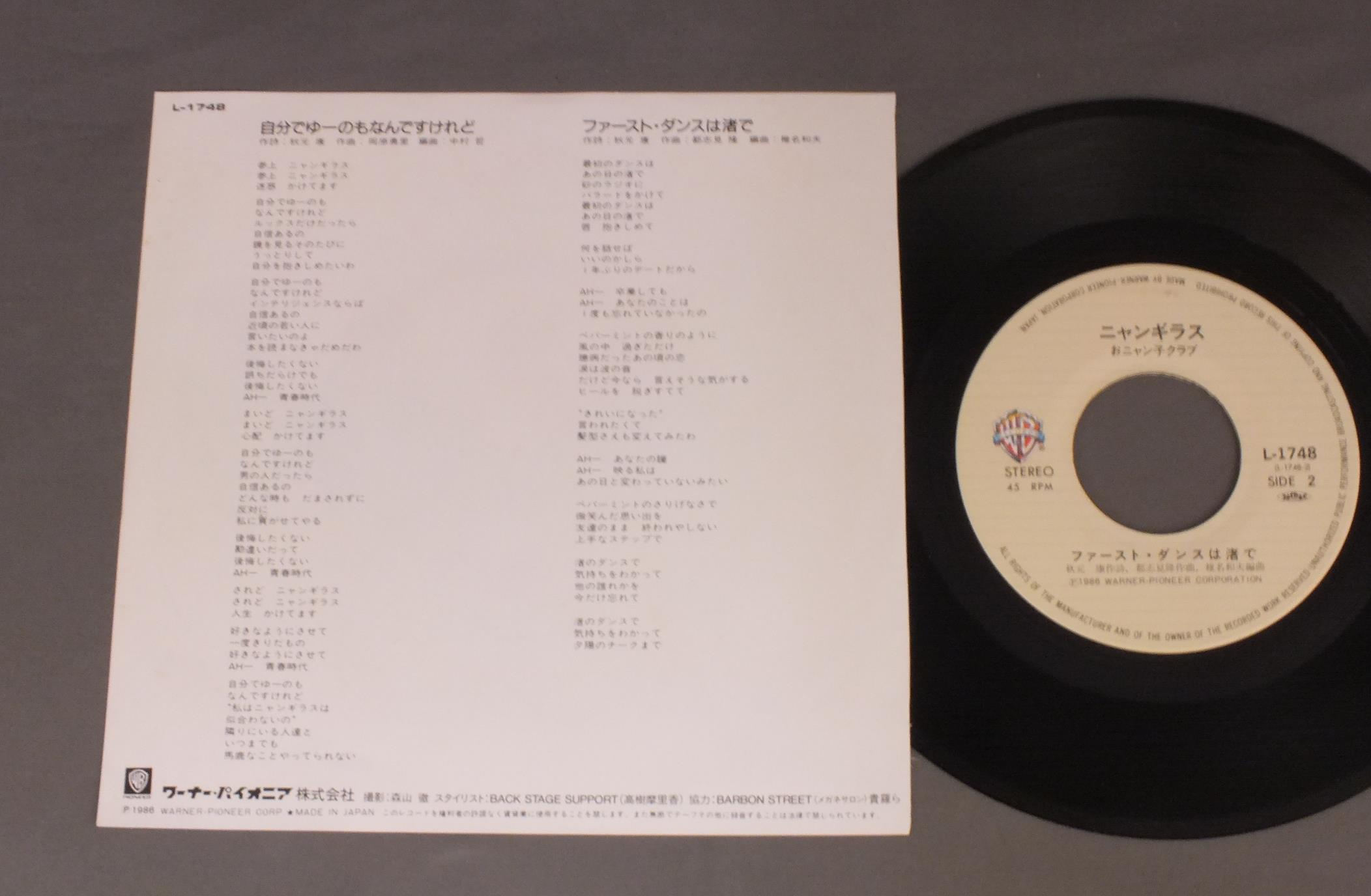 NYANGILASニャンギラス/JIBUN DE YUNOMO NANDESUGA自分でゆーのもなんですけれど L1748 製造国:日本盤 / Media:7inch外観:EX盤の状態:EX+ 価格(税込):¥330 送料 7inch:定形外郵便 360円~LP:定形外郵便 660円~送料は、注文の最終画面で確認頂けます。 > > NYANGILAS/JIBUN DE YUNOMO NANDESUGA 外観 (EX)特記事項:特記なし。外観EXの共通説明:ダメージが限定的。中古品としては保存状態がよい方。シミ、ヨゴレ、スレ 少し~軽度。 盤の状態 (EX+)特記事項:極薄いスリキズ・スレ少し。一見してきれいな状態です。盤EX+の共通説明:盤面の極薄いスリキズ、スレ少し程度 音に出そうなものは無いように見える(極軽微なソフトティック音は除く)。 Tweet それぞれの画像をクリックすると、大きい写真が見られます こちらの商品もお勧めです 1,320円 MIKI ASAKURA麻倉未稀 / SEXY ELEGANCEセクシー・エレガント 1,210円 SAORI MINAMI南沙織 / SUFFERING AGEヤングのテーマ 傷つく世代 550円 SONOKO KAWAI河合その子 / SONOKOその子 770円 ERI NITTA新田恵利 / ERI 880円 MOMOE YAMAGUCHI山口百恵 / BEST HITS山口百恵ヒット全曲集 990円 MINAYO WATANABE渡辺美奈代 / ALFALFAアルファルファ 1,210円 AKINA NAKAMORI中森明菜 / FANTASYファンタジー`幻想曲` 660円 TOSHIRO OHMI近江俊郎 / BEST COLLECTION懐かしの歌声デラックス 湯の町エレジー
