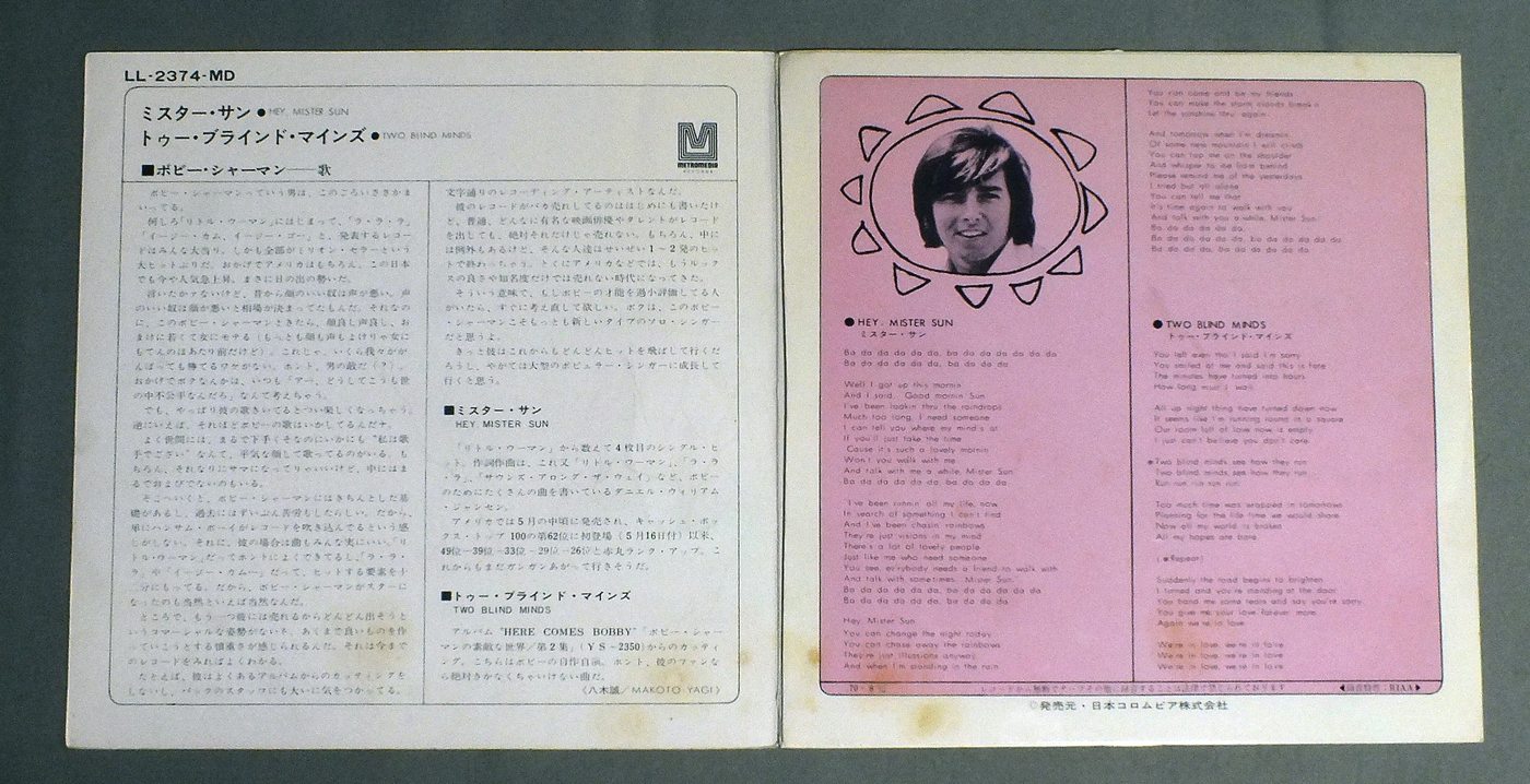 BOBBY SHERMANボビー・シャーマン/HEY. MISTER SUNミスター・サン LL2374MD 製造国:日本盤 / Media:7inch外観:VG+盤の状態:EX 価格(税込):¥440 送料 7inch:定形外郵便 360円~LP:定形外郵便 660円~送料は、注文の最終画面で確認頂けます。 > > BOBBY SHERMAN/HEY. MISTER SUN 外観 (VG+)特記事項:背の上下に破れ。外観VG+の共通説明:ダメージやや有り。シミ、ヨゴレ、スレなど多少~やや多め。 盤の状態 (EX)特記事項:薄いスリキズ・スレ軽くある感じ。軽微なものの様子です。盤EXの共通説明:盤面のスリキズが薄いものが少し~軽度 音に出そうなものは無いように見える(軽微なソフトティック音は除く)。 Tweet それぞれの画像をクリックすると、大きい写真が見られます こちらの商品もお勧めです 990円 RANDY VANWARMERランディ・ヴァンウォーマー / WARMERアメリカン・モーニング 770円 ELTON JOHNエルトン・ジョン / ROCK OF THE WESTIESロック・オブ・ザ・ウェスティーズ 440円 JOHNNY MATHISジョニー・マチス / LOVE IS BLUE恋はみずいろ 1,210円 ART GARFUNKELアート・ガーファンクル / ANGEL CLAREエンジェル・クレア 1,320円 JONNY RIVERSジョニー・リバース / MISTER GO ! GO ! 60s ISSUEミスター・ゴー・ゴー ペラジャケ 770円 YVES MONTANDイヴ・モンタン / LE PARIS DE… YVES MONTANDモンタン. パリの心を歌う 440円 JOHNNY MATHISジョニー・マティス / KILLING ME SOFTLY WITH HER SONGやさしく歌って 660円 ERIC CARMENエリック・カルメン / TONIGHT YOU`RE MINEトゥナイト・ユー・アー・マイン
