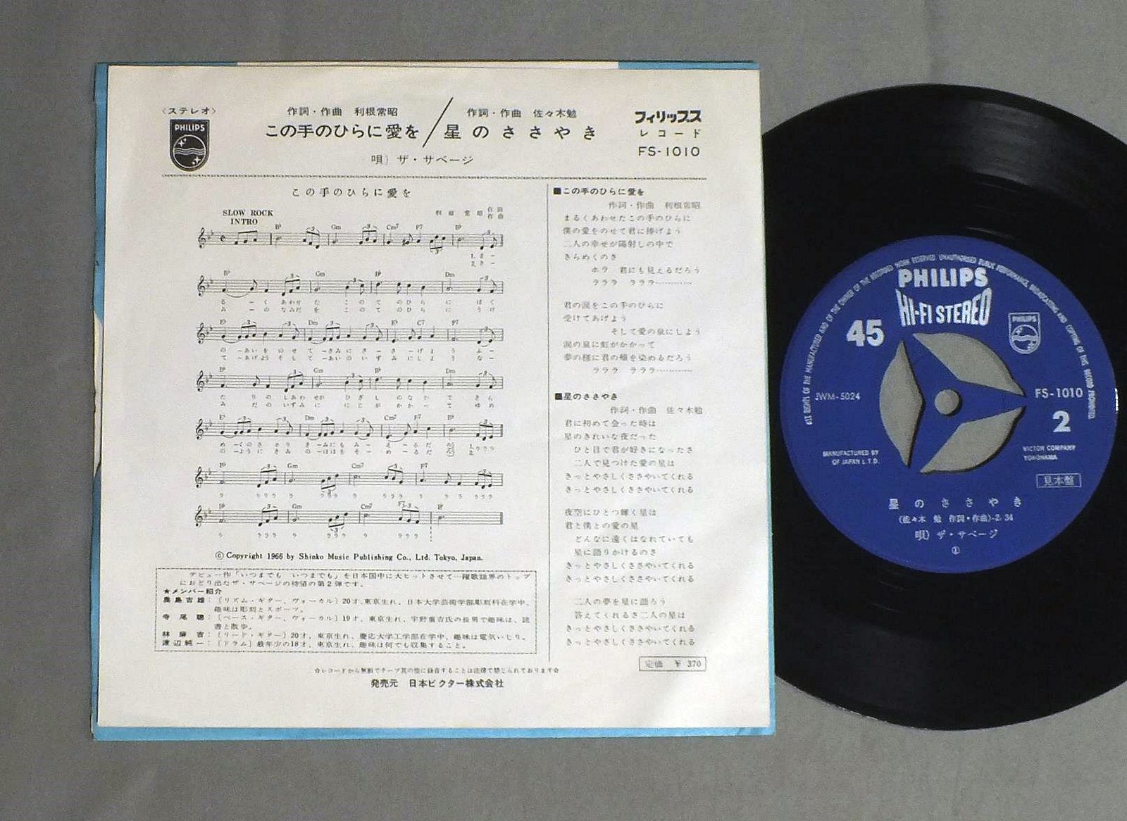 SAVAGEサベージ/KONO TENOHIRANI AIWOこの手のひらに愛を FS1010 製造国:日本盤 / Media:7inch外観:EX盤の状態:EX- 価格(税込):¥550(売約済) 送料 7inch:定形外郵便 360円~LP:定形外郵便 660円~送料は、注文の最終画面で確認頂けます。 > > SAVAGE/KONO TENOHIRANI AIWO 外観 (EX)特記事項:特記なし。外観EXの共通説明:ダメージが限定的。中古品としては保存状態がよい方。シミ、ヨゴレ、スレ 少し~軽度。 盤の状態 (EX-)特記事項:薄いスリキズ・細かい表面スレ軽くある感じ。全体的には殆どが軽微なものの様子です。盤EX-の共通説明:盤面のスリキズが多少有り。音に出そうなものは殆ど無いように見える~さほど気にならないぐらいの軽いプチ数カ所程度。 Tweet それぞれの画像をクリックすると、大きい写真が見られます こちらの商品もお勧めです 550円 TIGERSタイガース / 10 YEARS ROMANCE十年ロマンス 770円 TIGERSタイガース / TIGERS 1982タイガース 1982 1,320円 TAKESHI TERAUCHI & THE BUNNYS寺内タケシとザ・バニーズ / LET`S GO CLASSICSレッツ・ゴー運命 770円 YUZO KAYAMA加山雄三 / GOLDEN ALBUMゴールデン・アルバム(あなたと共に)赤盤 2,420円 OXオックス / TELL ME-OX ON STAGE No1テルミー-オックス・オン・ステージ No1 660円 YUZO KAYAMA加山雄三 / 15TH ANNIVERSARY加山雄三1976 武道館ライブ 1,210円 WILD ONES加瀬邦彦とワイルドワンズ / ON THE BEACH`82オン・ザ・ビーチ`82 770円 TIGERSタイガース / HUMAN RENASCENCEヒューマン・ルネッサンス