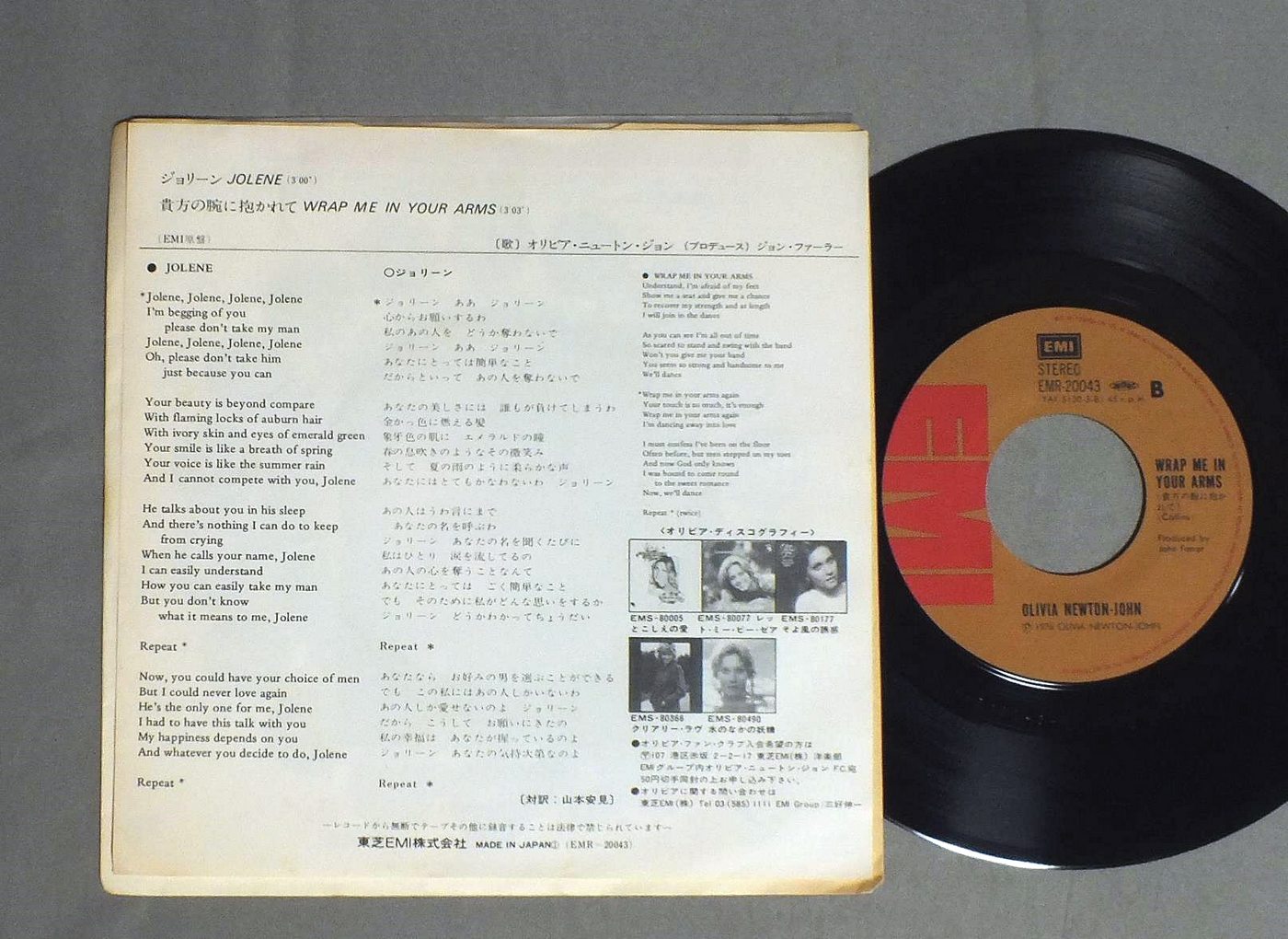 OLIVIA NEWTON-JOHNオリビア・ニュートン・ジョン/JOLENEジョリーン EMR20043 製造国:日本盤 / Media:7inch外観:EX盤の状態:EX+ 価格(税込):¥330 送料 7inch:定形外郵便 360円~LP:定形外郵便 660円~送料は、注文の最終画面で確認頂けます。 レコード検索 > 1980s–90s > OLIVIA NEWTON-JOHN/JOLENE 外観 (EX)特記事項:ヨレ有り。外観EXの共通説明:ダメージが限定的。中古品としては保存状態がよい方。シミ、ヨゴレ、スレ 少し~軽度。 盤の状態 (EX+)特記事項:極薄いスリキズ・スレ少し。一見してきれいな状態です。盤EX+の共通説明:盤面の極薄いスリキズ、スレ少し程度 音に出そうなものは無いように見える(極軽微なソフトティック音は除く)。 Tweet それぞれの画像をクリックすると、大きい写真が見られます こちらの商品もお勧めです 1,320円 PAT BENATARパット・べネター / LIVE FROM EARTHライブ・フロム・アース 1,320円 OLIVIA NEWTON-JOHNオリビア・ニュートン・ジョン / PHYSICAL虹色の扉 1,320円 MADONNAマドンナ / LIKE A VIRGINライク・ア・ヴァージン 990円 VERONIQUE SANSONヴェロニック・サンソン / LIVE AT THE OLYMPIAライヴ・アット・オランピア 1,980円 ELEN FOLEYエレン・フォーリー / SPIRIT OF ST LOUIS悲しみのシアター 770円 OLIVIA NEWTON-JOHNオリビア・ニュートン・ジョン / DON`T STOP BELIEVIN`黄昏の恋 770円 VIKKI CARRヴィッキー・カー / LIVE AT THE GREEK THEATREグリーク・シアターのヴィッキー・カー 440円 MARILYN MARTINマリリン・マーティン / MARILYN MARTINマリリン・マーティン