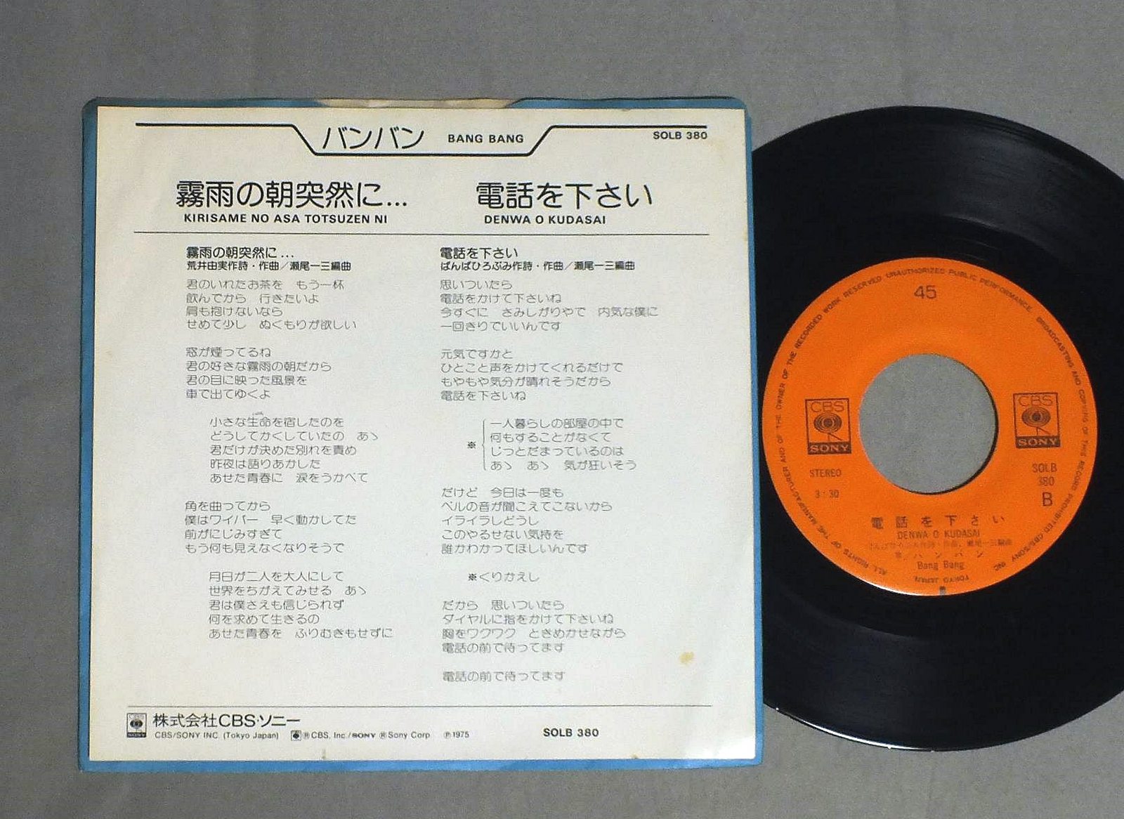 BANG BANGバンバン/KIRISAME NO ASA TOTSUZEN NI霧雨の朝突然に SOLB380 製造国:日本盤 / Media:7inch外観:EX盤の状態:EX 価格(税込):¥330 送料 7inch:定形外郵便 360円~LP:定形外郵便 660円~送料は、注文の最終画面で確認頂けます。 レコード検索 > J-POP > BANG BANG/KIRISAME NO ASA TOTSUZEN NI 外観 (EX)特記事項:特記なし。外観EXの共通説明:ダメージが限定的。中古品としては保存状態がよい方。シミ、ヨゴレ、スレ 少し~軽度。 盤の状態 (EX)特記事項:薄いスリキズ・スレ軽くある感じ。軽微なものの様子です。盤EXの共通説明:盤面のスリキズが薄いものが少し~軽度 音に出そうなものは無いように見える(軽微なソフトティック音は除く)。 Tweet それぞれの画像をクリックすると、大きい写真が見られます こちらの商品もお勧めです 990円 YUKO TOMITAとみたゆう子 / CLASSICAL HEARTクラシカル・ハート 1,210円 TAKURO YOSHIDAよしだたくろう / HELLO !元気です。 770円 YOSHIMI IWASAKI岩崎良美 / ATRIE+FREE 7inch心のアトリエ + シングルレコード 1,210円 TAKURO YOSHIDAよしだたくろう / ON STAGEオン・ステージ - ともだち 660円 MASAMICHI SUGI杉真理 / MISTONEミストーン 1,210円 YUMI MATSUTOYA松任谷由実 / DA/DI/DAダ・ディ・ダ 770円 EMU絵夢 / EMU 2絵夢 II 1,210円 YOUSUI INOUE井上陽水 / SHOW WITHOUT INVITATION招待状のないショー。