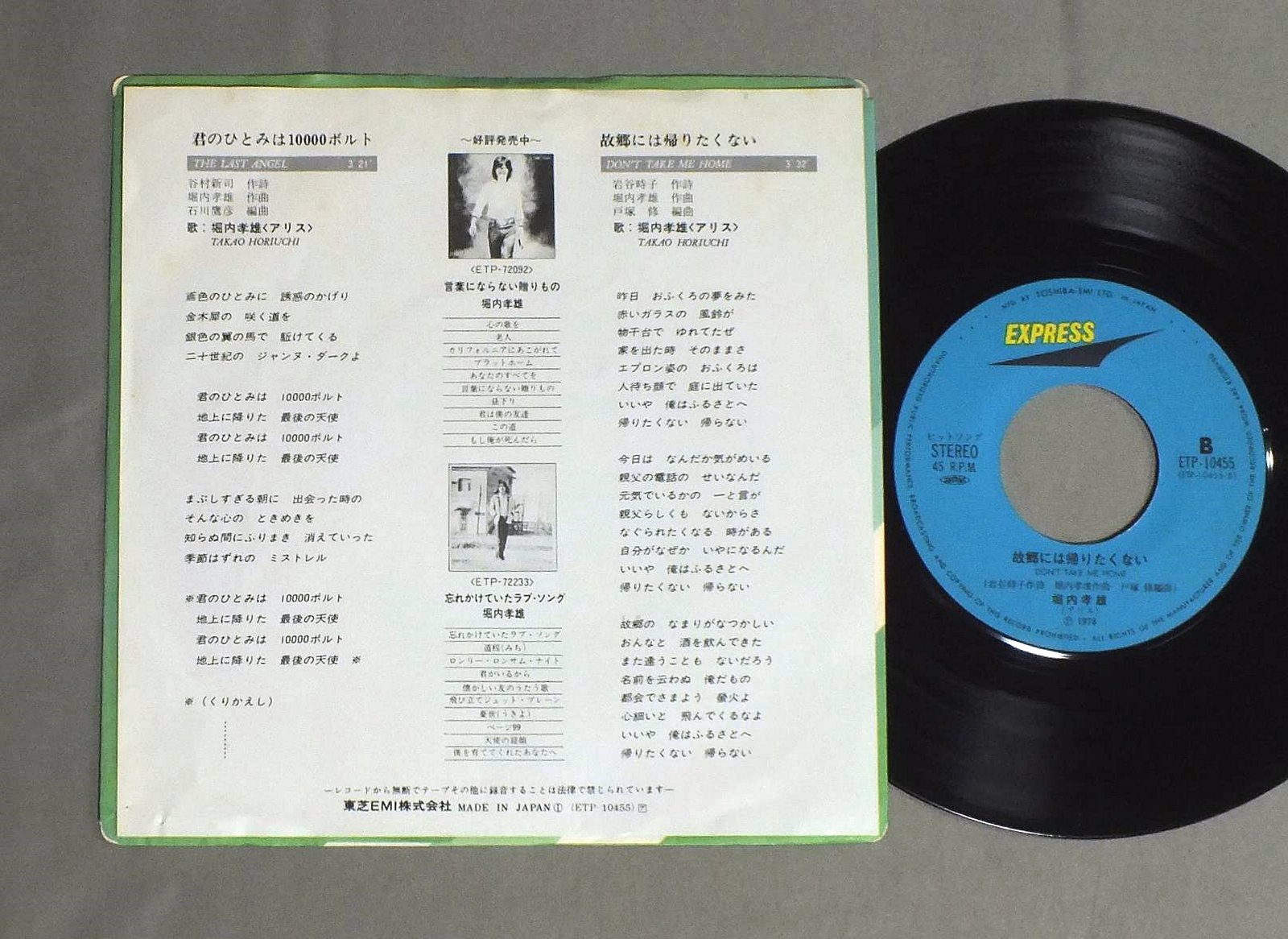 TAKAO HORIUCHI堀内孝雄(アリス)/LAST ANGEL君のひとみは10000ボルト ETP10455 製造国:日本盤 / Media:7inch外観:EX盤の状態:EX 価格(税込):¥330 送料 7inch:定形外郵便 360円~LP:定形外郵便 660円~送料は、注文の最終画面で確認頂けます。 レコード検索 > JAZZ > TAKAO HORIUCHI/LAST ANGEL 外観 (EX)特記事項:右下にホチキス跡。ヨレ有り。外観EXの共通説明:ダメージが限定的。中古品としては保存状態がよい方。シミ、ヨゴレ、スレ 少し~軽度。 盤の状態 (EX)特記事項:薄いスリキズ・スレ軽くある感じ。殆どが軽微なものの様子です。盤EXの共通説明:盤面のスリキズが薄いものが少し~軽度 音に出そうなものは無いように見える(軽微なソフトティック音は除く)。 Tweet それぞれの画像をクリックすると、大きい写真が見られます こちらの商品もお勧めです 1,540円 AKIO DOBASHI土橋安騎夫 / CHRONICLESクロニクルズ 990円 SQUAREスクェア / ADVENTURESアドヴェンチャー 880円 MAYUMI ITSUWA五輪真弓 / MY SONGSさよならだけは言わないで 1,210円 EIKICHI YAZAWA矢沢永吉 / RISING SUNライジング・サン 770円 MAYO SHOHNO庄野真代 / LAST SHOWラスト・ショー 1,320円 RUMIKO KOYANAGI小柳ルミ子 / HARU NO OTOZURE春のおとずれ 770円 KOICHI MORITA & TOP GALLANTS`森田公一とトップギャラン / BEST HITSヒット全曲集 1,650円 TAKAYUKI INOUE井上堯之 / DON`T DRINK THE WATER WATER MIND 2ドント・ドリンク・ザ・ウォーター(ウォーター・マインド2)