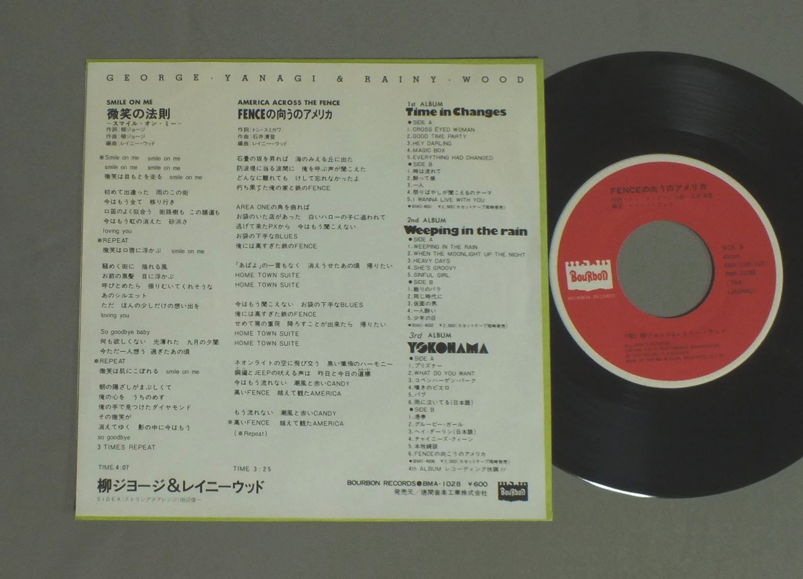 YANAGI GEORGE & RAINY WOOD柳ジョージ&レイニー・ウッド/SMILE ON MEスマイル・オン・ミー 微笑の法則 BMA1028 製造国:日本盤 / Media:7inch外観:EX盤の状態:EX 価格(税込):¥330 送料 7inch:定形外郵便 360円~LP:定形外郵便 660円~送料は、注文の最終画面で確認頂けます。 レコード検索 > CLASSIC ORCH. > YANAGI GEORGE & RAINY WOOD/SMILE ON ME 外観 (EX)特記事項:特記なし。外観EXの共通説明:ダメージが限定的。中古品としては保存状態がよい方。シミ、ヨゴレ、スレ 少し~軽度。 盤の状態 (EX)特記事項:薄いスリキズ・スレ軽くある感じ。軽微なものの様子です。盤EXの共通説明:盤面のスリキズが薄いものが少し~軽度 音に出そうなものは無いように見える(軽微なソフトティック音は除く)。 Tweet それぞれの画像をクリックすると、大きい写真が見られます こちらの商品もお勧めです 770円 EMU絵夢 / EMU 2絵夢 II 1,210円 PEDRO & CAPRICIOUSペドロ &カプリシャス / BEST ALBUMスター・ベスト・ヒット・コレクション 770円 5 BALLOONS五つの赤い風船 / GAME OVERゲームは終わり 660円 KENICHI HAGIWARA萩原健一 / NADJAナジャ 770円 TAKURO YOSHIDAよしだたくろう / HELLO! I`M TAKURO YOSHIDA元気です。 990円 MOTOHARU SANO佐野元春 / VISITORS 770円 YUZO KAYAMA加山雄三 / ALL ABOUT YUZO KAYAMA VOL2加山雄三の全て第2集 2,200円 HIKASUEヒカシュー / SUMMER夏