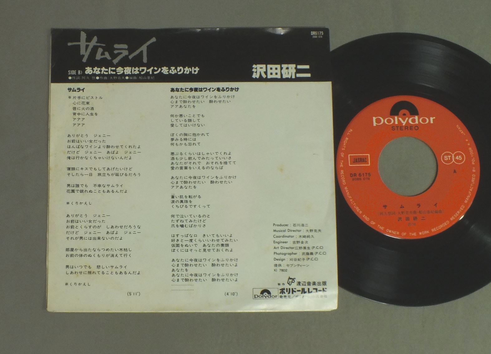 KENJI SAWADA沢田研二/SAMURAIサムライ DR6175 製造国:日本盤 / Media:7inch外観:EX盤の状態:EX- 価格(税込):¥330 送料 7inch:定形外郵便 360円~LP:定形外郵便 660円~送料は、注文の最終画面で確認頂けます。 > > KENJI SAWADA/SAMURAI 外観 (EX)特記事項:特記なし。外観EXの共通説明:ダメージが限定的。中古品としては保存状態がよい方。シミ、ヨゴレ、スレ 少し~軽度。 盤の状態 (EX-)特記事項:薄いスリキズ・細かい表面スレ軽くある感じ。全体的には殆どが軽微なものの様子です。盤EX-の共通説明:盤面のスリキズが多少有り。音に出そうなものは殆ど無いように見える~さほど気にならないぐらいの軽いプチ数カ所程度。 Tweet それぞれの画像をクリックすると、大きい写真が見られます こちらの商品もお勧めです 1,650円 TAKAYUKI INOUE井上堯之 / WATER MINDウォーター・マインド 660円 TOMOKAZU MIURA三浦友和 / AND FRIENDS文化放送 三浦友和と仲間たち 赤頭巾ちゃん秘密だよ 880円 YOUSUI INOUE井上陽水 / NO INVITATION SHOW招待状のないショー 1,210円 PEDRO & CAPRICIOUSペドロ&カプリシャス / お気に召すまま 770円 YOSHITAROU KANAZAKI加奈崎芳太郎 (古井戸) / AIGA MOSHI SUBETENARA愛がもしすべてなら 770円 TULIPチューリップ / BOKU GATSUKUTTA AINO UTAぼくがつくった愛のうた 770円 `SHOW` AIKAWA哀川翔 / ANTITHESE TRAIN ANTITHESE FLIGHTアンチテーゼ・トレイン アンチテーゼフライト 2,200円 TERUHIKO SAIGO西郷輝彦 / HIT PARADOヒット・パレード 君だけを