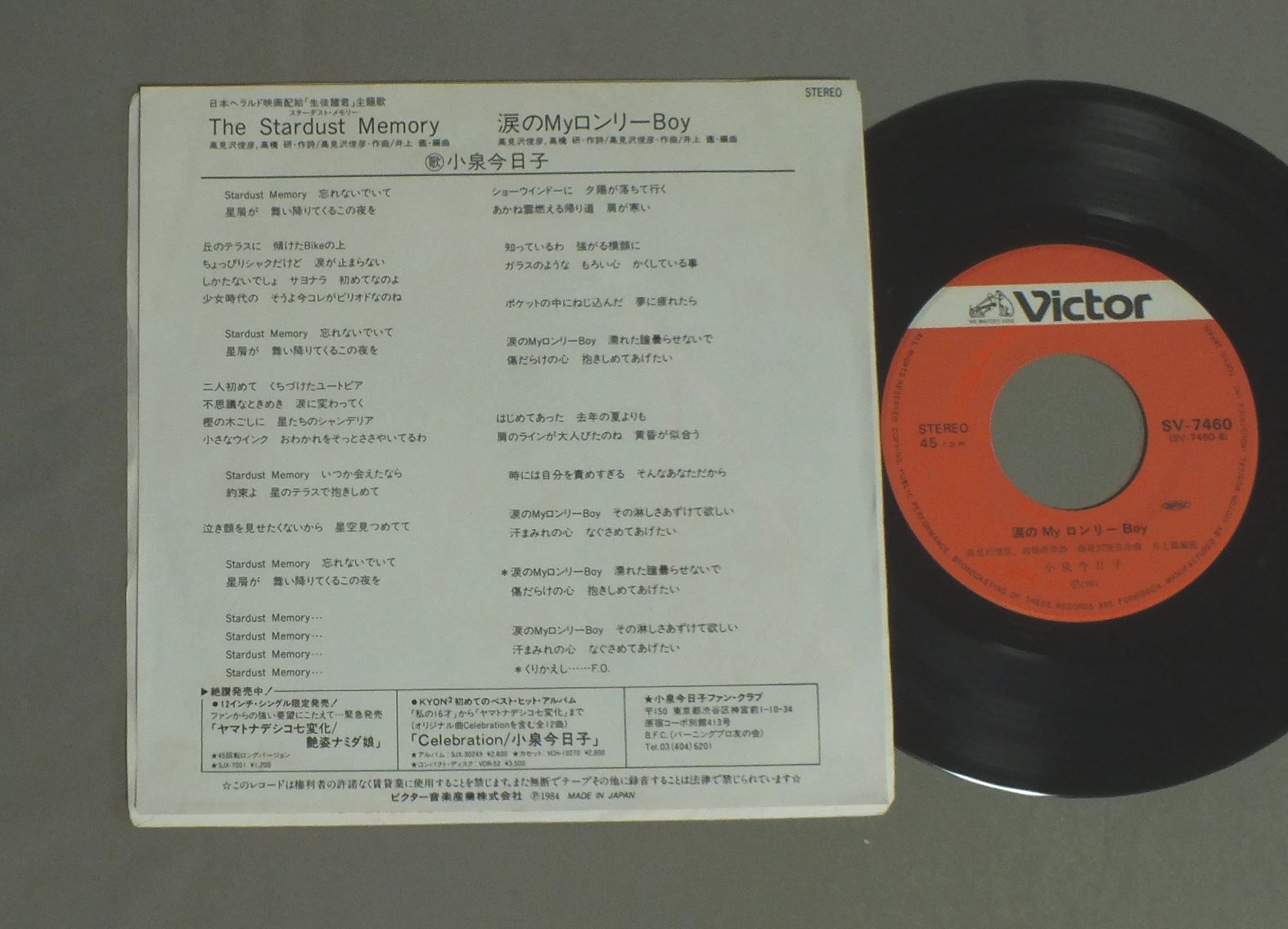 KYOUKO KOIZUMI小泉今日子/STARDUST MEMORYスター・ダスト・メモリー SV7460 製造国:日本盤 / Media:7inch外観:EX盤の状態:EX 価格(税込):¥330 送料 7inch:定形外郵便 360円~LP:定形外郵便 660円~送料は、注文の最終画面で確認頂けます。 レコード検索 > J-POP > KYOUKO KOIZUMI/STARDUST MEMORY 外観 (EX)特記事項:特記なし。外観EXの共通説明:ダメージが限定的。中古品としては保存状態がよい方。シミ、ヨゴレ、スレ 少し~軽度。 盤の状態 (EX)特記事項:薄いスリキズ・スレ軽くある感じ。軽微なものの様子です。盤EXの共通説明:盤面のスリキズが薄いものが少し~軽度 音に出そうなものは無いように見える(軽微なソフトティック音は除く)。 Tweet それぞれの画像をクリックすると、大きい写真が見られます こちらの商品もお勧めです 770円 NAOKO KAWAI河合奈保子 / STARDUST GARDEN千年庭園 880円 MAKO ISHINO石野真子 / MAKO2 1,210円 NAOKO KAWAI河合奈保子 / DIARYダイアリー 770円 SHOKO SAWADA沢田聖子 / POTENTIALポテンシャル 770円 YUKO ISHIKAWA石川優子 / REN`AI-KODOKU-JIN恋愛孤独人 1,210円 SONOKO KAWAI河合その子 / SIESTAシエスタ 880円 SEIKO MATSUDA松田聖子 / MORNING SHOWER映画 プルメリアの伝説 1,320円 MIKI ASAKURA麻倉未稀 / LOVE AGAIN