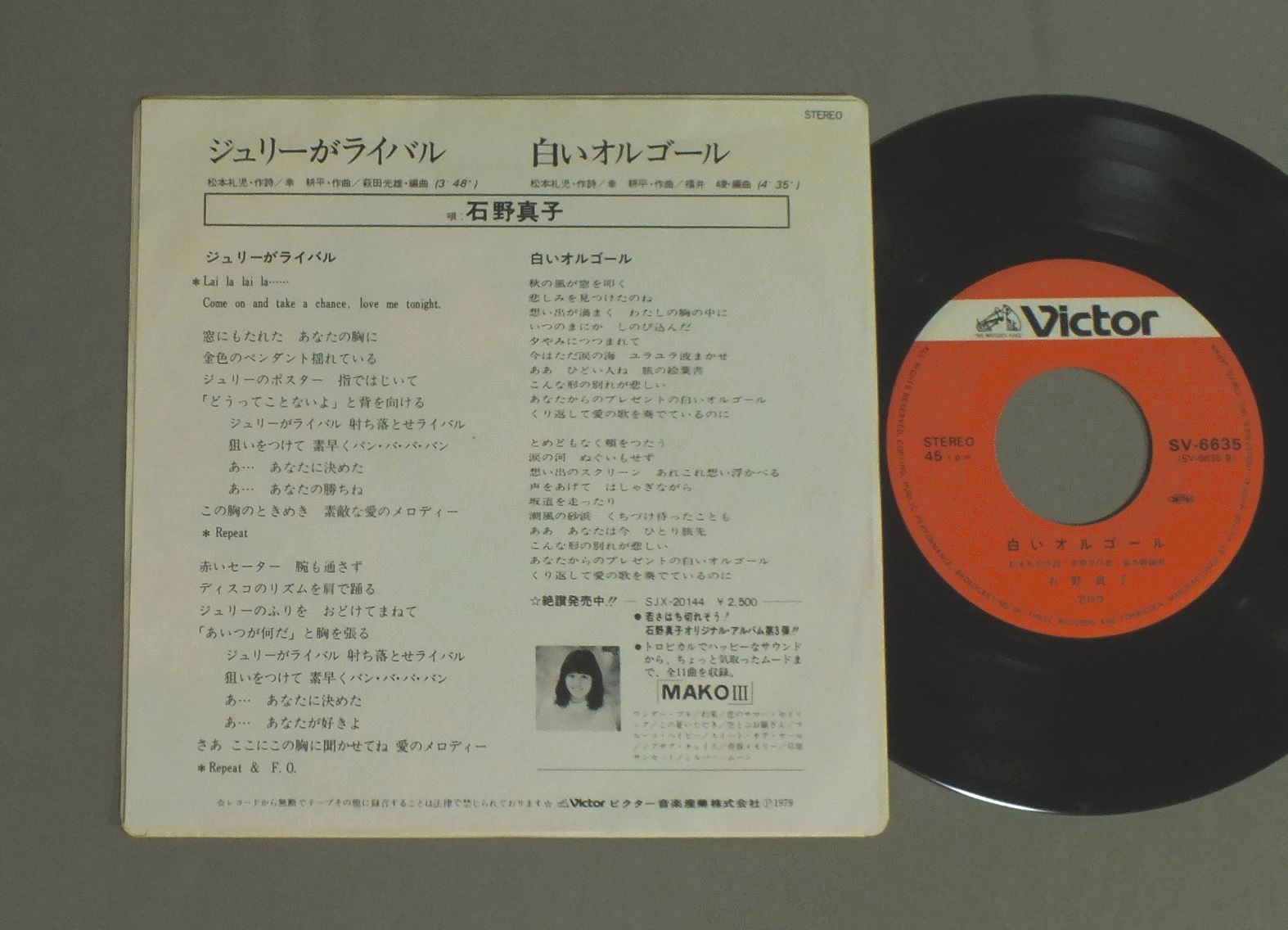 MAKO ISHINO石野真子/JYULY GA RIVALジュリーがライバル SV6635 製造国:日本盤 / Media:7inch外観:EX盤の状態:EX 価格(税込):¥330 送料 7inch:定形外郵便 360円~LP:定形外郵便 660円~送料は、注文の最終画面で確認頂けます。 > > MAKO ISHINO/JYULY GA RIVAL 外観 (EX)特記事項:特記なし。外観EXの共通説明:ダメージが限定的。中古品としては保存状態がよい方。シミ、ヨゴレ、スレ 少し~軽度。 盤の状態 (EX)特記事項:薄いスリキズ・スレ軽くある感じ。軽微なものの様子です。盤EXの共通説明:盤面のスリキズが薄いものが少し~軽度 音に出そうなものは無いように見える(軽微なソフトティック音は除く)。 Tweet それぞれの画像をクリックすると、大きい写真が見られます こちらの商品もお勧めです 770円 ERI NITTA新田恵利 / E-AREA 770円 SHOKO SAWADA沢田聖子 / KAZEN NO YOKAN風の予感 770円 NAOKO KAWAI河合奈保子 / LOVEラブ 880円 MAKO ISHINO石野真子 / HOHOEMI微笑 550円 ONYANKO CLUBおニャン子クラブ / KICK OFFキックオフ 880円 SEIKO MATSUDA松田聖子 / WINDY SHADOW 880円 SONOKO KAWAI河合その子 / SONOKOその子 880円 SEIKO MATSUDA松田聖子 / MORNING SHOWER映画 プルメリアの伝説
