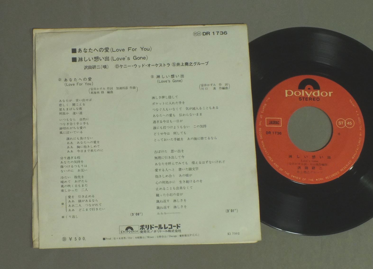 KENJI SAWADA沢田研二/LOVE FOR YOUあなたへの愛 DR1736 製造国:日本盤 / Media:7inch外観:EX盤の状態:EX- 価格(税込):¥330 送料 7inch:定形外郵便 360円~LP:定形外郵便 660円~送料は、注文の最終画面で確認頂けます。 > > KENJI SAWADA/LOVE FOR YOU 外観 (EX)特記事項:右下にホチキス跡。ヨレ有り。外観EXの共通説明:ダメージが限定的。中古品としては保存状態がよい方。シミ、ヨゴレ、スレ 少し~軽度。 盤の状態 (EX-)特記事項:薄いスリキズ・細かい表面スレ軽くある感じ。全体的には殆どが軽微なものの様子です。盤EX-の共通説明:盤面のスリキズが多少有り。音に出そうなものは殆ど無いように見える~さほど気にならないぐらいの軽いプチ数カ所程度。 Tweet それぞれの画像をクリックすると、大きい写真が見られます こちらの商品もお勧めです 990円 YUKO TOMITAとみたゆう子 / TIMEタイム 770円 MAYO SHOHNO庄野真代 / LAST SHOWラスト・ショー 770円 SNAKEMAN SHOWスネークマン・ショー / SNAKEMAN SHOW-NO MORE FIGHTスネークマン・ショー-戦争反対 770円 CHAGE & ASUKAチャゲ&飛鳥 / 4th ALBUN 21 CENTURY21世紀 880円 MASA TAKAGI高木麻早 / 1st ALBUM高木麻早 1,320円 DARK DUCKSダーク・ダックス / FOLK ALBUM AUTOGRAPHEDフォーク思考(サイン付) 770円 HIROMI IWASAKI岩崎宏美 / HIKOUSEN飛行船 770円 KENJI SAWADA沢田研二 / OMOIKKIRI KIZANA JINSEI思いきり気障な人生