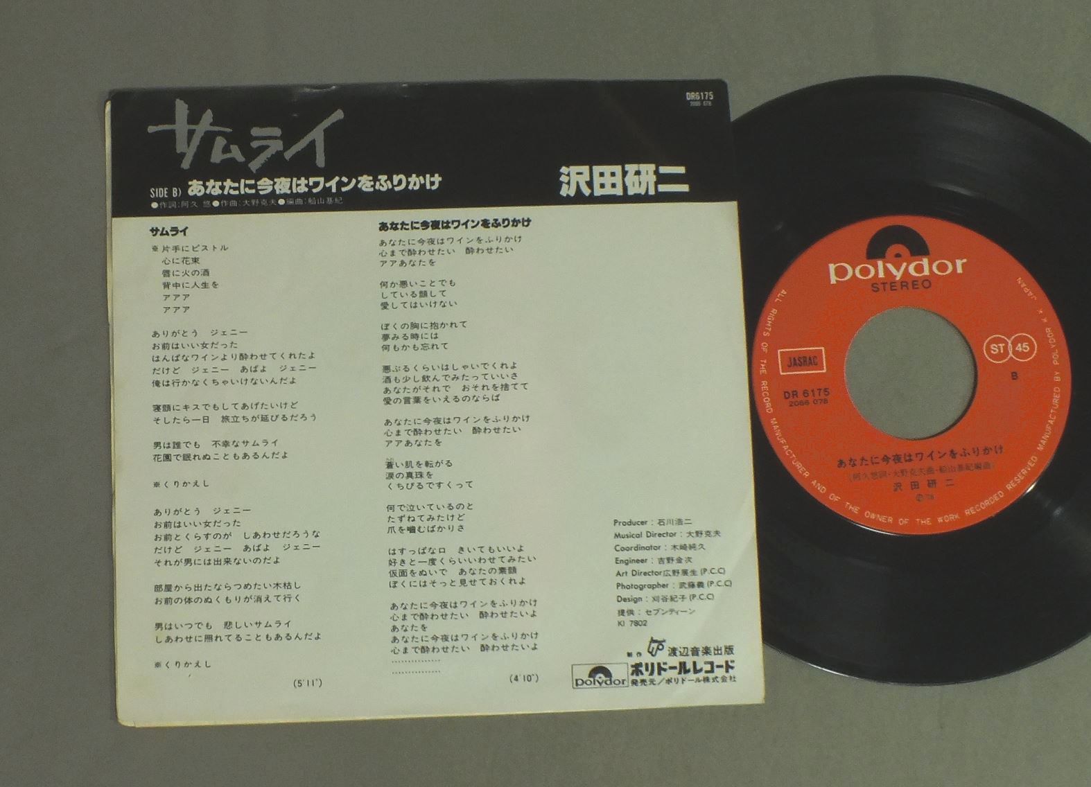 KENJI SAWADA沢田研二/SAMURAIサムライ DR6175 製造国:日本盤 / Media:7inch外観:EX盤の状態:EX 価格(税込):¥330 送料 7inch:定形外郵便 360円~LP:定形外郵便 660円~送料は、注文の最終画面で確認頂けます。 > > KENJI SAWADA/SAMURAI 外観 (EX)特記事項:右下にホチキス跡。ヨレ有り。外観EXの共通説明:ダメージが限定的。中古品としては保存状態がよい方。シミ、ヨゴレ、スレ 少し~軽度。 盤の状態 (EX)特記事項:薄いスリキズ・スレ軽くある感じ。殆どが軽微なものの様子です。盤EXの共通説明:盤面のスリキズが薄いものが少し~軽度 音に出そうなものは無いように見える(軽微なソフトティック音は除く)。 Tweet それぞれの画像をクリックすると、大きい写真が見られます こちらの商品もお勧めです 990円 MIZUKI OHURA大浦みずき / NIGHT & DAYナイト&デイ 1,210円 TULIPチューリップ / 10TH ODYSSEY 770円 CANDIESキャンディーズ / CANDIESキャンディーズ 990円 DR. RIVERBEACH & HIS ORCHESTRA / GOOD-BYE SONG BOOK 1,650円 TAKUROU YOSHIDA吉田拓郎 / IN BUDOKAN王様達のハイキング IN BUDOKAN 770円 BOBBY OKAMOTO & THE INDIAN SUMMERボビー岡本&インディアン・サマー / INDIAN SUMMERインディアン・サマー 990円 TADUMI TOYOSHIUMA豊島たづみ / STILL NIGHT 990円 MASAAKI SAKAI堺正章 / SOLITUDEひとりぼっちのマチャアキ