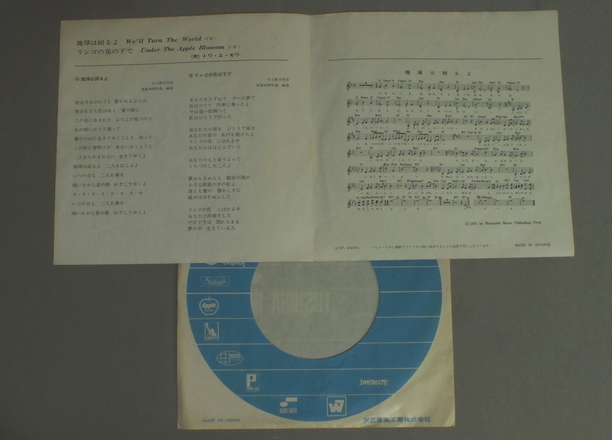 TOI ET MOIトワ・エ・モワ/WE`LL TURN THE WORLD地球は回るよ LTP2400 製造国:日本盤 / Media:7inch外観:EX-盤の状態:EX 価格(税込):¥330 送料 7inch:定形外郵便 360円~LP:定形外郵便 660円~送料は、注文の最終画面で確認頂けます。 > > TOI ET MOI/WE`LL TURN THE WORLD 外観 (EX-)特記事項:ヨレ有り。外観EX-の共通説明:ダメージ軽度~多少。 中古品としては普通の状態。シミ、ヨゴレ、スレなど軽く~多少。 盤の状態 (EX)特記事項:薄いスリキズ・スレ軽くある感じ。殆どが軽微なものの様子です。盤EXの共通説明:盤面のスリキズが薄いものが少し~軽度 音に出そうなものは無いように見える(軽微なソフトティック音は除く)。 Tweet それぞれの画像をクリックすると、大きい写真が見られます こちらの商品もお勧めです 1,210円 SUMIKO YAMAGATAやまがたすみこ / SUMIKO LIVE 2,200円 71 ALL JAPAN FOLK JAMBOREE岡林信康・五つの赤い風船 / LIVE VOL271年全日本フォーク・ジャンボリーVOL2 1,320円 SHIGERU IZUMIYA泉谷しげる / 3rd ALBUM第三集 地球はお祭りさわぎ 770円 TAKASHI NISHIOKA西岡たかし / SOUPスープ 770円 NOBUYASU OKABAYASHI岡林信康 / SERENADEセレナーデ 1,320円 NEKO猫 / NEKO猫 880円 N.S.P.ニュー・サディスティック・ピンク / N.S.P. 3N.S.P. ? ひとやすみ 1,210円 NOBUYASU OKABAYASHI岡林信康 / OOINARU ISAN大いなる遺産