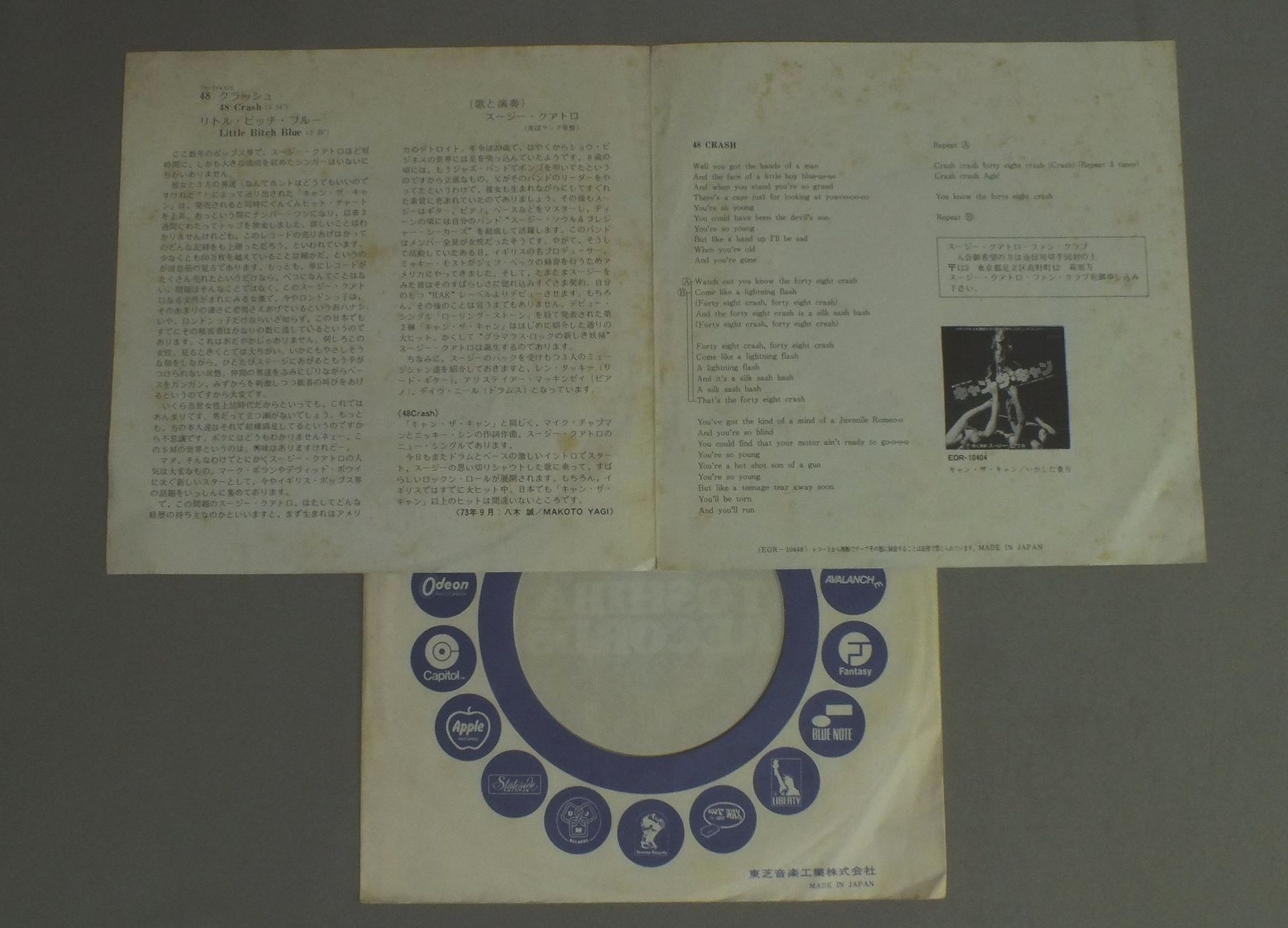 SUZI QUATROスージー・クアトロ/48 CRASH48 クラッシュ EOR10448 製造国:日本盤 / Media:7inch外観:VG+盤の状態:EX 価格(税込):¥330 送料 7inch:定形外郵便 360円~LP:定形外郵便 660円~送料は、注文の最終画面で確認頂けます。 > > SUZI QUATRO/48 CRASH 外観 (VG+)特記事項:背下に破れ。ヨレやシミ有り。外観VG+の共通説明:ダメージやや有り。シミ、ヨゴレ、スレなど多少~やや多め。 盤の状態 (EX)特記事項:薄いスリキズ・スレ軽くある感じ。殆どが軽微なものの様子です。盤EXの共通説明:盤面のスリキズが薄いものが少し~軽度 音に出そうなものは無いように見える(軽微なソフトティック音は除く)。 Tweet それぞれの画像をクリックすると、大きい写真が見られます こちらの商品もお勧めです 880円 DOOBIE BROTHERSドゥービー・ブラザーズ / LIVIN` ON THE FAULT LINE運命の掟 1,650円 SERGIO MENDES & BRAZIL `66セルジオ・メンデスとブラジル66 / LOOK AROUNDルック・アラウンド 770円 STYXスティクス / CORNERSTONEコーナーストーン 770円 JEFFERSON AIRPLANEジェファーソン・エアプレーン / BLESS ITS POINTED LITTLE HEADフィルモアのジェファーソン・エアプレーン 1,210円 5TH DIMENSIONフィフス・ディメンソン / THE BESTフィフス・ディメンソン 440円 J.GEILS BANDJ.ガイルズ・バンド / SANCTUARY.サンクチュアリー(禁猟区) 1,650円 STYXスティクス / PARADISE THEATREパラダイス・シアター 1,320円 CHASEチェイス / CHASE QUADRAPHONIC追跡 4チャンネル盤