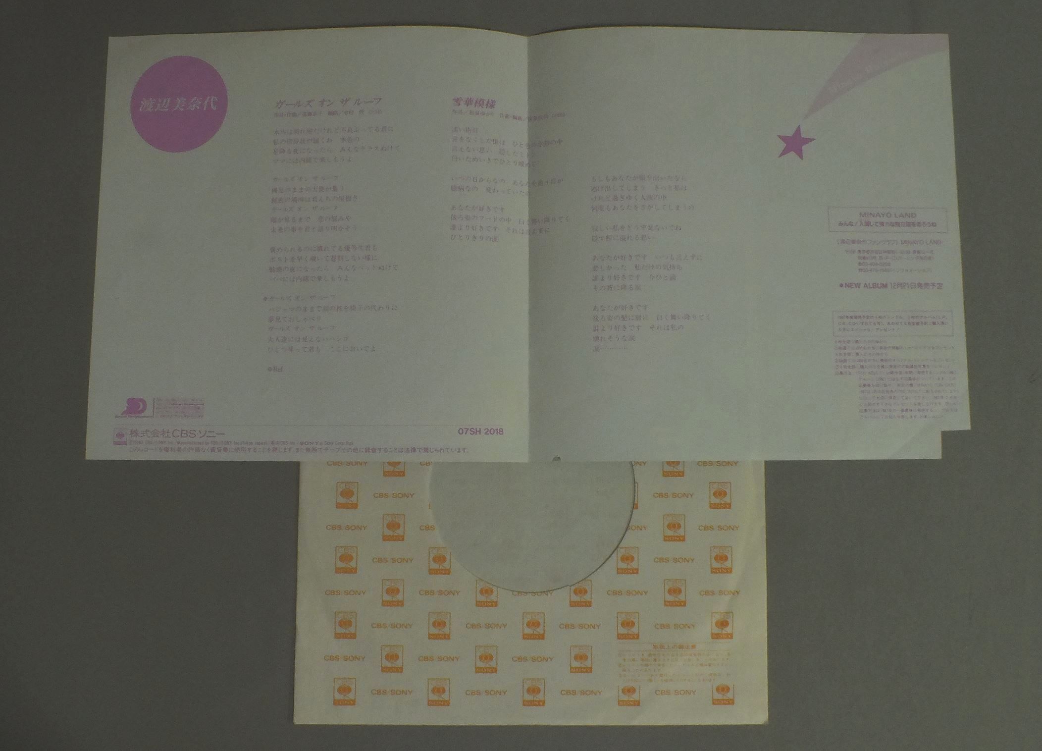 MINAYO WATANABE渡辺美奈代/GIRLS ON THE ROOFガールズ・オン・ザ・ルーフ 07SH2018 製造国:日本盤 / Media:7inch外観:VG+盤の状態:EX 価格(税込):¥330 送料 7inch:定形外郵便 360円~LP:定形外郵便 660円~送料は、注文の最終画面で確認頂けます。 レコード検索 > J-POP > MINAYO WATANABE/GIRLS ON THE ROOF 外観 (VG+)特記事項:裏側に切り取り有り。外観VG+の共通説明:ダメージやや有り。シミ、ヨゴレ、スレなど多少~やや多め。 盤の状態 (EX)特記事項:薄いスリキズ・スレ軽くある感じ。軽微なものの様子です。盤EXの共通説明:盤面のスリキズが薄いものが少し~軽度 音に出そうなものは無いように見える(軽微なソフトティック音は除く)。 Tweet それぞれの画像をクリックすると、大きい写真が見られます こちらの商品もお勧めです 990円 SONOKO KAWAI河合その子 / SIESTAシエスタ 770円 TOMOYO HARADA原田知世 / NADESHIKO JUNJO撫子純情(なでしこじゅんじょう)-拾七歳バースデイ・アルバム 1,210円 AKINA NAKAMORI中森明菜 / SILENT LOVE 440円 ERI E-AREA新田恵利 / ERI E-AREA 1,320円 MIKI ASAKURA麻倉未稀 / SEXY ELEGANCEセクシー・エレガント 770円 ERI NITTA新田恵利 / ERI 880円 SONOKO KAWAI河合その子 / SONOKOその子 770円 SHOKO SAWADA沢田聖子 / 1st ALBUM坂道の少女