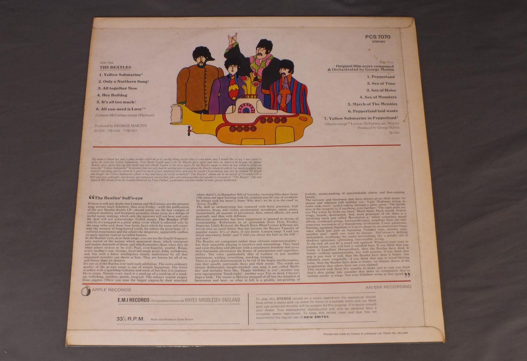 BEATLES/YELLO SUBMARINE PCS7070 製造国:英国盤 / Media:LPMatrix: -3/1/GO | -1/4/PG外観:EX盤の状態:EX 価格(税込):¥22,000(売約済) 送料 7inch:定形外郵便 360円~LP:定形外郵便 660円~送料は、注文の最終画面で確認頂けます。 > > BEATLES/YELLO SUBMARINE 外観 (EX)特記事項:背にコーティングの浮きと焼け有り。表ジャケはコーティングのヨレシワやスレ、スリキズは少ない印象。裏ジャケもよごれは少ない感じです。外観EXの共通説明:ダメージが限定的。中古品としては保存状態がよい方。シミ、ヨゴレ、スレ 少し~軽度。 盤の状態 (EX)特記事項:薄いスリキズ・スレ少しある程度。音に出そうなものもなく一見してきれいな状態です。曲間など、静かなところを中心に聴いて見ましたが、チリノイズ少ないきれいな再生具合でした。盤EXの共通説明:盤面のスリキズが薄いものが少し~軽度 音に出そうなものは無いように見える(軽微なソフトティック音は除く)。 Tweet それぞれの画像をクリックすると、大きい写真が見られます こちらの商品もお勧めです 5,500円 GEORGE HARRISON / THIRTY THREE & 1/3 5,500円 GEORGE HARRISON / LIVING IN THE MATERIAL WORLD 5,500円 BEATLES / AT THE HOLLYWOOD BOWL 4,950円 JOHN & YOKO - PLASTIC ONO BANDF / SOME TIME IN NEW YORK CITY 5,500円 JOHN LENNON / SHAVED FISH
