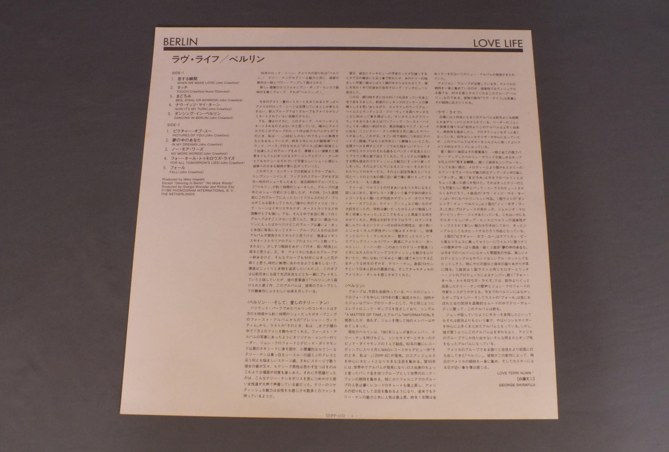 BERLINベルリン/LOVE LIFEラヴ・ライフ 25PP115 製造国:日本盤 / Media:LP外観:EX盤の状態:EX+帯:EX 価格(税込):¥3,144(売約済) 送料 7inch:定形外郵便 360円~LP:定形外郵便 660円~送料は、注文の最終画面で確認頂けます。 > > BERLIN/LOVE LIFE 外観 (EX)特記事項:特記なし。外観EXの共通説明:ダメージが限定的。中古品としては保存状態がよい方。シミ、ヨゴレ、スレ 少し~軽度。 盤の状態 (EX+)特記事項:極薄いスリキズ・スレ少し。一見してきれいな状態です。盤EX+の共通説明:盤面の極薄いスリキズ、スレ少し程度 音に出そうなものは無いように見える(極軽微なソフトティック音は除く)。 帯の状態 (EX):特記なし。 その他:見本盤 Tweet それぞれの画像をクリックすると、大きい写真が見られます こちらの商品もお勧めです 550円 HUNG CHUNGワン・チャン / HUNG CHUNGダンス・ホール・デイズ 770円 LOVERBOYラヴァーボーイ / KEEP IT UPホット・ガールズ 770円 CHEAP TRICKチープ・トリック / AT BUDOKANAT 武道館 1,320円 NENAネーナ / NENAロックバルーンは99 770円 MEN AT WORKメン・アット・ワーク / BUSINESS AS USUALワーク・ソングズ 1,320円 TAZMANIAN DEVILSタズマニアン・デヴィルズ / TAZMANIAN DEVILSアメリカン・ドリームを探して 550円 CORBIN HANNER BANDコーバン・ハナー・バンド / SON OF AMERICAサン・オブ・アメリカ 770円 CULTURE CLUBカルチャー・クラブ / WAR SONG戦争のうた