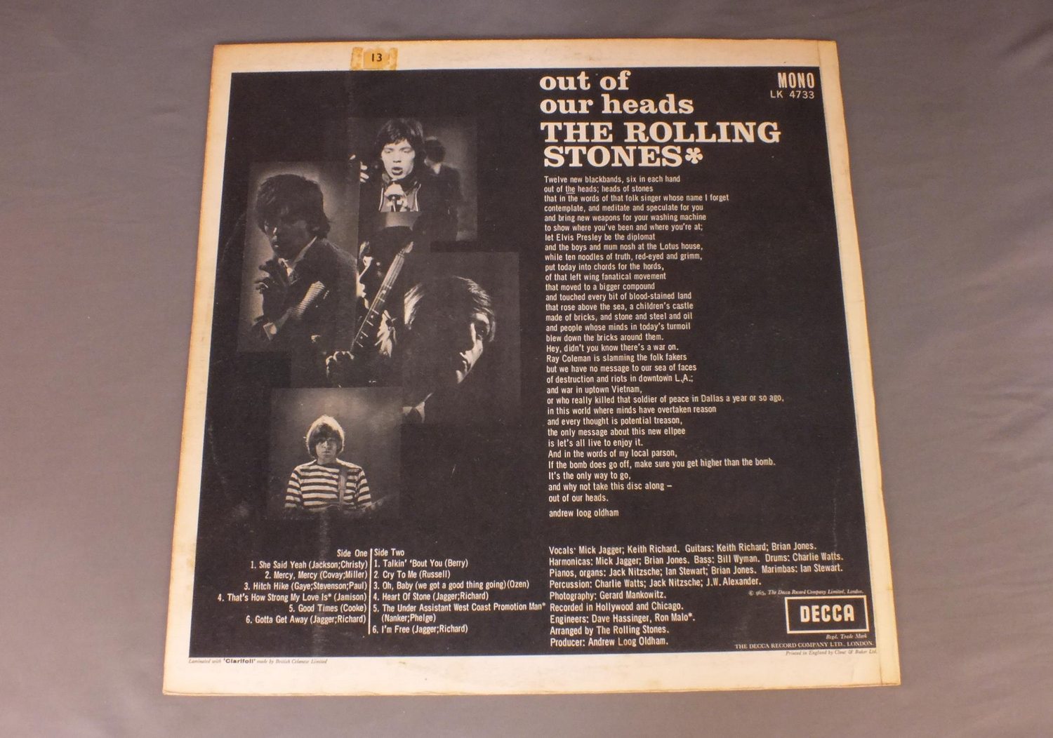 ROLLING STONES/OUR OF OUR HEADS MONO LK4733 製造国:英国盤 / Media:LPMatrix:11B 10A外観:EX盤の状態:EX 価格(税込):¥19,800(売約済) 送料 7inch:定形外郵便 360円~LP:定形外郵便 660円~送料は、注文の最終画面で確認頂けます。 > > ROLLING STONES/OUR OF OUR HEADS MONO 外観 (EX)特記事項:表ジャケは厚手のコーティング仕様で全体的にコーティングシワも少なめ。スレやスリキズ等も薄い感じです。裏ジャケ側にスレよごれ多少。外観EXの共通説明:ダメージが限定的。中古品としては保存状態がよい方。シミ、ヨゴレ、スレ 少し~軽度。 盤の状態 (EX)特記事項:薄いスリキズ・スレ軽く有る感じ。殆どが軽微なものの様子で、きれいな印象。曲間など、静かなところを中心に聴いて見ましたが、チリノイズ少ないきれいな再生具合でした。盤EXの共通説明:盤面のスリキズが薄いものが少し~軽度 音に出そうなものは無いように見える(軽微なソフトティック音は除く)。 Tweet それぞれの画像をクリックすると、大きい写真が見られます こちらの商品もお勧めです 2,750円 ROLLING STONES / EMOTIONAL RESCUE + POSTEREMOTIONAL RESCUE ポスター付