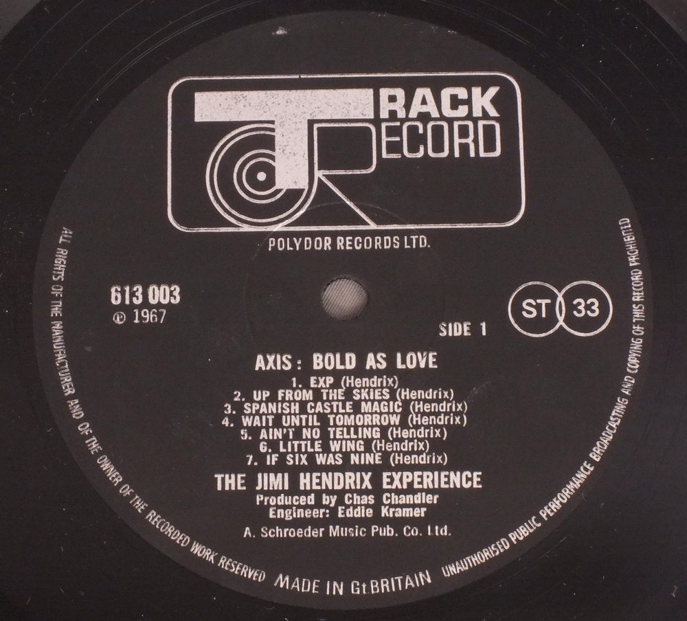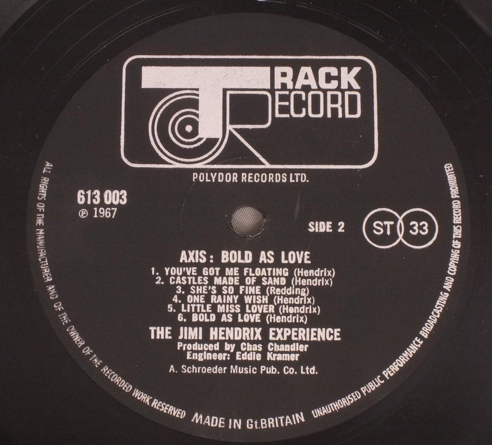 JIMI HENDRIX/AXIS:BOLD AS LOVE w/INSERT STEREO 613 003 製造国:英国盤 / Media:LPMatrix:A▽1 1 l / B▽1 l 12 外観:EX+盤の状態:EX 価格(税込):¥27,500(売約済) 送料 7inch:定形外郵便 360円~LP:定形外郵便 660円~送料は、注文の最終画面で確認頂けます。 > > JIMI HENDRIX/AXIS:BOLD AS LOVE w/INSERT STEREO 外観 (EX+)特記事項:全体的にスレやスリキズ、コーティングのヨレシワのほとんど無い大変きれいな状態。美品です。歌詞カードもほぼめくりシワ等無い大変きれいな状態です。外観EX+の共通説明:中古としては美品、一見してきれいでダメージが軽微。シミ、ヨゴレ、スレ有っても僅か~少し。 盤の状態 (EX)特記事項:薄いスリキズ・スレ少しある程度。音に出そうなものもなく一見してきれいな状態です。曲間など、静かなところを中心に聴いて見ましたが、音の薄いところで軽いスクラッチノイズ、全体的にチリプチ少なめで、クリアーに再生されています。盤EXの共通説明:盤面のスリキズが薄いものが少し~軽度 音に出そうなものは無いように見える(軽微なソフトティック音は除く)。 Tweet それぞれの画像をクリックすると、大きい写真が見られます こちらの商品もお勧めです 4,400円 JIMI HENDRIX / MIDNIGHT LIGHTNING