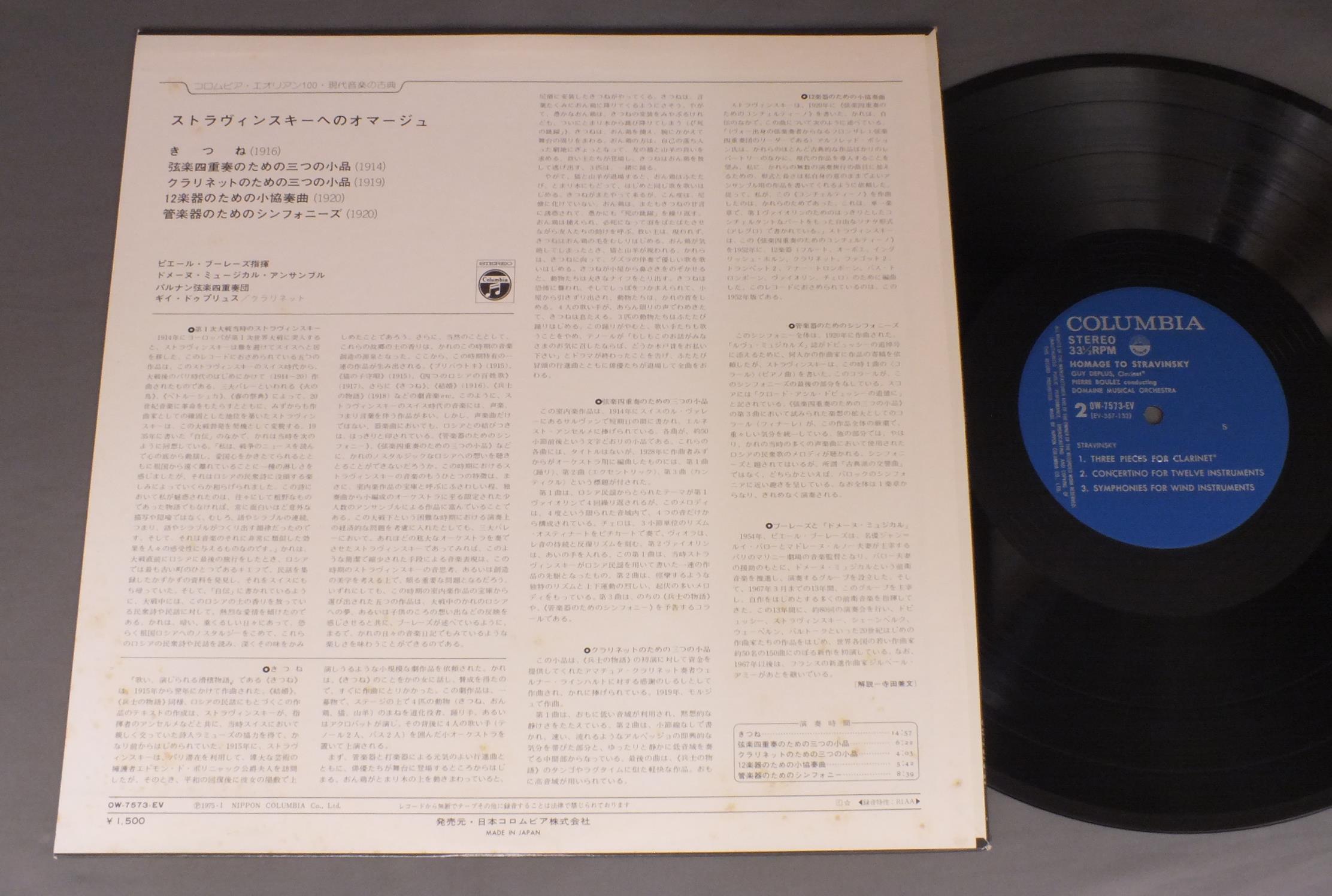 BOULEZブーレーズ/HOMAGE TO STRAVINSKYストラヴィンスキーへのオマージュ OW7573EV 製造国:日本盤 / Media:LP外観:EX-盤の状態:EX+ 価格(税込):¥990 送料 7inch:定形外郵便 360円~LP:定形外郵便 660円~送料は、注文の最終画面で確認頂けます。 レコード検索 > SWING/BIG BAND > BOULEZ/HOMAGE TO STRAVINSKY 外観 (EX-)特記事項:裏側にシミが少し。外観EX-の共通説明:ダメージ軽度~多少。 中古品としては普通の状態。シミ、ヨゴレ、スレなど軽く~多少。 盤の状態 (EX+)特記事項:極薄いスリキズ・スレ少し。一見してきれいな状態です。盤EX+の共通説明:盤面の極薄いスリキズ、スレ少し程度 音に出そうなものは無いように見える(極軽微なソフトティック音は除く)。 Tweet それぞれの画像をクリックすると、大きい写真が見られます こちらの商品もお勧めです 1,430円 TADASHI MORI etc森正 他 / MINAO SHIBATA/KATSUE KITAZONO`S SURREALISTIC VERSES柴田南雄/北園克衛の三つの詩 他 1,540円 ENSEMBLE 14 BADEN-BADEN-REICHERTバーデン・バーデン合奏団-ライヒェルト / HINDEMITH-DIE 3 KAMMERMUSIKENヒンデミット-室内管弦楽のための音楽 1,540円 HAITINKハイティンク / BRITTEN-THE YOUNG PERSON`S GUIDE TO THE ORCH.ブリテン-青少年の管弦楽入門-シンプル・シンフォニー 2,200円 ALBAN BERG QUARTETT. WIENウィーン・アルバン・ベルク弦楽四重奏団 / ALBAN BERG-STREICHQUARTETT OP3アルバン・ベルク- 作品3-弦楽四重奏のための抒情組曲 990円 S. YAMAOKA山岡重信 / TONE POEM MANDARA NO HANA-HISATADA OTAKA JAPANESE SUITE現代の日本の音楽名盤1500シリーズ 山田耕筰 - 音詩「曼陀羅の華」 尾高尚忠 - 日本組曲 平尾貴四男 - 交響詩曲「砧」 深井史郎 - パロディ的な4楽章 1,430円 GAWRILOFF/DEINZERコンタルスキー ガヴリロフ他 / MESSIAEN - QUATUOR POUR LA FIN DU TEMPSメシアン - 世の終わりのための四重奏曲 990円 SHIGENOBU YAMAOKA山岡重信 / MUSIC OF RYOHEI HIROSE廣瀬量平の音楽 990円 SODERSTROM-WINBERGH-WESTERBERGセーデルストレーム-ヴィンベリイ-ヴェステルベリイ / ALFVEN-SYM. NO4 FROM THE SEAWARD SKERRIESアルヴェーン-交響曲第4番 海辺の岩礁から