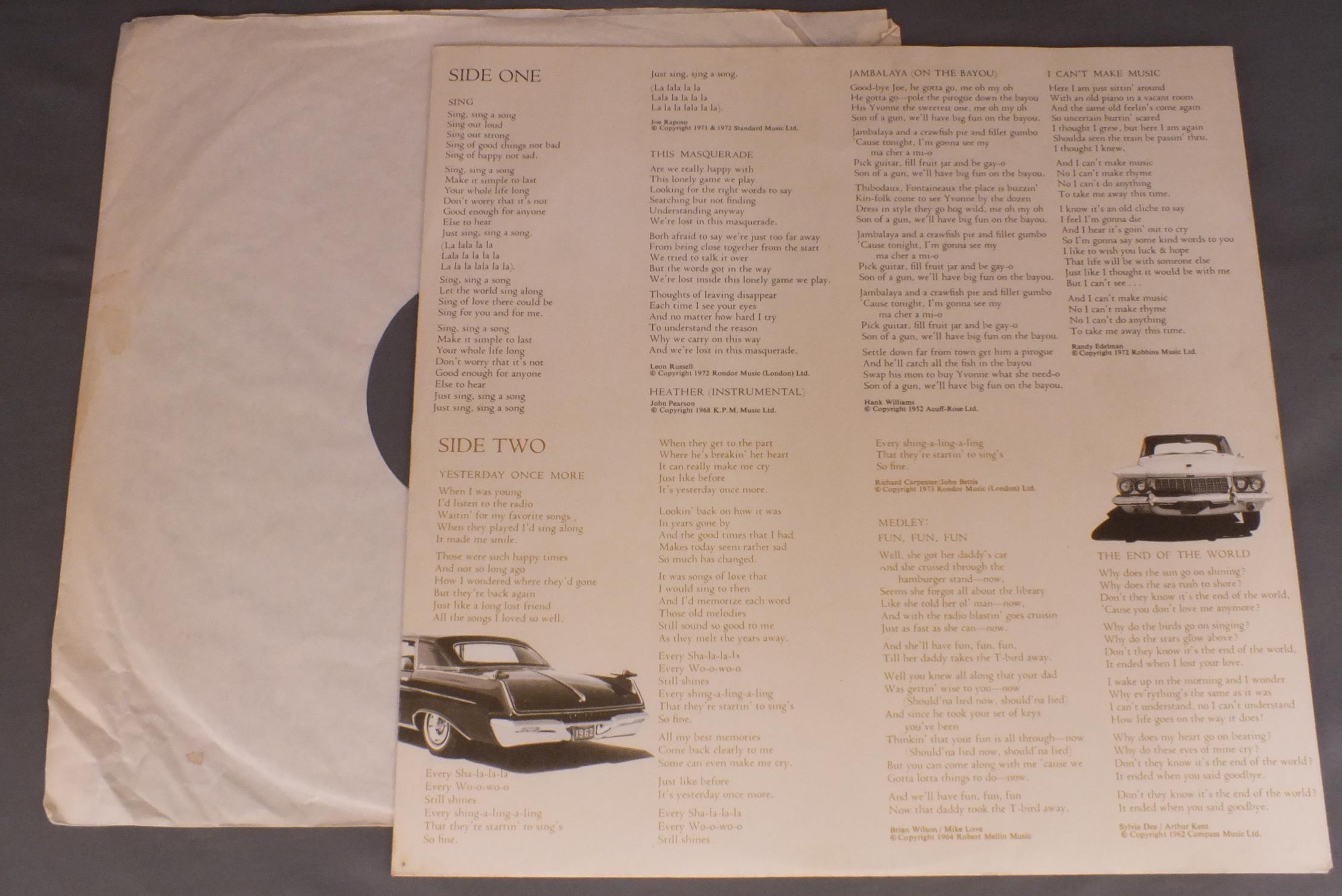 CARPENTERS/NOW AND THEN AMLH63519 製造国:英国盤 / Media:LPMatrix:A-1△W B-1△W外観:EX盤の状態:EX 価格(税込):¥4,950(売約済) 送料 7inch:定形外郵便 360円~LP:定形外郵便 660円~送料は、注文の最終画面で確認頂けます。 > > CARPENTERS/NOW AND THEN 外観 (EX)特記事項:ジャケ表面は表裏ジャケ共にスレやスリキズ、よごれ等は少なめ。見開きにスレやスレよごれ軽少しあり。オリジナルインナーは薄いよごれが少々有りますが、しっかりした状態で抜けも無いです。外観EXの共通説明:ダメージが限定的。中古品としては保存状態がよい方。シミ、ヨゴレ、スレ 少し~軽度。 盤の状態 (EX)特記事項:薄いスリキズ・スレ軽くある感じ。ほとんどが軽微なものの様子です。曲間など、静かなところを中心に聴いて見ましたが、少し、スクラッチ系のノイズが出るところがあるようですが、全体的にはチリプチ軽度で音もしっかり鳴っていました。盤EXの共通説明:盤面のスリキズが薄いものが少し~軽度 音に出そうなものは無いように見える(軽微なソフトティック音は除く)。 Tweet それぞれの画像をクリックすると、大きい写真が見られます こちらの商品もお勧めです 4,950円 JONI MITCHELL / DOG EAT DOG 7,700円 SUSAN MAUGHAN / I WANNA BE BOBBY`S GIRL 3,850円 NICO / THE END 4,400円 JONI MITCHELL / DOG EAT DOG 5,060円 JONI MITCHELL / CHALK MARK IN A RAIN STORM 4,950円 SANDY DENNY / RENDEZVOUS