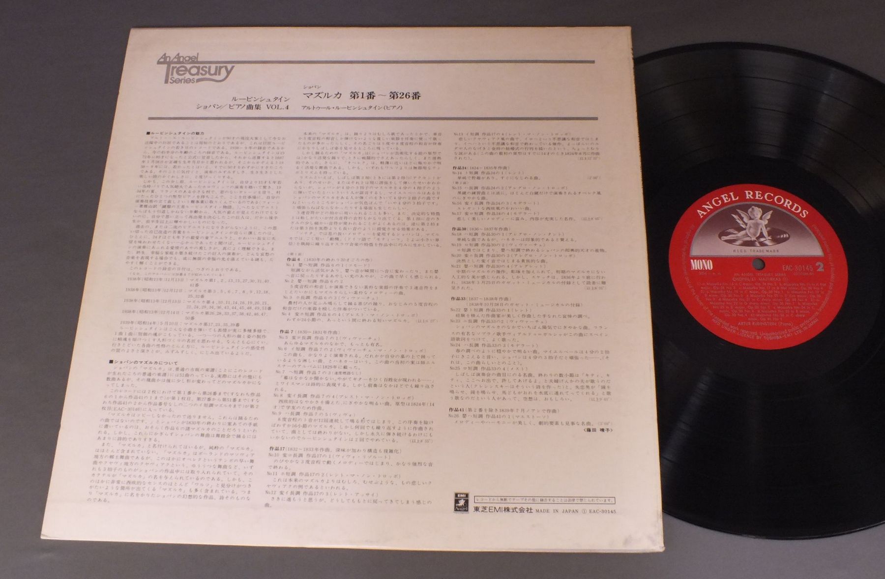 RUBINSTEINルービンシュタイン/CHOPIN - MAZURKA NO1-NO26ショパン - マズルカ第1番-第26番 EAC30145 製造国:日本盤 / Media:LP外観:EX盤の状態:EX+ 価格(税込):¥660(売約済) 送料 7inch:定形外郵便 360円~LP:定形外郵便 660円~送料は、注文の最終画面で確認頂けます。 > > RUBINSTEIN/CHOPIN - MAZURKA NO1-NO26 外観 (EX)特記事項:特記なし。外観EXの共通説明:ダメージが限定的。中古品としては保存状態がよい方。シミ、ヨゴレ、スレ 少し~軽度。 盤の状態 (EX+)特記事項:極薄いスリキズ・スレ少し。一見してきれいな状態です。盤EX+の共通説明:盤面の極薄いスリキズ、スレ少し程度 音に出そうなものは無いように見える(極軽微なソフトティック音は除く)。 Tweet それぞれの画像をクリックすると、大きい写真が見られます こちらの商品もお勧めです 990円 GEORE MALCOLMジョージ・マルコム / BACH ITALLAN CONC.バッハ イタリア協奏曲 880円 TOSHIKO KIRYU霧生トシ子 / PLAYS CHOPINショパン名曲集 990円 HOROWITZウラディミール・ホロヴィッツ / HOROWITZホロヴィッツ-音のカタログ 990円 RUBINSTEINルービンシュタイン / CHOPIN WALTZESショパン・ワルツ集 990円 HOROWITZホロヴィッツ / CONCERT 1978 - 79コンサート 1978 - 79 1,320円 BRENDELブレンデル / SCHUBERT - PIANO SONATA D958シューベルト - ピアノ・ソナタ 770円 GULDAグルダ / PIANO RICITALリサイタル 990円 ENTREMONTフィリップ・アントルモン / ENTREMONT PLAYS CHOPINショパン スケルツォ-バラード