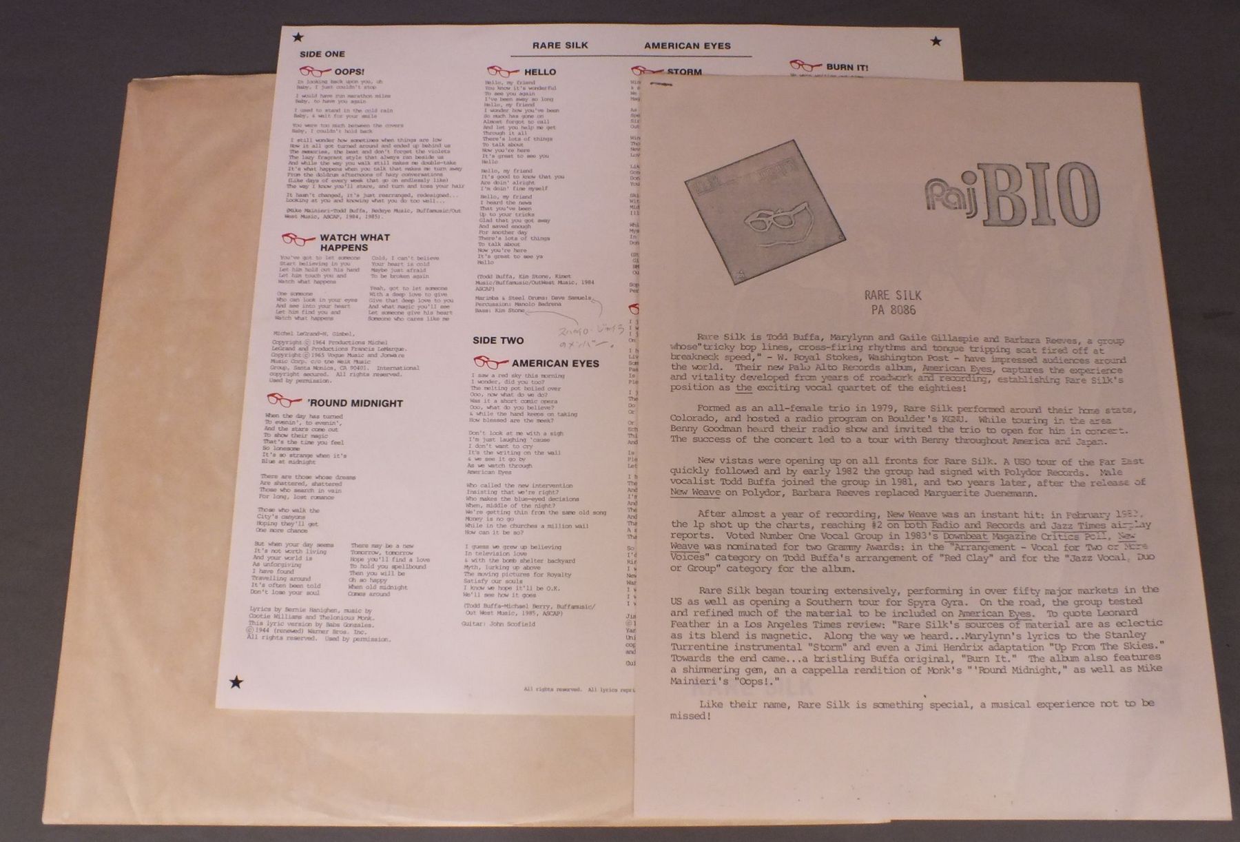 RARE SILK/AMERICAN EYES PA8086 製造国:米国盤 / Media:LP外観:EX盤の状態:EX 価格(税込):¥1,650(売約済) 送料 7inch:定形外郵便 360円~LP:定形外郵便 660円~送料は、注文の最終画面で確認頂けます。 > > RARE SILK/AMERICAN EYES 外観 (EX)特記事項:特記なし。外観EXの共通説明:ダメージが限定的。中古品としては保存状態がよい方。シミ、ヨゴレ、スレ 少し~軽度。 盤の状態 (EX)特記事項:薄いスリキズ・スレ軽くある感じ。軽微なものの様子です。盤EXの共通説明:盤面のスリキズが薄いものが少し~軽度 音に出そうなものは無いように見える(軽微なソフトティック音は除く)。 その他:見本盤 Tweet それぞれの画像をクリックすると、大きい写真が見られます こちらの商品もお勧めです 440円 HELEN O`CONNELL WITH JIMMY DORSEY & HIS ORCHESTRA / BIG BAND VOCALIST HELEN O`CONNELL. VOLUME 2 770円 JOHN GARY / CATCH A RISING STAR 550円 BING CROSBY / EARLY BING CROSBY PLUS THE BING CROSBY SHOW 1,980円 JONI JAMES / ITALIANISSIME 550円 JEANETTE MacDONALD & NELSON EDDY / SAME TITLE 1,100円 KING FAMILY / KING FAMILY ALBUM 660円 KATE SMITH / KATE SMITH`S GOLDEN YEARS OF BROADCASTING 770円 LARRY CARR / SINGS VERSE & CHORUS
