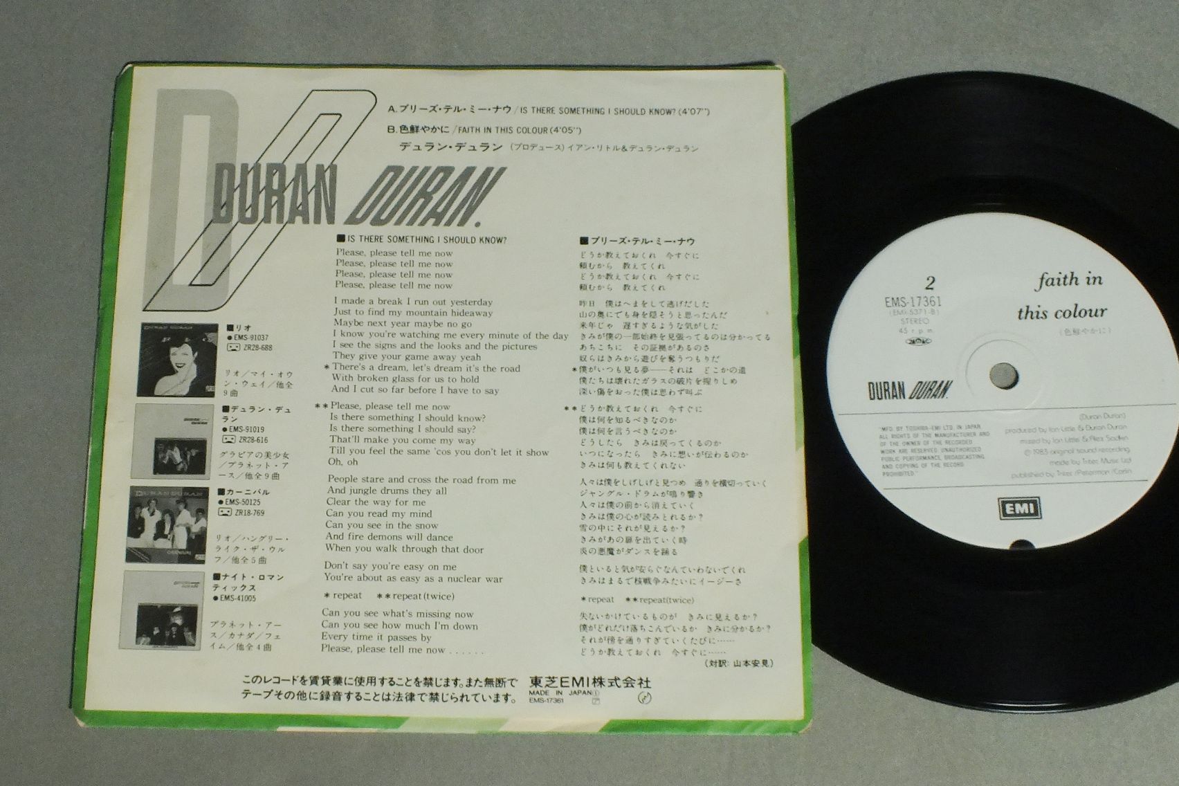 DURAN DURANデュラン・デュラン/IS THERE SOMETHING I SHOULD KNOW ?プリーズ・テル・ミー・ナウ EMS17361 製造国:日本盤 / Media:7inch外観:EX盤の状態:EX 価格(税込):¥550 送料 7inch:定形外郵便 360円~LP:定形外郵便 660円~送料は、注文の最終画面で確認頂けます。 レコード検索 > FEMALE > DURAN DURAN/IS THERE SOMETHING I SHOULD KNOW ? 外観 (EX)特記事項:小さな破れ有り。外観EXの共通説明:ダメージが限定的。中古品としては保存状態がよい方。シミ、ヨゴレ、スレ 少し~軽度。 盤の状態 (EX)特記事項:薄いスリキズ・スレ軽くある感じ。軽微なものの様子です。盤EXの共通説明:盤面のスリキズが薄いものが少し~軽度 音に出そうなものは無いように見える(軽微なソフトティック音は除く)。 Tweet それぞれの画像をクリックすると、大きい写真が見られます こちらの商品もお勧めです 770円 LOVERBOYラヴァーボーイ / KEEP IT UPホット・ガールズ 440円 SCREAMING BLUE MESSIAHSスクリーミング・ブルー・メサイアズ / BIKINI REDビキニ・レッド 550円 TOUCH / TOUCH 550円 HUNG CHUNGワン・チャン / HUNG CHUNGダンス・ホール・デイズ 440円 TAXXIタクシー / STATES OF EMERGENCY緊急発進 ! 660円 CULTURE CLUBカルチャー・クラブ / KISSING TO BE CLEVER 770円 CHEAP TRICKチープ・トリック / HEAVEN TONIGHT天国の罠 770円 CULTUTE CLUB / HOUSE ON FIRE