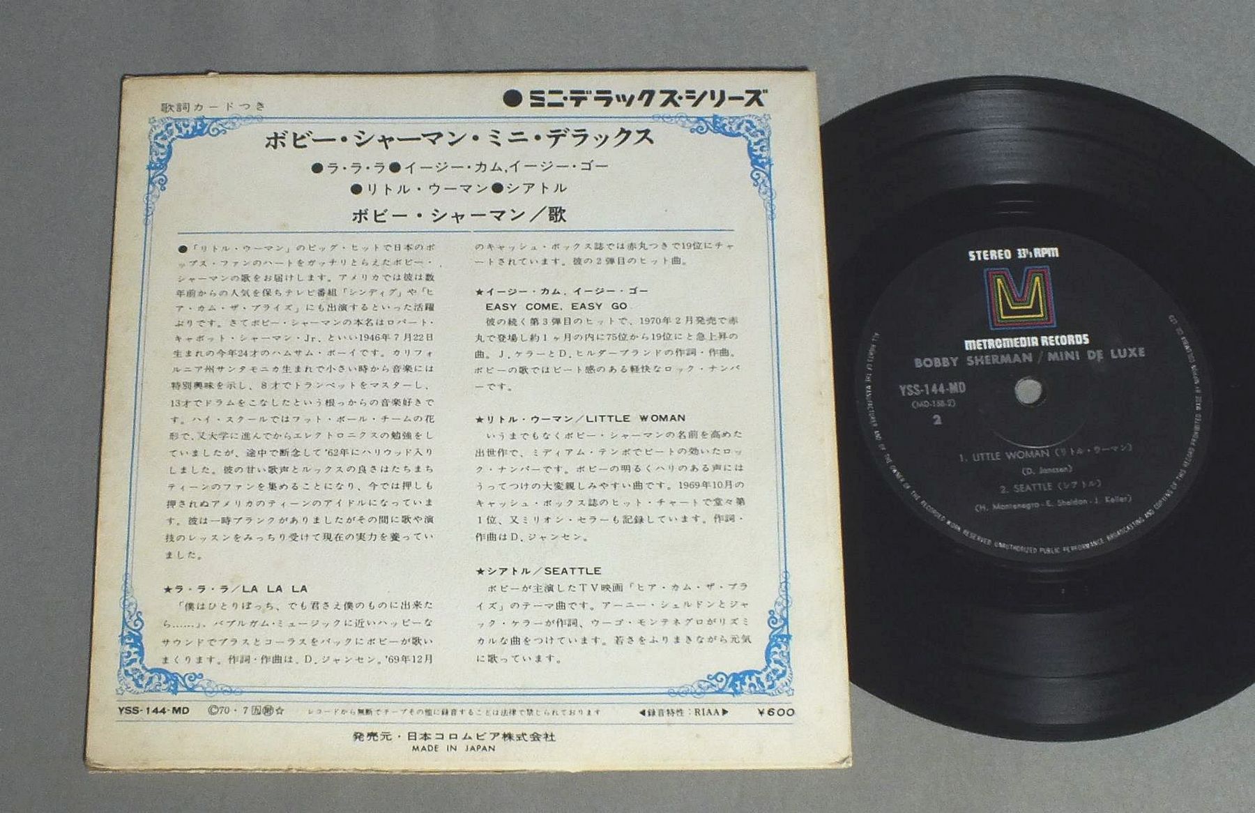 BOBBY SHERMANボビー・シャーマン/BOBBY SHERMAN MINI DELUXEボビー・シャーマン・ミニ・デラックス YSS144MD 製造国:日本盤 / Media:7inch外観:VG盤の状態:EX- 価格(税込):¥770 送料 7inch:定形外郵便 360円~LP:定形外郵便 660円~送料は、注文の最終画面で確認頂けます。 > > BOBBY SHERMAN/BOBBY SHERMAN MINI DELUXE 外観 (VG)特記事項:上下ヘリに割れ大。内側にテープ跡。外観VGの共通説明:ダメージが見るからに多い。 盤の状態 (EX-)特記事項:薄いスリキズ・細かい表面スレ多少ある感じ。殆どが軽微なものの様子です。盤EX-の共通説明:盤面のスリキズが多少有り。音に出そうなものは殆ど無いように見える~さほど気にならないぐらいの軽いプチ数カ所程度。 Tweet それぞれの画像をクリックすると、大きい写真が見られます こちらの商品もお勧めです 880円 GRAHAM BONNET / LINE UP孤独のナイトゲーム 1,320円 IAN MATTHEWSイアン・マシューズ / VALLEY HIヴァレー・ハイ 770円 GARY WRIGHTゲイリー・ライト / TOUCH AND GONEタッチ・アンド・ゴーン 770円 JOHN DENVERジョン・デンバー / BACK HOME AGAINバック・ホーム・アゲイン 662円 RICK SPRINGFIELDリック・スプリングフィールド / LIVING IN OZリビング・イン・OZ 770円 ELTON JOHNエルトン・ジョン / DON`T SHOOT ME I`M ONLY THE PIANO PLAYERピアニストを撃つな 770円 KEITH CARRADINEキース・キャラディン / I`M EASY-KEITH CARRADINEアイム・イージー-キース・キャラディン登場 770円 BOZ SCAGGSボズ・スキャッグス / DOWN TWO THEN LEFTダウン・トゥー・ゼン・レフト