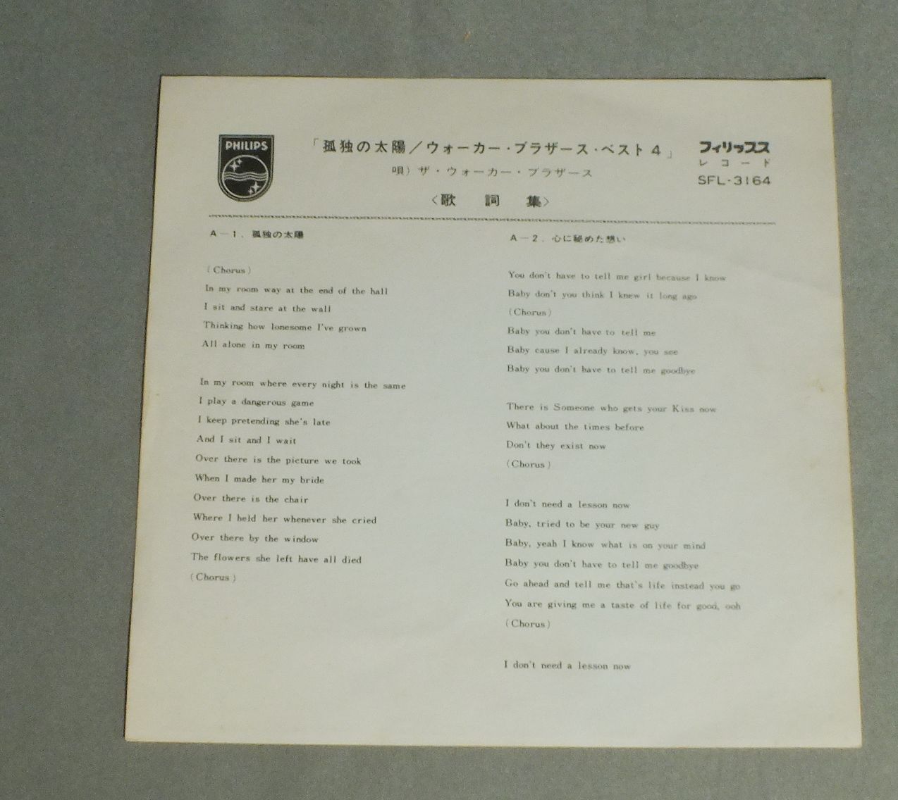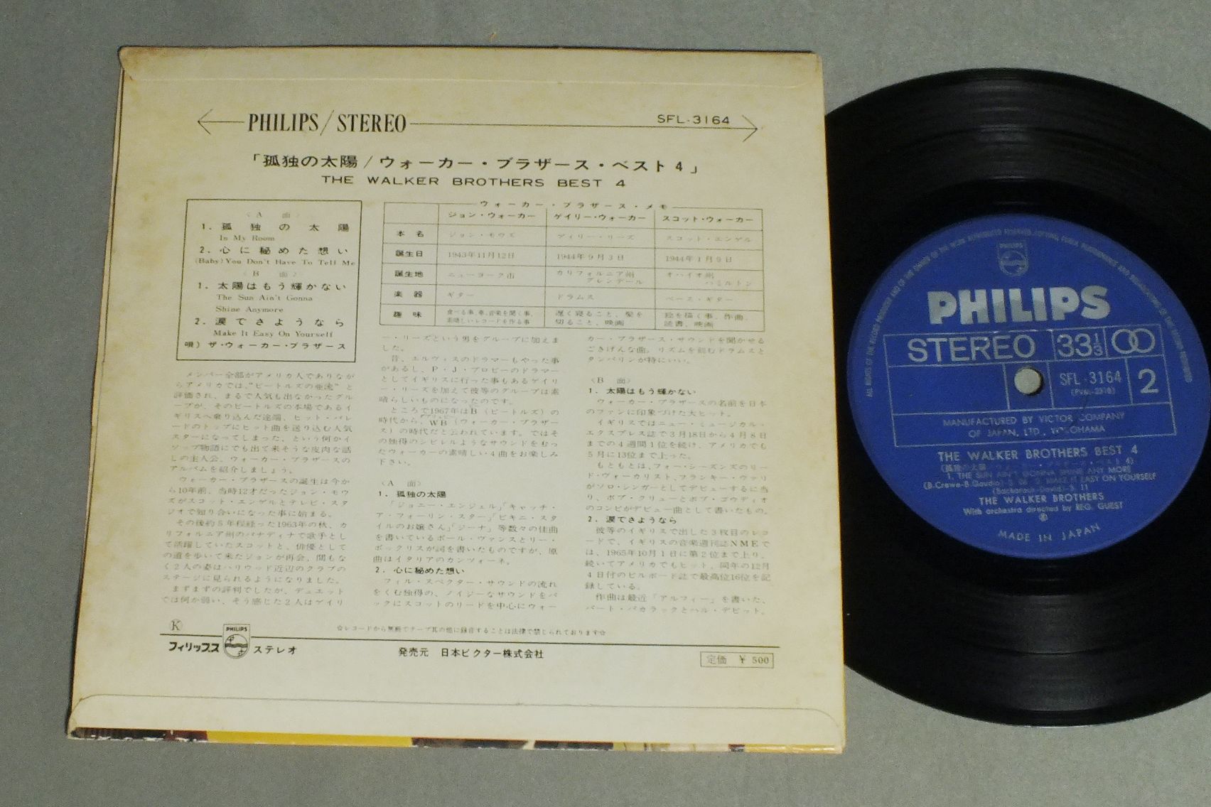 WALKER BROTHERSウォーカー・ブラザース/WALKER BROTHERS BEST 4ウォーカー・ブラザース・ベスト4 SFL3164 製造国:日本盤 / Media:7inch外観:VG+盤の状態:EX 価格(税込):¥550 送料 7inch:定形外郵便 360円~LP:定形外郵便 660円~送料は、注文の最終画面で確認頂けます。 レコード検索 > FEMALE > WALKER BROTHERS/WALKER BROTHERS BEST 4 外観 (VG+)特記事項:ヘリスレやシミ有り。外観VG+の共通説明:ダメージやや有り。シミ、ヨゴレ、スレなど多少~やや多め。 盤の状態 (EX)特記事項:薄いスリキズ・スレ軽くある感じ。殆どが軽微なものの様子です。盤EXの共通説明:盤面のスリキズが薄いものが少し~軽度 音に出そうなものは無いように見える(軽微なソフトティック音は除く)。 Tweet それぞれの画像をクリックすると、大きい写真が見られます こちらの商品もお勧めです 4,950円 ANIMALSアニマルズ / BEST ALBUM アニマルズのすべて 赤盤 2,640円 SPOTNICKSスプートニクス / KARELIA-THE BEST OF THE SPOTNICKS霧のカレリア-ベスト・オブ・ザ・スプートニクス