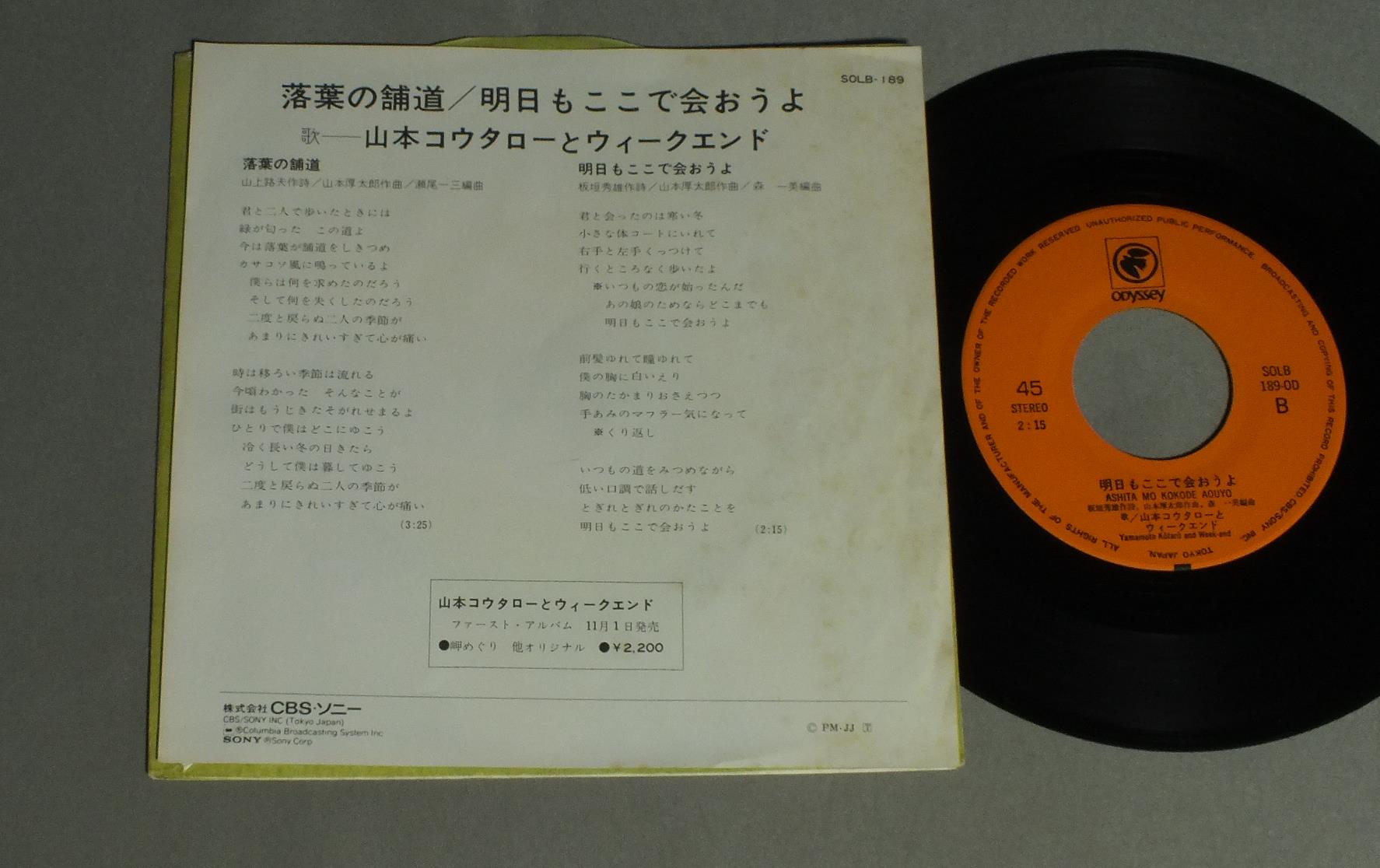 YAMAMOTO KOTARO AND WEEK END山本コウタローとウィークエンド/OCHIBA NO HODO落葉の舗道 SOLB189OD 製造国:日本盤 / Media:7inch外観:EX盤の状態:EX- 価格(税込):¥440 送料 7inch:定形外郵便 360円~LP:定形外郵便 660円~送料は、注文の最終画面で確認頂けます。 > > YAMAMOTO KOTARO AND WEEK END/OCHIBA NO HODO 外観 (EX)特記事項:シミ有り。外観EXの共通説明:ダメージが限定的。中古品としては保存状態がよい方。シミ、ヨゴレ、スレ 少し~軽度。 盤の状態 (EX-)特記事項:プレスミスか、盤に薄いくもり有り。スクラッチ系のノイズは静かな所で有る様子。音はクリアーです。盤EX-の共通説明:盤面のスリキズが多少有り。音に出そうなものは殆ど無いように見える~さほど気にならないぐらいの軽いプチ数カ所程度。 Tweet それぞれの画像をクリックすると、大きい写真が見られます こちらの商品もお勧めです 1,320円 SHIGERU IZUMIYA泉谷しげる / HIKARI TO KAGE光と影-泉谷しげる VOL4 1,210円 HAKUDO OHTSUKA大塚博堂 / 過ぎ去りし想い出は 1,980円 FURUIDO古井戸 / 2nd ALBUMオレンジ色のスケッチ(2nd ALBUM) 1,320円 NEKO猫 / NEKO猫 1,980円 SHINTARO GODO五堂新太郎 / FADE INフェイド・イン 770円 TAKURO YOSHIDAよしだたくろう / ON STAGEオン・ザ・ステージ ともだち 1,320円 SHIGERU IZUMIYA泉谷しげる / 3rd ALBUM第三集 地球はお祭りさわぎ 1,980円 TAKURO YOSHIDA吉田拓郎 / SEISHUN-NO UTA青春の詩