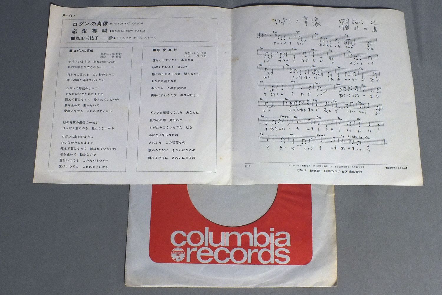 MIEKO HIROTA弘田三枝子/PORTRAIT OF LOVEロダンの肖像 P97 製造国:日本盤 / Media:7inch外観:EX盤の状態:EX- 価格(税込):¥440 送料 7inch:定形外郵便 360円~LP:定形外郵便 660円~送料は、注文の最終画面で確認頂けます。 > > MIEKO HIROTA/PORTRAIT OF LOVE 外観 (EX)特記事項:見開きにシミ。外観EXの共通説明:ダメージが限定的。中古品としては保存状態がよい方。シミ、ヨゴレ、スレ 少し~軽度。 盤の状態 (EX-)特記事項:薄いスリキズ・細かい表面スレ軽くある感じです。プチ出そうな所は少し。軽微なものが中心の様子です。盤EX-の共通説明:盤面のスリキズが多少有り。音に出そうなものは殆ど無いように見える~さほど気にならないぐらいの軽いプチ数カ所程度。 Tweet それぞれの画像をクリックすると、大きい写真が見られます こちらの商品もお勧めです 770円 KENJI SAWADA沢田研二 / OMOIKKIRI KIZA NA JINSEI思いきり気障な人生 550円 CHERISHチェリッシュ / SPRING ROMANCE春のロマンス 1,650円 TAKUROU YOSHIDA吉田拓郎 / IN BUDOKAN王様達のハイキング IN BUDOKAN 1,210円 PEDRO & CAPRICIOUSペドロ &カプリシャス / BEST ALBUMスター・ベスト・ヒット・コレクション 1,210円 JUN MAYUZUMI TOMOKO OGAWA & CHIYO OKUMURA黛ジュン・小川知子・奥村チヨ / JUN TOMOKO CHIYOジュン・知子・チヨ 第二集 770円 TAKURO YOSHIDAよしだたくろう / HELLO! I`M TAKURO YOSHIDA元気です。 770円 KUMIKO YAMASHITA山下久美子 / DANCIN` IN THE KITCHENダンシン・イン・ザ・キッチン 2,750円 STAGE 101ステージ101 / AKAI YANE NO IE赤い屋根の家
