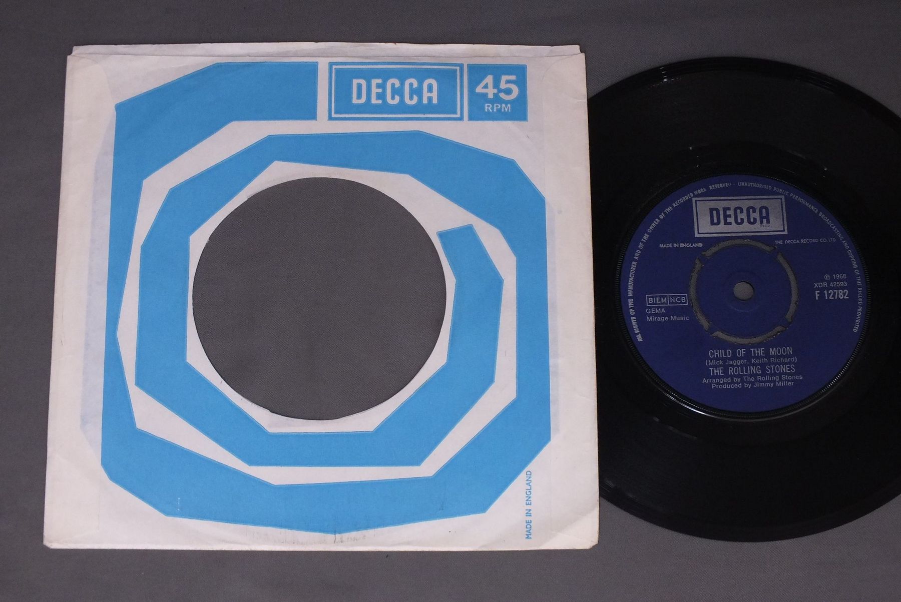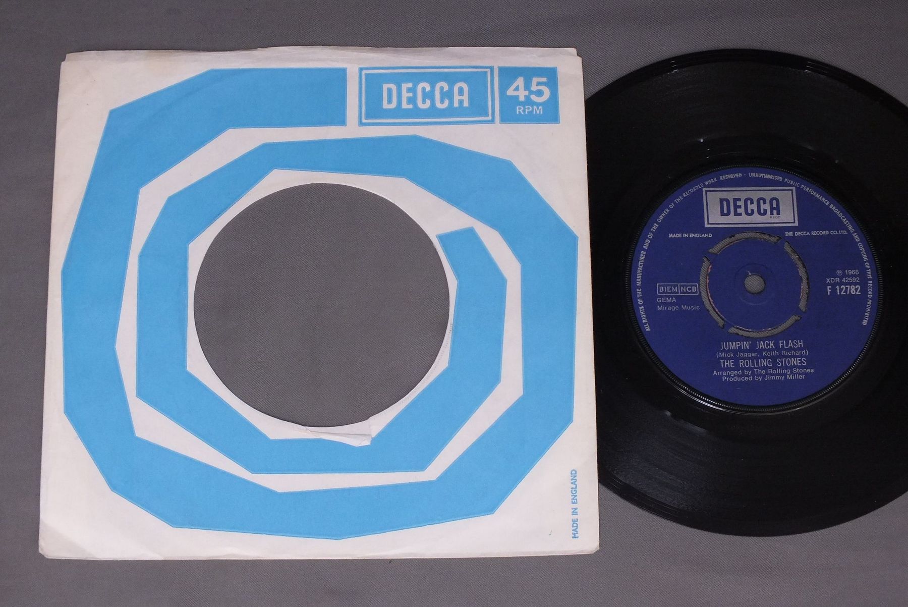ROLLING STONES/JUMPIN` JACK FLASH F12782 製造国:英国盤 / Media:7inchMatrix:1X 1X外観:EX盤の状態:EX 価格(税込):¥5,500(売約済) 送料 7inch:定形外郵便 360円~LP:定形外郵便 660円~送料は、注文の最終画面で確認頂けます。 > > ROLLING STONES/JUMPIN` JACK FLASH 外観 (EX)特記事項:DECCA社のカンパニースリーブ付き。片サイドのセンター部分に僅かに破けありますが、全体的によごれやヨレ感の無いきれいな状態です。外観EXの共通説明:ダメージが限定的。中古品としては保存状態がよい方。シミ、ヨゴレ、スレ 少し~軽度。 盤の状態 (EX)特記事項:薄いスリキズ・スレ少しある程度。音に出そうなものもなく一見してきれいな状態です。曲間など、静かなところを中心に聴いて見ましたが、チリノイズ少ないきれいな再生具合でした。盤EXの共通説明:盤面のスリキズが薄いものが少し~軽度 音に出そうなものは無いように見える(軽微なソフトティック音は除く)。 Tweet それぞれの画像をクリックすると、大きい写真が見られます こちらの商品もお勧めです 2,750円 ROLLING STONES / EMOTIONAL RESCUE + POSTEREMOTIONAL RESCUE ポスター付