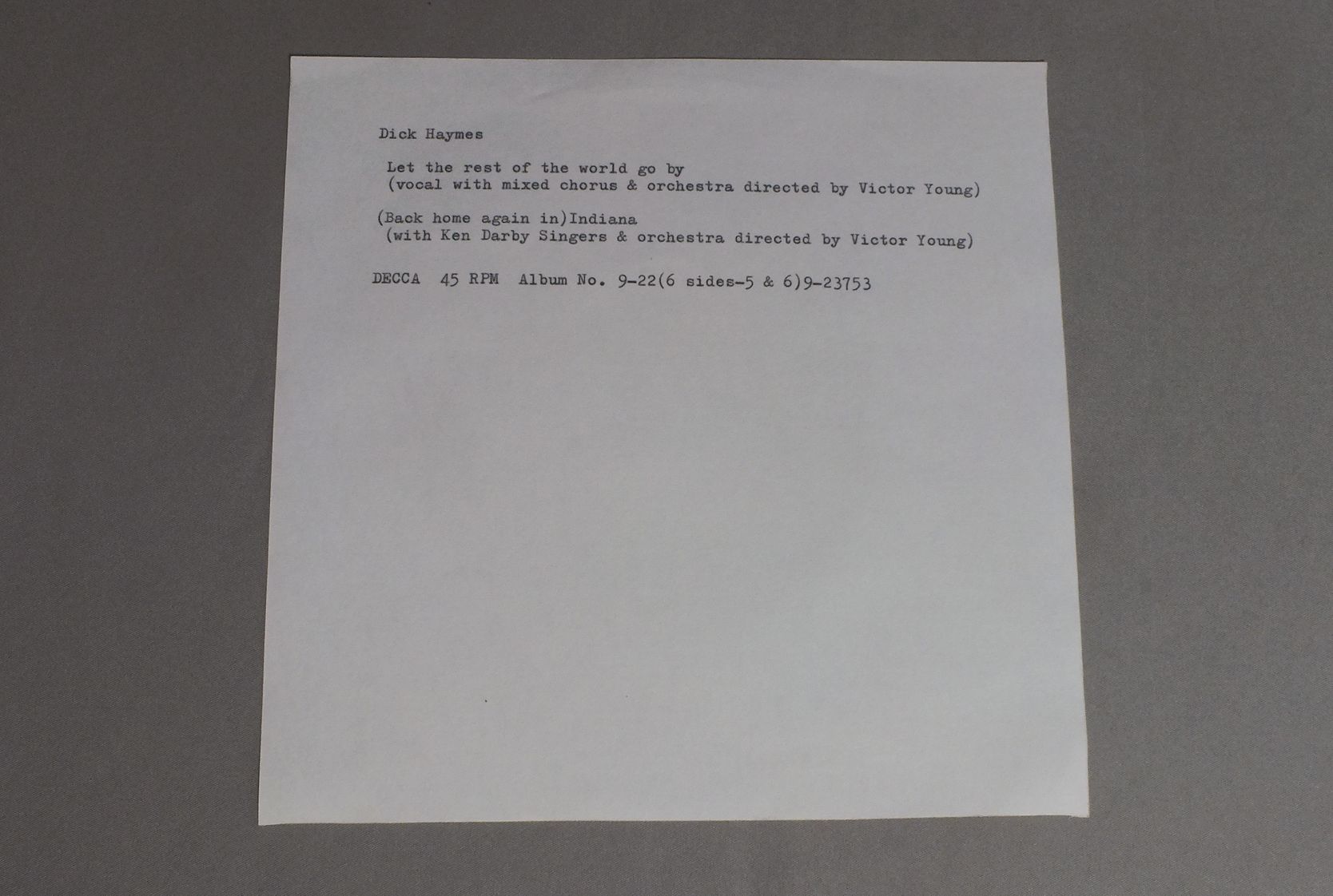 DICK HAYMES/LET THE REST OF THE WORLD GO BY 9 23753 製造国:米国盤 / Media:7inch盤の状態:VG+ 価格(税込):¥330 送料 7inch:定形外郵便 360円~LP:定形外郵便 660円~送料は、注文の最終画面で確認頂けます。 > > DICK HAYMES/LET THE REST OF THE WORLD GO BY 盤の状態 (VG+)特記事項:薄いスリキズ・細かいスレやや多め。プチ出そうな小キズ、線キズは数カ所で、全体的には軽微なものが中心です。少し聴いてみましたが、音自体はしっかりクリアーに鳴っているようでした。盤VG+の共通説明:盤面にスリキズが多少~やや有り、音に出そうなものも多少ある。 Tweet それぞれの画像をクリックすると、大きい写真が見られます こちらの商品もお勧めです 990円 CLEO LAINE / BORN ON A FRIDAY 770円 MILDRED BAILEY-TERRY ALLEN / RED NORVO&HIS ORCHESTRA 1938 1,100円 KING FAMILY / KING FAMILY ALBUM 1,100円 TERESA BREWER / GOOD NEWS 770円 JOHN GARY / CATCH A RISING STAR 990円 CARMAN MCRAE / ALFIE 550円 BING CROSBY / EARLY BING CROSBY PLUS THE BING CROSBY SHOW 550円 JEANETTE MacDONALD & NELSON EDDY / SAME TITLE