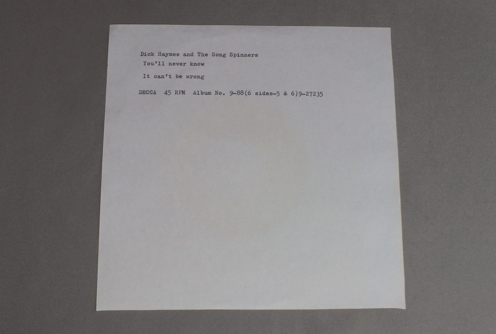 DICK HAYMES AND THE SONG SPINNERS/YOU`LL NEVER KNOW DECCA 9-27235 製造国:米国盤 / Media:7inch盤の状態:VG+ 価格(税込):¥330 送料 7inch:定形外郵便 360円~LP:定形外郵便 660円~送料は、注文の最終画面で確認頂けます。 > > DICK HAYMES AND THE SONG SPINNERS/YOU`LL NEVER KNOW 盤の状態 (VG+)特記事項:薄いスリキズ・細かいスレ多少。プチ出そうな小キズ、線キズも有ります。少し聴いてみましたが、音自体はしっかりクリアーに鳴っているようでした。盤VG+の共通説明:盤面にスリキズが多少~やや有り、音に出そうなものも多少ある。 その他:レーベルに書込み。 Tweet それぞれの画像をクリックすると、大きい写真が見られます こちらの商品もお勧めです 1,100円 CLAUDE HOPKINS & HIS ORCHESTRA / 1932-1933 1940 770円 ARTIE SHAW ORCHESTRA / BORN TO SWING 550円 BUNNY BERIGAN & ORIGINAL DIXIELAND JAZZ BAND / SATURDAY NIGHT SWING CLUB 1936 1,320円 LIONEL HAMPTON AND HIS GIANTS / LIVE IN EMMEN - HOLLAND 770円 ANDY KIRK AND HIS CLOUDS OF JOY / INSTRUMENTALLY SPEKING 1936 & 42 1,155円 GLENN MILLER - TOMMY DORSEY / GLENN MILLER`S MODERNAIRES 770円 LIONEL HAMPTON / BRAT OF THE BIG BANDS GOOD VIBES 1,320円 YANK LAWSON AND BOB HAGGART / WORLD`S GREATEST JAZZBAND