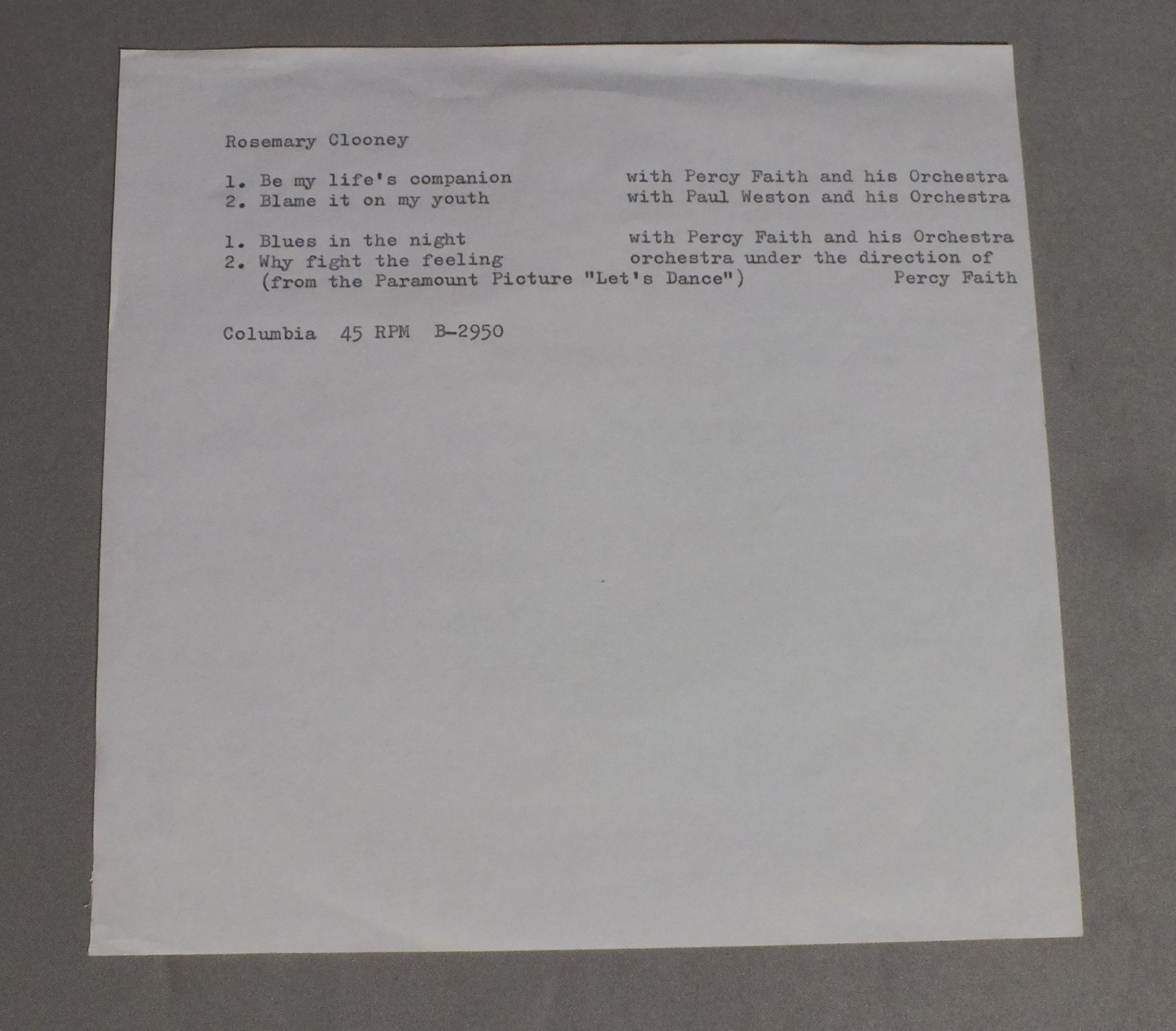 ROSEMARY CLOONEY/BE MY LIFE`S COMPANION COLUMBIA B2550 製造国:米国盤 / Media:7inch盤の状態:VG+ 価格(税込):¥440 送料 7inch:定形外郵便 360円~LP:定形外郵便 660円~送料は、注文の最終画面で確認頂けます。 > > ROSEMARY CLOONEY/BE MY LIFE`S COMPANION 盤の状態 (VG+)特記事項:薄いスリキズ・細かいスレ多少。全体的には軽微なものが中心です。少し聴いてみましたが、音自体はしっかりクリアーに鳴っているようでした。盤VG+の共通説明:盤面にスリキズが多少~やや有り、音に出そうなものも多少ある。 Tweet それぞれの画像をクリックすると、大きい写真が見られます こちらの商品もお勧めです 550円 BING CROSBY / EARLY BING CROSBY PLUS THE BING CROSBY SHOW 1,100円 TERESA BREWER / GOOD NEWS 770円 JOHN GARY / CATCH A RISING STAR 1,980円 JONI JAMES / ITALIANISSIME 1,210円 BING CROSBY / EASY TO REMEMBER 1931-36 1,320円 BING CROSBY / BING CROSBY 3,850円 LUANN SIMMS / AT SEPARATE TABLES (AUTOGRAPHED)AT SEPARATE TABLES サイン付 550円 MEL TORME / `ROUND MIDNIGHT