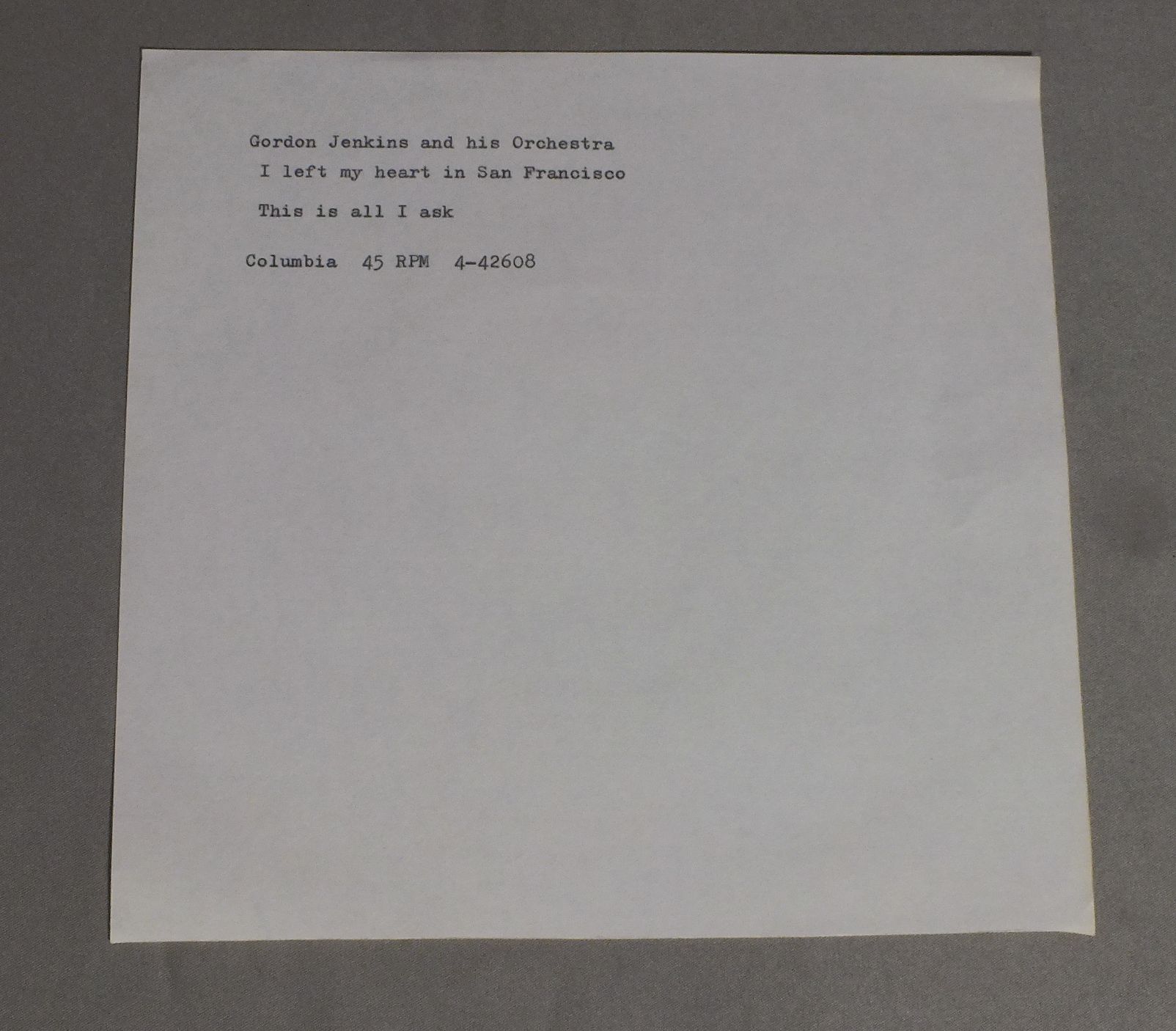 GORDON JENKINS/I LEFT MY HEART IN SAN FRANCISCO COLUMBIA 4-42608 製造国:米国盤 / Media:7inch盤の状態:VG+ 価格(税込):¥330 送料 7inch:定形外郵便 360円~LP:定形外郵便 660円~送料は、注文の最終画面で確認頂けます。 > > GORDON JENKINS/I LEFT MY HEART IN SAN FRANCISCO 盤の状態 (VG+)特記事項:薄いスリキズ・細かいスレ多少。プチ出そうな小キズ、線キズも有ります。少し聴いてみましたが、音自体はしっかりクリアーに鳴っているようでした。盤VG+の共通説明:盤面にスリキズが多少~やや有り、音に出そうなものも多少ある。 その他:レーベルにナンバーシール。 Tweet それぞれの画像をクリックすると、大きい写真が見られます こちらの商品もお勧めです 880円 PAUL RENARD / MANY KEYBOARDS OF THE AMAZING PAUL RENARD 1,650円 BOB SCOBEY`S FRISCO JAZZ BAND / BEAUTY AND THE BEAT 1,210円 DICK MELDONIAN TRIO / IT`S A WONDERFUL WORLD AUTOGRAPHEDIT`S A WONDERFUL WORLD サイン付 1,210円 BUTCH THOMPSON AND CHET ERY / MR. JELLY ROLLS ON AUTOGRAPHEDサイン付 1,210円 PUNCH MILLER-MUTT CAREY / JAZZ NEW ORLEANS (RALPH SUTTON AUTOGRAPHED)RALPH SUTTONサイン付 770円 GUY LOMBARDO / SEEMS LIKE OLD TIMES 1,320円 EARL HINES / PLAYS DUKE ELLINGTON VOL3 770円 ALL STARS / EUROPEAN CONCERT