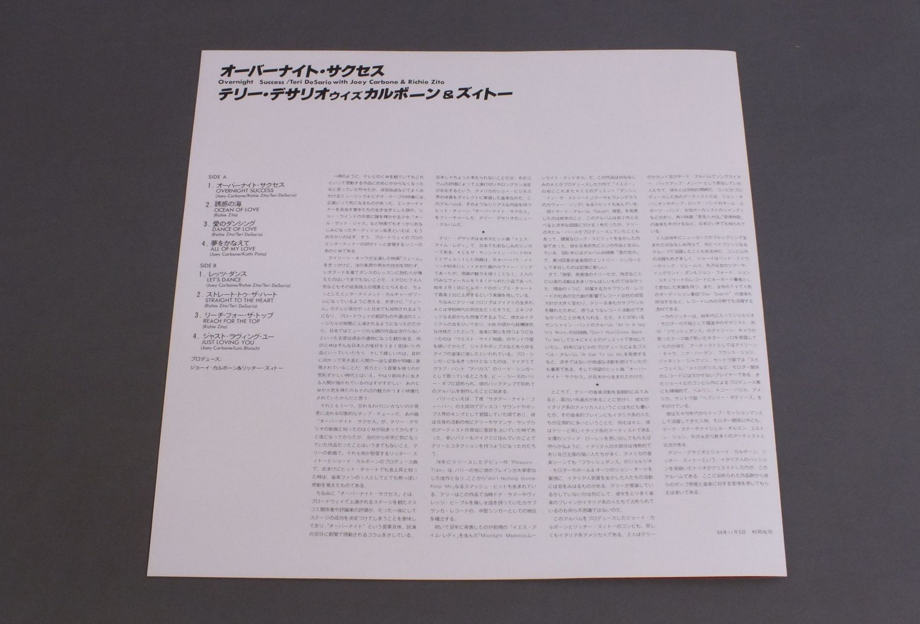 TERI DESARIO - CARBONE & ZITOテリー・デサリオ - カルボーン&ズィトー/OVERNIGHT SUCCESSオーバーナイト・サクセス 28 3H154 製造国:日本盤 / Media:LP外観:EX盤の状態:EX+帯:EX 価格(税込):¥2,306(売約済) 送料 7inch:定形外郵便 360円~LP:定形外郵便 660円~送料は、注文の最終画面で確認頂けます。 > > TERI DESARIO - CARBONE & ZITO/OVERNIGHT SUCCESS 外観 (EX)特記事項:特記なし。外観EXの共通説明:ダメージが限定的。中古品としては保存状態がよい方。シミ、ヨゴレ、スレ 少し~軽度。 盤の状態 (EX+)特記事項:極薄いスリキズ・スレ少し。一見してきれいな状態です。盤EX+の共通説明:盤面の極薄いスリキズ、スレ少し程度 音に出そうなものは無いように見える(極軽微なソフトティック音は除く)。 帯の状態 (EX):特記なし。 Tweet それぞれの画像をクリックすると、大きい写真が見られます こちらの商品もお勧めです 770円 ORIGINAL CAST RECORDINGブロードウェイ・オリジナル・キャスト / TANGO ARGENTINO ORIGINAL CAST RECORDINGタンゴ・アルヘンティーノ 660円 RICHARD ATTENBOROUGHリチャード・アッテンボロー監督 / SOUND TRACK CHORUS LINE映画 コーラスライン 880円 RAN OTORI & JUN ANNA鳳蘭 & 安奈淳 / SING LOVE愛を歌う 770円 LIZA MINNELLIライザ・ミネリ / CABARET ORIGINAL SOUND TRACK映画 キャバレー