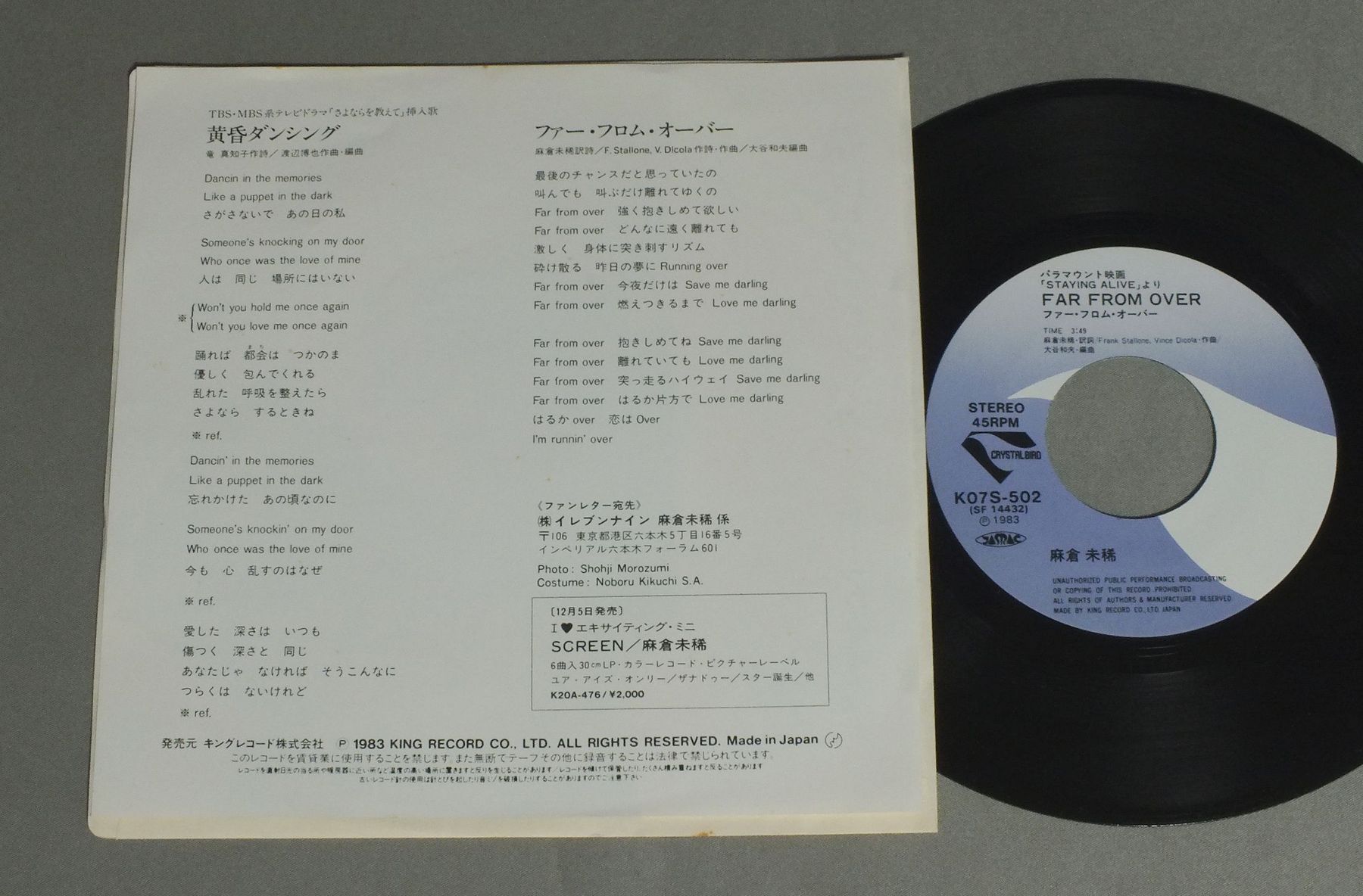 MIKI ASAKURA麻倉未稀/TASOGAREDANCING黄昏ダンシング K07S502 製造国:日本盤 / Media:7inch外観:EX盤の状態:EX+ 価格(税込):¥660 送料 7inch:定形外郵便 360円~LP:定形外郵便 660円~送料は、注文の最終画面で確認頂けます。 レコード検索 > J-POP > MIKI ASAKURA/TASOGAREDANCING 外観 (EX)特記事項:特記なし。外観EXの共通説明:ダメージが限定的。中古品としては保存状態がよい方。シミ、ヨゴレ、スレ 少し~軽度。 盤の状態 (EX+)特記事項:薄いスリキズ・スレ少し。一見してきれいな状態です。盤EX+の共通説明:盤面の極薄いスリキズ、スレ少し程度 音に出そうなものは無いように見える(極軽微なソフトティック音は除く)。 Tweet それぞれの画像をクリックすると、大きい写真が見られます こちらの商品もお勧めです 770円 ERI NITTA新田恵利 / E-AREA 770円 SEIKO MATSUDA松田聖子 / CANDYキャンディー 1,210円 ONYANKO CLUB河合その子 国生さゆり 城之内早苗 渡辺美奈子 渡辺満里奈 / MERRY X`MAS FOR YOU PICTURE DISCメリー・クリスマス・フォー・ユー 660円 YOU HAYAMI早見優 / IMAGEイマージュ 440円 YOU HAYAMI早見優 / MUSICミュージック 1,870円 ATSUMI KURASAWA倉沢敦美 / MESSAGEメッセージ 770円 YOSHIE KASHIWABARA柏原よしえ / SUMMER SENSATIONサマー・センセイション 880円 MAKO ISHINO石野真子 / MAKO2