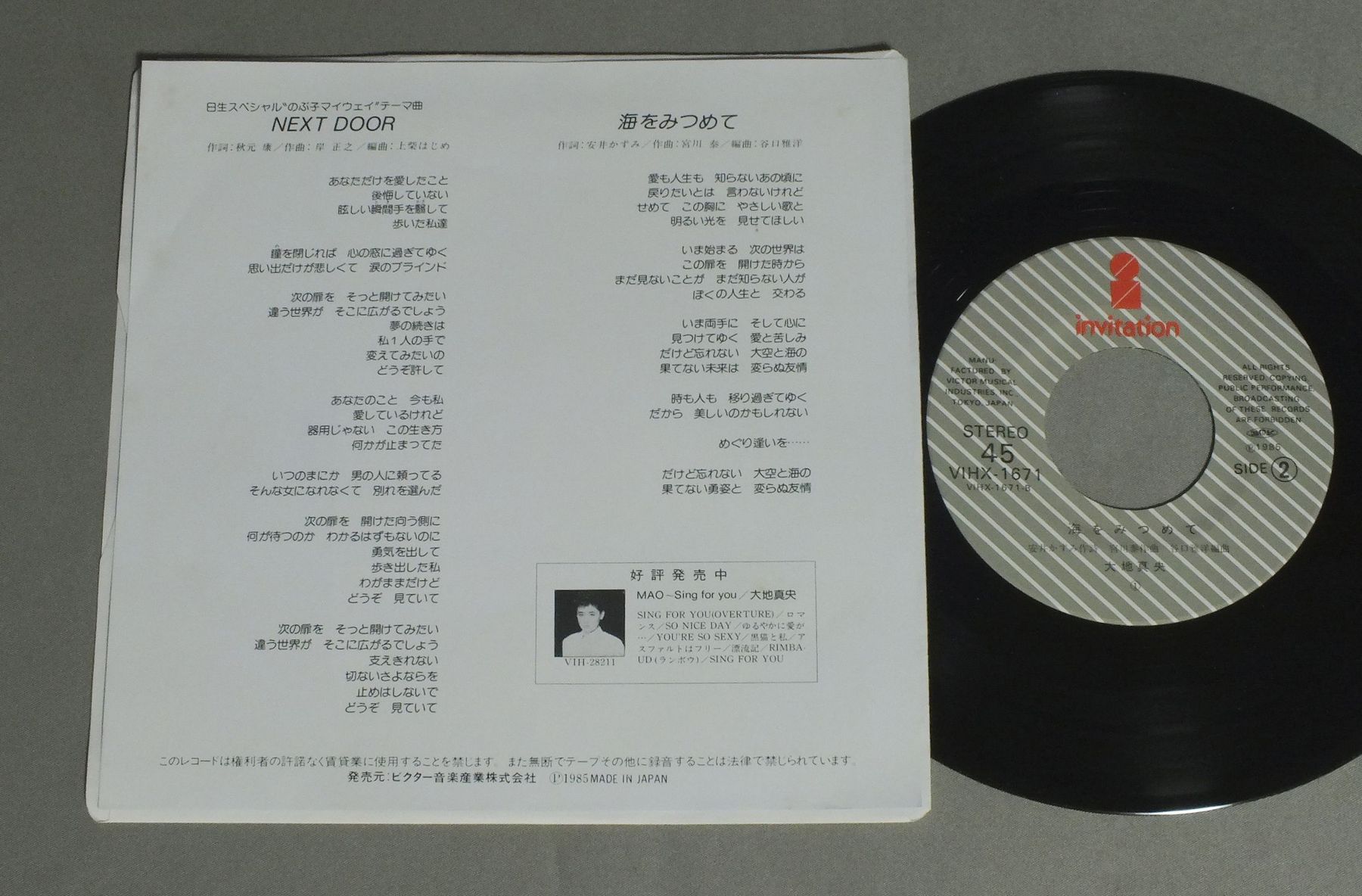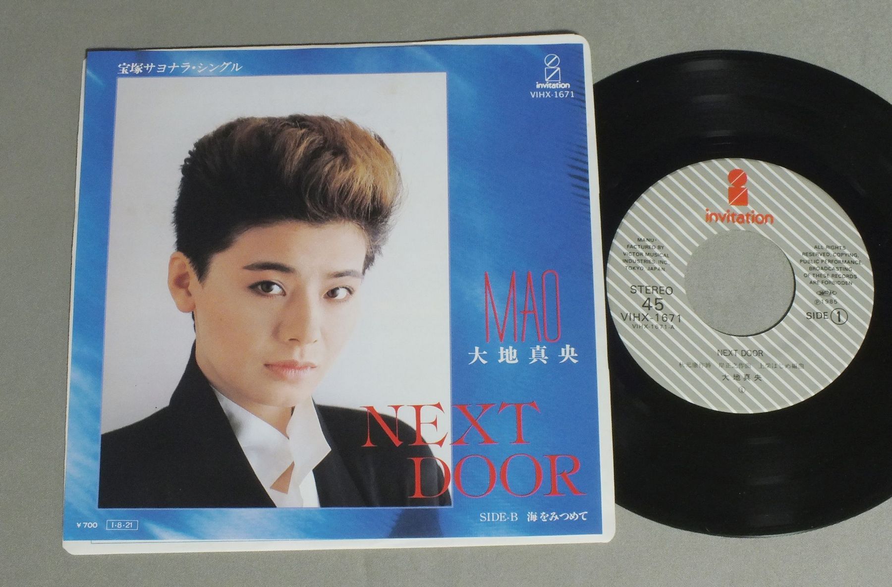 MAO TAICHI大地真央/NEXT DOOR VIHX1671 製造国:日本盤 / Media:7inch外観:EX盤の状態:EX+ 価格(税込):¥660 送料 7inch:定形外郵便 360円~LP:定形外郵便 660円~送料は、注文の最終画面で確認頂けます。 レコード検索 > CLASSIC ORCH. > MAO TAICHI/NEXT DOOR 外観 (EX)特記事項:ヨレやしシミが少々。外観EXの共通説明:ダメージが限定的。中古品としては保存状態がよい方。シミ、ヨゴレ、スレ 少し~軽度。 盤の状態 (EX+)特記事項:薄いスリキズ・スレ少し。一見してきれいな状態です。盤EX+の共通説明:盤面の極薄いスリキズ、スレ少し程度 音に出そうなものは無いように見える(極軽微なソフトティック音は除く)。 Tweet それぞれの画像をクリックすると、大きい写真が見られます こちらの商品もお勧めです 660円 RICHARD ATTENBOROUGHリチャード・アッテンボロー監督 / SOUND TRACK CHORUS LINE映画 コーラスライン 880円 RAN OTORI & JUN ANNA鳳蘭 & 安奈淳 / SING LOVE愛を歌う 770円 LIZA MINNELLIライザ・ミネリ / CABARET ORIGINAL SOUND TRACK映画 キャバレー 770円 ORIGINAL CAST RECORDINGブロードウェイ・オリジナル・キャスト / TANGO ARGENTINO ORIGINAL CAST RECORDINGタンゴ・アルヘンティーノ