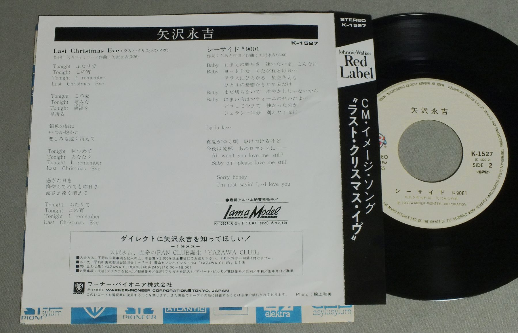 EIKICHI YAZAWA矢沢永吉/LAST CHRISTMAS EVEラスト・クリスマス・イブ K1527 製造国:日本盤 / Media:7inch外観:EX盤の状態:EX+ 価格(税込):¥660 送料 7inch:定形外郵便 360円~LP:定形外郵便 660円~送料は、注文の最終画面で確認頂けます。 レコード検索 > J-POP > EIKICHI YAZAWA/LAST CHRISTMAS EVE 外観 (EX)特記事項:ヨレやスリキズ有り。外観EXの共通説明:ダメージが限定的。中古品としては保存状態がよい方。シミ、ヨゴレ、スレ 少し~軽度。 盤の状態 (EX+)特記事項:薄いスリキズ・スレ少し。一見してきれいな状態です。盤EX+の共通説明:盤面の極薄いスリキズ、スレ少し程度 音に出そうなものは無いように見える(極軽微なソフトティック音は除く)。 Tweet それぞれの画像をクリックすると、大きい写真が見られます こちらの商品もお勧めです 1,320円 CHA-CHAチャ・チャ / HITOMI NO-NAKA-NO TAKARAJIMA瞳の中の宝島 990円 YUKO TOMITAとみたゆう子 / DEUXDEUX (2nd ALBUM) 1,320円 MASAAKI HIRAO平尾昌晃 / SING MASAAKI HIRAO平尾昌晃を歌う 770円 KUMIKO YAMASHITA山下久美子 / DANCIN`IN THE KITCHEN 770円 MASAAKI HIRAO平尾昌晃 / BIG STAR SERIESビッグスター・シリーズ 平尾昌晃 770円 KOJI KIKKAWA吉川晃司 / INNOCENT SKYイノセント スカイ 2,750円 STAGE 101ステージ101 / AKAI YANE NO IE赤い屋根の家 770円 YASUHIRO ABE安部恭弘 / TUNE BOX THE SUMMER 1968チューン・ボックス