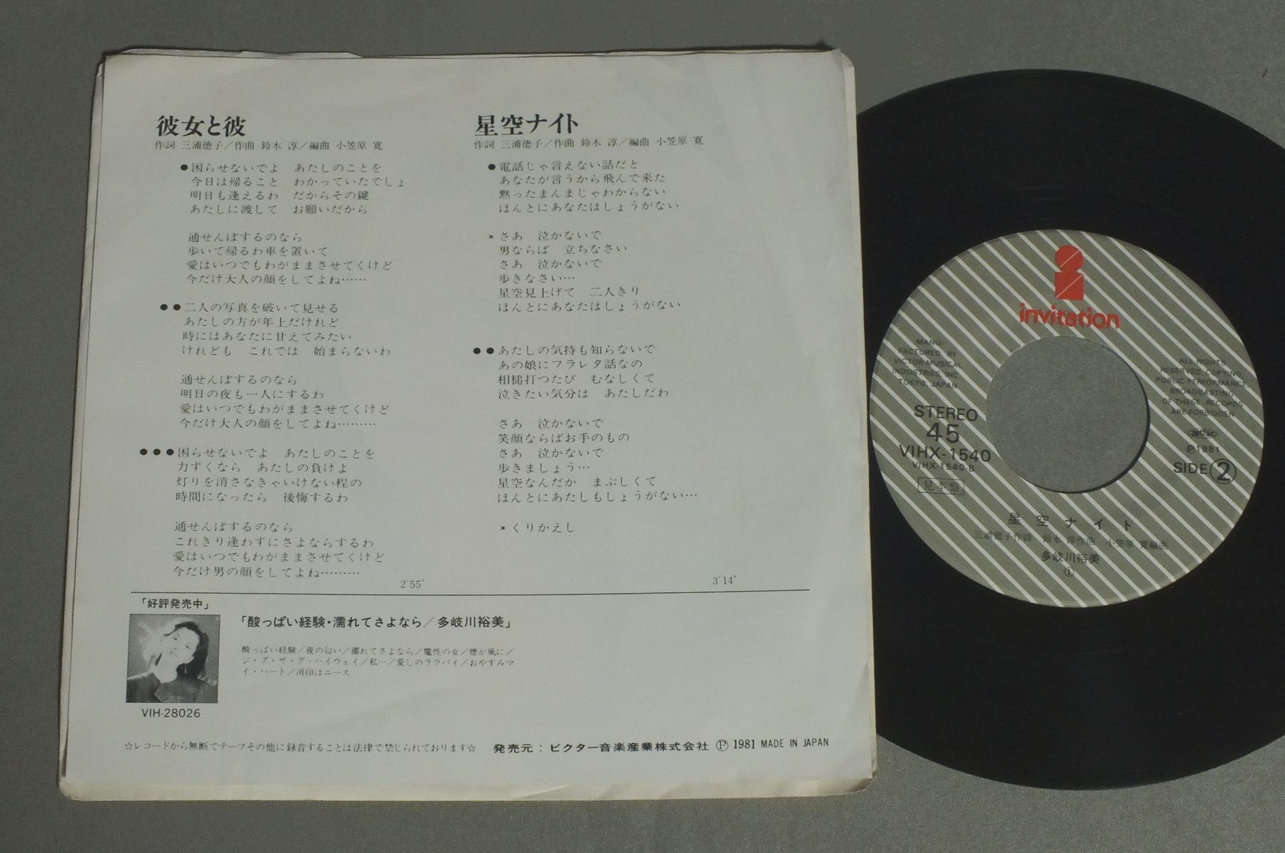 YUMI TAKIGAWA多岐川裕美/SHE AND HE彼女と彼 VIHX1540 製造国:日本盤 / Media:7inch外観:EX盤の状態:EX+ 価格(税込):¥660 送料 7inch:定形外郵便 360円~LP:定形外郵便 660円~送料は、注文の最終画面で確認頂けます。 レコード検索 > 全てのジャンル > YUMI TAKIGAWA/SHE AND HE 外観 (EX)特記事項:折れ跡有り。外観EXの共通説明:ダメージが限定的。中古品としては保存状態がよい方。シミ、ヨゴレ、スレ 少し~軽度。 盤の状態 (EX+)特記事項:薄いスリキズ・スレ少し。一見してきれいな状態です。盤EX+の共通説明:盤面の極薄いスリキズ、スレ少し程度 音に出そうなものは無いように見える(極軽微なソフトティック音は除く)。 Tweet それぞれの画像をクリックすると、大きい写真が見られます こちらの商品もお勧めです 1,210円 YUMI MATSUTOYA松任谷由実 / DA/DI/DAダ・ディ・ダ 880円 MIDORI KINOUCHI木之内みどり / ORIGINAL BEST COLLECTIONオリジナル・ベスト・コレクション 1,320円 SHOGO HAMADA浜田省吾 / SAND CASTLE 770円 S.KIYOTAKA & OMEGA TRIBE杉山清貴 & オメガドライブ / LIVE EMOTIONライヴ・エモーション 660円 GO NAGABUCHI長渕 剛 / GYAKURYU逆流 1,210円 RYOKO MORIYAMA森山良子 / IN NASHVILLEイン・ナッシュビル 770円 KONOMI SASAKI佐々木好(このみ) / KOKORO NO UCHI GA WAAREBA YOI心のうちがわかればいいのに 660円 I.GEORGEアイ・ジョージ / JONETSU NO UTAGOE情熱の歌声