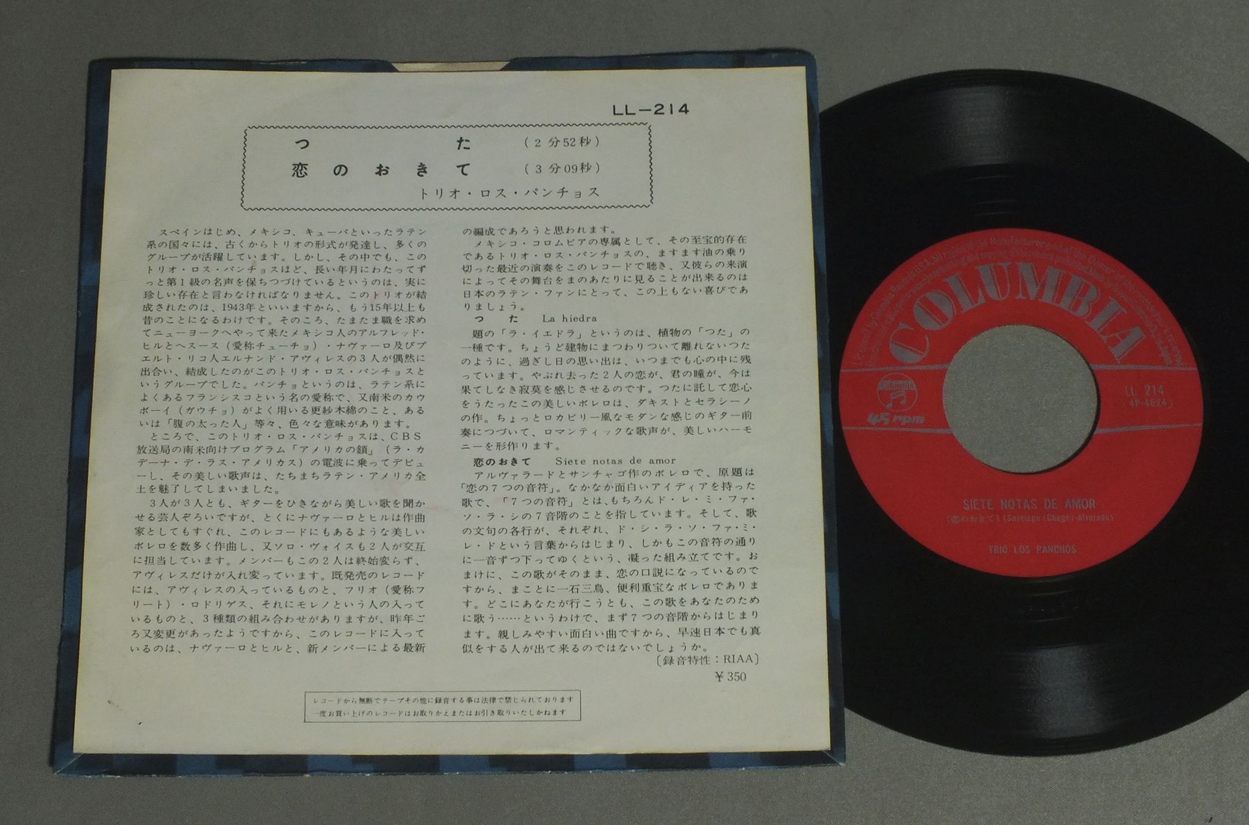 TRIO LOS PANCHOSトリオ・ロス・パンチョス/LA HIEDRAつた LL214 製造国:日本盤 / Media:7inch外観:EX盤の状態:EX- 価格(税込):¥440 送料 7inch:定形外郵便 360円~LP:定形外郵便 660円~送料は、注文の最終画面で確認頂けます。 レコード検索 > FEMALE > TRIO LOS PANCHOS/LA HIEDRA 外観 (EX)特記事項:右下にホチキス跡。ヨレやシミ。外観EXの共通説明:ダメージが限定的。中古品としては保存状態がよい方。シミ、ヨゴレ、スレ 少し~軽度。 盤の状態 (EX-)特記事項:薄いスリキズ・細かい表面スレ多少ある感じです。プチ出そうな所は少し。軽微なものが中心の様子です。盤EX-の共通説明:盤面のスリキズが多少有り。音に出そうなものは殆ど無いように見える~さほど気にならないぐらいの軽いプチ数カ所程度。 Tweet それぞれの画像をクリックすると、大きい写真が見られます こちらの商品もお勧めです 770円 NITTY GRITTY DIRT BANDニッティー・グリッティー・ダート・バンド / UNCLE CHARLIE & HIS DOG TEDDYアンクル・チャーリーと愛犬テディー 1,320円 JOAN BAEZジョーン・バエズ / GULF WINDSガルフ・ウィンズ 660円 JOAN BAEZジョーン・バエズ / JOAN自由の女神 990円 KITTY WELLSキティ・ウェルズ / DUST ON THE BIBLEダスト・オン・ザ・バイブル 990円 BANJO BARONSバンジョー・バロンズ / IT`S A FOLK FOLK FOLK FOLK WORLDバンジョー. フォーク・ソングの世界 ペラジャケ 990円 PETER PAUL & MARYピーター・ポール&マリー / IN CONCERT 770円 NITTY GRITTY DIRT BANDニッティー・グリッティー・ダート・バンド / STARS&STRIPES FOREVER星条旗よ永遠なれ! 770円 PETER PAUL&MARYピーター・ポール&マリー / LATE AGAINレイト・アゲイン