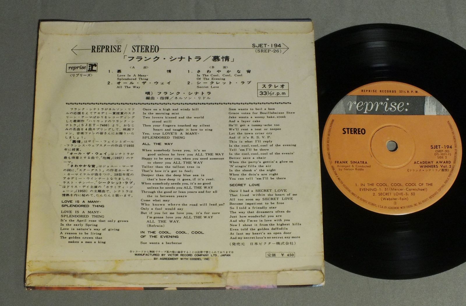 FRANK SINATRAフランク・シナトラ/LOVE IS A MANY-SPLENDORED THING慕情 SJET194 製造国:日本盤 / Media:7inch外観:VG盤の状態:VG 価格(税込):¥550 送料 7inch:定形外郵便 360円~LP:定形外郵便 660円~送料は、注文の最終画面で確認頂けます。 レコード検索 > CLASSIC CHAMBER > FRANK SINATRA/LOVE IS A MANY-SPLENDORED THING 外観 (VG)特記事項:スリキズやリングスレ有り。下のヘリにテープ補修や着色補修有り。外観VGの共通説明:ダメージが見るからに多い。 盤の状態 (VG)特記事項:スリキズ、スレ多め。プチ出そうなものも多少有り。盤VGの共通説明:盤面にスリキズがやや有り、音に出そうなものも所々有る。 Tweet それぞれの画像をクリックすると、大きい写真が見られます こちらの商品もお勧めです 1,320円 CARMEN McRAE AND JOE WILLIAMSカーメン・マクレエ & ジョー・ウイリアムス / IN CONCERTイン コンサート 1,320円 SWINGLE SINGERSスイングル・シンガール / JAZZ SEBASTIEN BACHジャズ・セバスチャン・バッハ 1,320円 DELLA REESEデラ・リーズ / DELLA REESE LIVEデラ・リーズ・ライヴ 990円 NANCY WILSONナンシー・ウィルスン / NANCY WILSON BEST 20ナンシー・ウィルスン・ベスト20 1,650円 NAMI HIDAKA日高なみ / NAMI HIDAKA AUTOGRAPHED日高なみ サイン付 770円 SWINGLE SINGERSスイングル・シンガーズ / GOING BAROQUEジャズ・バロック・コーラス 1,210円 YASUKO阿川泰子 / JOURNEY-YASUKO LOVE-BIRDジャーニー-ヤスコ・ラブ・バード 1,320円 BUDDY GRECOバディ・グレコ / AT MISTER KELLY`Sアット・ミスター・ケリーズ