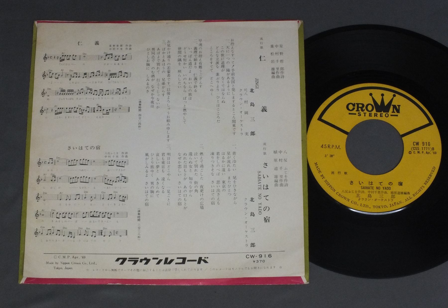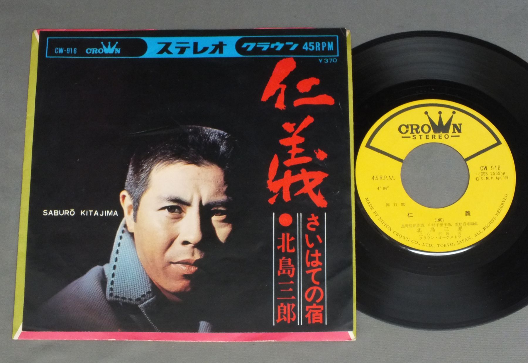 SABURO KITAJIMA北島三郎/JINGI仁義 CW916 製造国:日本盤 / Media:7inch外観:EX盤の状態:EX- 価格(税込):¥440 送料 7inch:定形外郵便 360円~LP:定形外郵便 660円~送料は、注文の最終画面で確認頂けます。 > > SABURO KITAJIMA/JINGI 外観 (EX)特記事項:裏ジャケ側によごれ有り。外観EXの共通説明:ダメージが限定的。中古品としては保存状態がよい方。シミ、ヨゴレ、スレ 少し~軽度。 盤の状態 (EX-)特記事項:薄いスリキズ・細かい表面スレ多少ある感じです。プチ出そうな所は少し。軽微なものが中心の様子です。盤EX-の共通説明:盤面のスリキズが多少有り。音に出そうなものは殆ど無いように見える~さほど気にならないぐらいの軽いプチ数カ所程度。 Tweet それぞれの画像をクリックすると、大きい写真が見られます こちらの商品もお勧めです 880円 上原敏 / 憶い出の任侠・時代歌謡-ポリドール SP原盤 シリーズ 880円 村田英雄-青山和子-安達明 他 / コロムビア歌のハイライト (第五集) 880円 上原敏 / ポリドール(SP原盤)シリーズ -第6集- 哀愁の抒情・マドロス歌謡 660円 CHIEKO SATOH佐藤千夜子 / BEST COLLECTIONオリジナル原盤による懐しの歌声シリーズ4 東京行進曲 990円 YOSHIO TABATA田端義夫 / BEST ALBUM歌道ひと筋三十年 田端義夫の傑作全集 心の唄 1,210円 KEIICHIRO AKAGI赤木圭一郎 / EIEN-NO-TONY永遠のトニー 赤木圭一郎絶唱集 1,210円 高峰秀子-橋幸夫 他 / 続 日本流行歌史 770円 MIEKO TAKAMINE高峰三枝子 / SONG ALBUM高峰三枝子 歌のアルバム