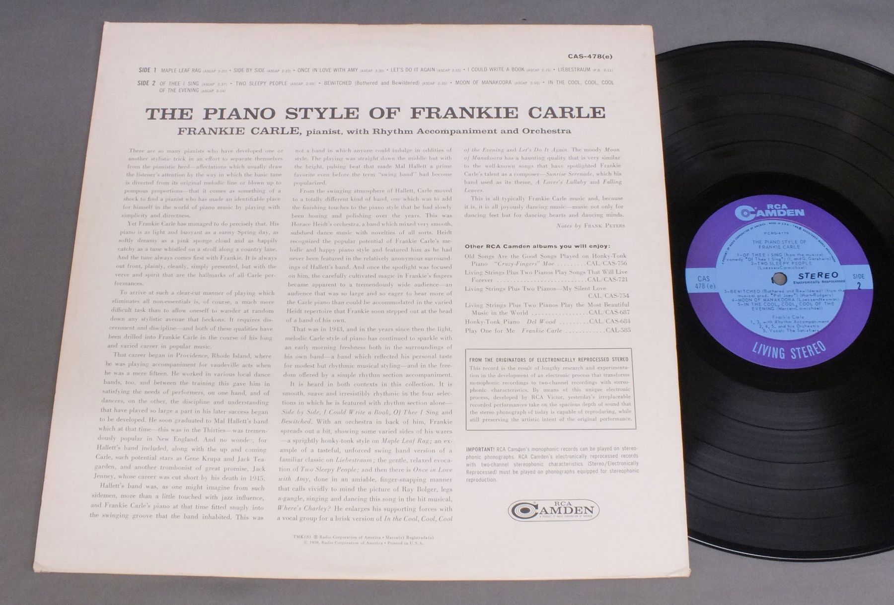 FRANKIE CARLE/PIANO STYLE OF FRANKIE CARLE CAS478 製造国:米国盤 / Media:LP外観:EX盤の状態:EX 価格(税込):¥660(売約済) 送料 7inch:定形外郵便 360円~LP:定形外郵便 660円~送料は、注文の最終画面で確認頂けます。 > > FRANKIE CARLE/PIANO STYLE OF FRANKIE CARLE 外観 (EX)特記事項:特記なし。外観EXの共通説明:ダメージが限定的。中古品としては保存状態がよい方。シミ、ヨゴレ、スレ 少し~軽度。 盤の状態 (EX)特記事項:薄いスリキズ・スレ軽くある感じ。軽微なものの様子です。盤EXの共通説明:盤面のスリキズが薄いものが少し~軽度 音に出そうなものは無いように見える(軽微なソフトティック音は除く)。 Tweet それぞれの画像をクリックすると、大きい写真が見られます こちらの商品もお勧めです 770円 HARRY JAMES AND HIS MUSIC MAKERS / SPOTLIGHT ON HARRY JAMES 770円 ARTIE SHAW ORCHESTRA / BORN TO SWING 990円 AL HIRT / AL HIRT SWINGIN` DIXIE VOL 4 880円 BENNY GOODMAN & CHARLIE BARNET / BENNY GOODMAN ( 1939 ) - CHARLIE BARNET ( 1938-41 ) 1,320円 YANK LAWSON AND BOB HAGGART / WORLD`S GREATEST JAZZBAND 1,210円 WORLD`S GREATEST JAZZ BAND OF YANK LAWSON AND BOB HAGGART / LIVE AT THE ROOSEVELT GRILL(RALPH SUTTON AUTOGRAPHED)LIVE AT THE ROOSEVELT GRILL(RALPH SUTTONサイン付) 660円 DUKE ELLINGTON / EARLY DUKE ELLINGTON 1,155円 GLENN MILLER - TOMMY DORSEY / GLENN MILLER`S MODERNAIRES
