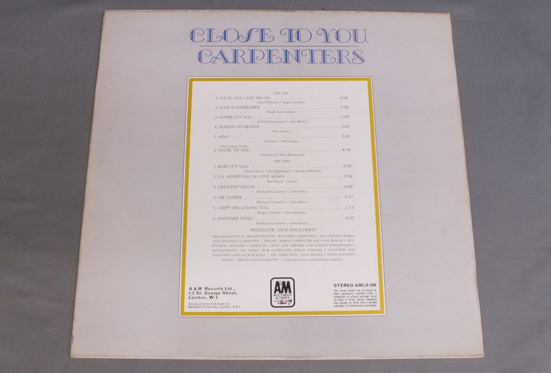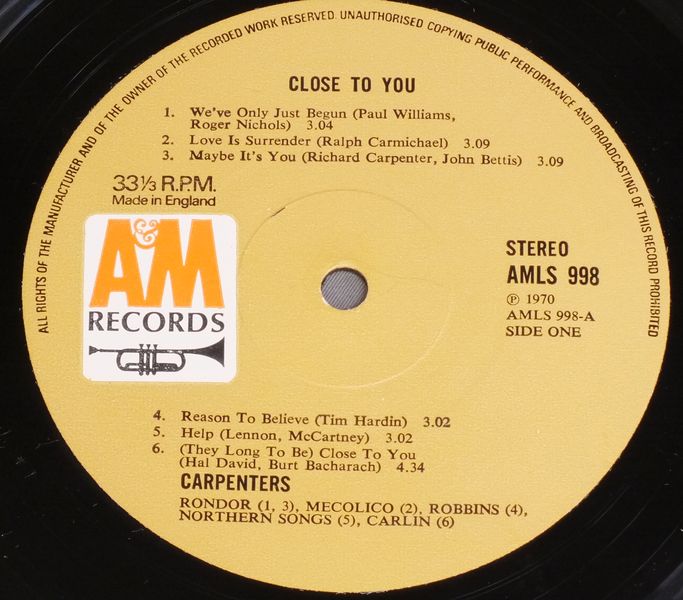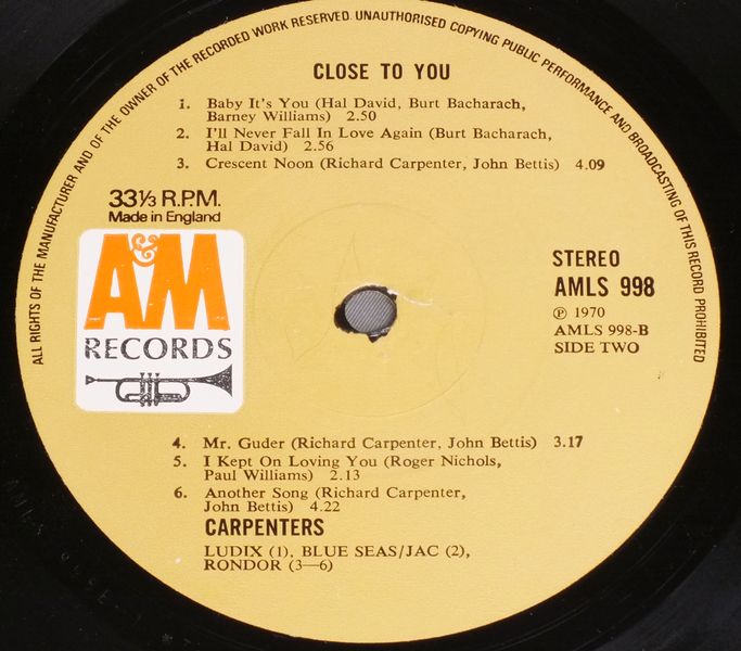 CARPENTERS/CLOSE TO YOU AMLS998 製造国:英国盤 / Media:LPMatrix:A-1 B-1外観:EX盤の状態:EX 価格(税込):¥4,400(売約済) 送料 7inch:定形外郵便 360円~LP:定形外郵便 660円~送料は、注文の最終画面で確認頂けます。 > > CARPENTERS/CLOSE TO YOU 外観 (EX)特記事項:表裏ジャケ共に厚手のコーティング仕様。表裏ジャケ共に背に沿ってコーティングの浮き有り。ジャケ表面はコーティングのヨレシワは少な目。レコード取り出し口淵や裏ジャケ側の上下ヘリ付近によごれ多少有。表裏ジャケ共にスレやスリキズ等は全体的に薄い感じです。外観EXの共通説明:ダメージが限定的。中古品としては保存状態がよい方。シミ、ヨゴレ、スレ 少し~軽度。 盤の状態 (EX)特記事項:薄いスリキズ・スレ少しある程度。音に出そうなものもなく一見してきれいな状態です。曲間など、静かなところを中心に聴いて見ましたが、チリノイズ少ないきれいな再生具合でした。盤EXの共通説明:盤面のスリキズが薄いものが少し~軽度 音に出そうなものは無いように見える(軽微なソフトティック音は除く)。 Tweet それぞれの画像をクリックすると、大きい写真が見られます こちらの商品もお勧めです 7,700円 SUSAN MAUGHAN / I WANNA BE BOBBY`S GIRL 3,850円 NICO / THE END 4,950円 JONI MITCHELL / DOG EAT DOG 4,400円 JONI MITCHELL / DOG EAT DOG 4,950円 SANDY DENNY / RENDEZVOUS 5,060円 JONI MITCHELL / CHALK MARK IN A RAIN STORM