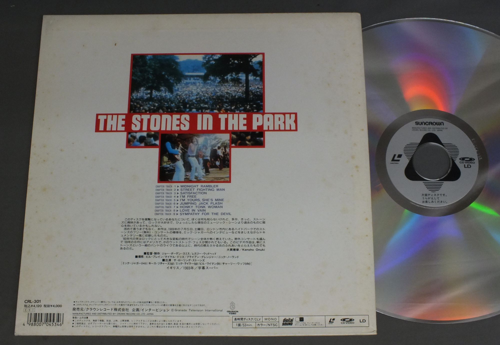 ROLLING STONESローリング・ストーンズ/STONES IN THE PARKハイド・パーク・コンサート CRL301 製造国:日本盤 / Media:LD外観:VG+盤の状態:EX 価格(税込):¥770 送料 7inch:定形外郵便 360円~LP:定形外郵便 660円~送料は、注文の最終画面で確認頂けます。 > > ROLLING STONES/STONES IN THE PARK 外観 (VG+)特記事項:ジャケ表面にシミやよごれ有り外観VG+の共通説明:ダメージやや有り。シミ、ヨゴレ、スレなど多少~やや多め。 盤の状態 (EX)特記事項:薄いスリキズ・スレ軽くある感じ。軽微なものの様子です。盤EXの共通説明:盤面のスリキズが薄いものが少し~軽度 音に出そうなものは無いように見える(軽微なソフトティック音は除く)。 Tweet それぞれの画像をクリックすると、大きい写真が見られます こちらの商品もお勧めです 2,200円 ROLLING STONES / EMOTIONAL RESCUE 特大ポスター付 3,300円 ROLLING STONES / LET IT BLEED STEREOインナー 4,950円 ROLLING STONES / DA DOO RON RON 3,300円 ROLLING STONES / THEIR SATANIC MAJESTIES REQUEST オリジナルインナー