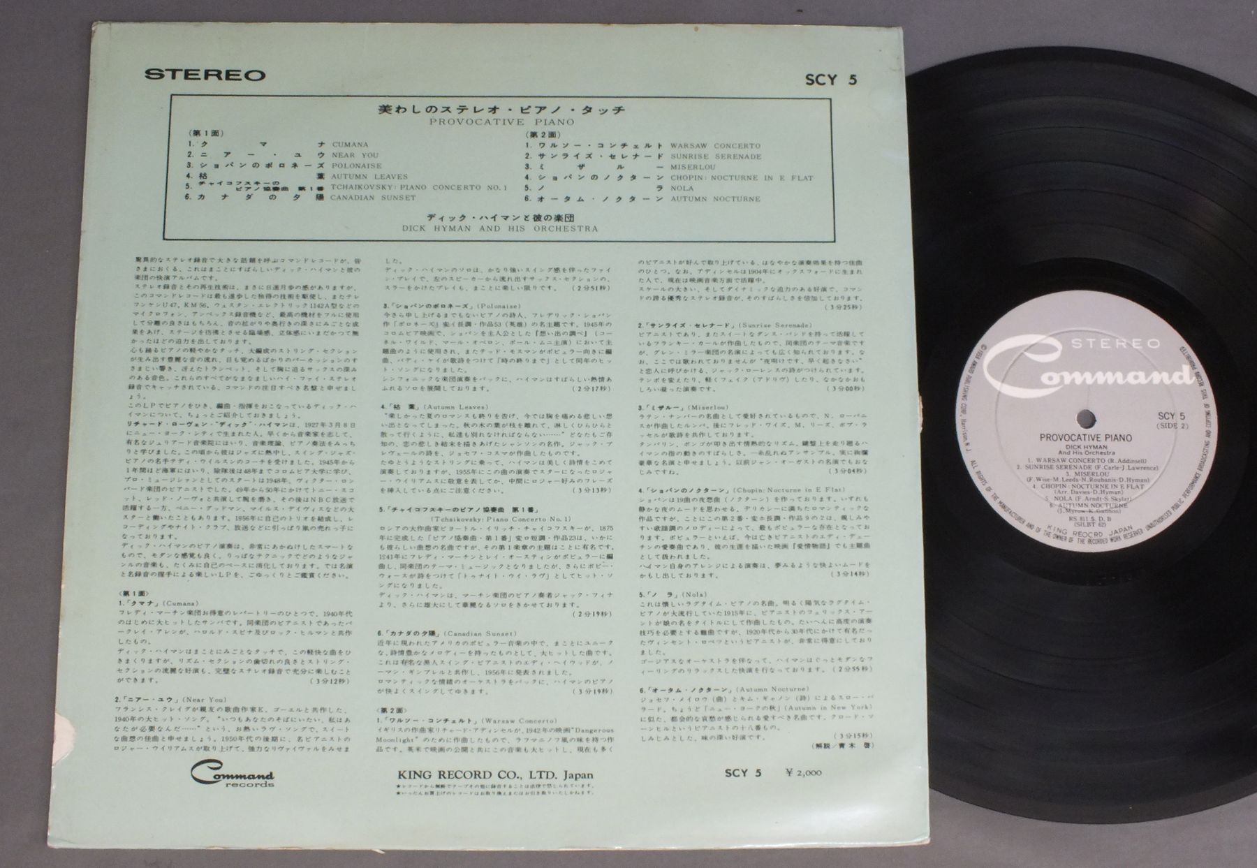 DICK HYMAN AND HIS ORCHESTRAディック・ハイマンと彼の楽団/PROVOCATIVE PIANO美わしのステレオ・ピアノ・タッチ SCY5 製造国:日本盤 / Media:LP外観:EX-盤の状態:EX- 価格(税込):¥770(売約済) 送料 7inch:定形外郵便 360円~LP:定形外郵便 660円~送料は、注文の最終画面で確認頂けます。 > > DICK HYMAN AND HIS ORCHESTRA/PROVOCATIVE PIANO 外観 (EX-)特記事項:シミ軽あり外観EX-の共通説明:ダメージ軽度~多少。 中古品としては普通の状態。シミ、ヨゴレ、スレなど軽く~多少。 盤の状態 (EX-)特記事項:薄いスリキズ・細かい表面スレ軽くある感じです。プチ出そうな所は少し。軽微なものが中心の様子です。盤EX-の共通説明:盤面のスリキズが多少有り。音に出そうなものは殆ど無いように見える~さほど気にならないぐらいの軽いプチ数カ所程度。 Tweet それぞれの画像をクリックすると、大きい写真が見られます こちらの商品もお勧めです 440円 BENNY GOODMAN & HIS ORCHESTRA / HISTORICAL RECORDINGS 1935-39 440円 HARRY JAMES / JAZZ HISTORICAL RECORDINGS 1938 & 42 1,210円 CHARLOTTE CROSSLEY - LORRAINE FEAATHER - STEVE MARCHシャーロット・クロスリー& ロレイン・フェザー&スティヴ・マーチ / SWINGスイング 990円 BENNY GOODMANベニー・グッドマン / BENNY GOODMAN ON V-DISCオン・Vディスク 1943-46 880円 BOBBY & MUGGSYボビー・アンド・マグシー / HORN A PLENTY 880円 TOMMY DORSEYトミ−・ド−シ− / DANCE & ROMANCE僕はセンチに−トミ−・ド−シ−・デラックス 1,980円 BENNY GOODMANベニー・グッドマン / KING OF SWING BENNY GOODMAN VOL1 2LP BOX SETベニー・グッドマンの黄金時代 第1集 2枚組BOX 550円 LIONEL HAMPTON / 1944 & 46