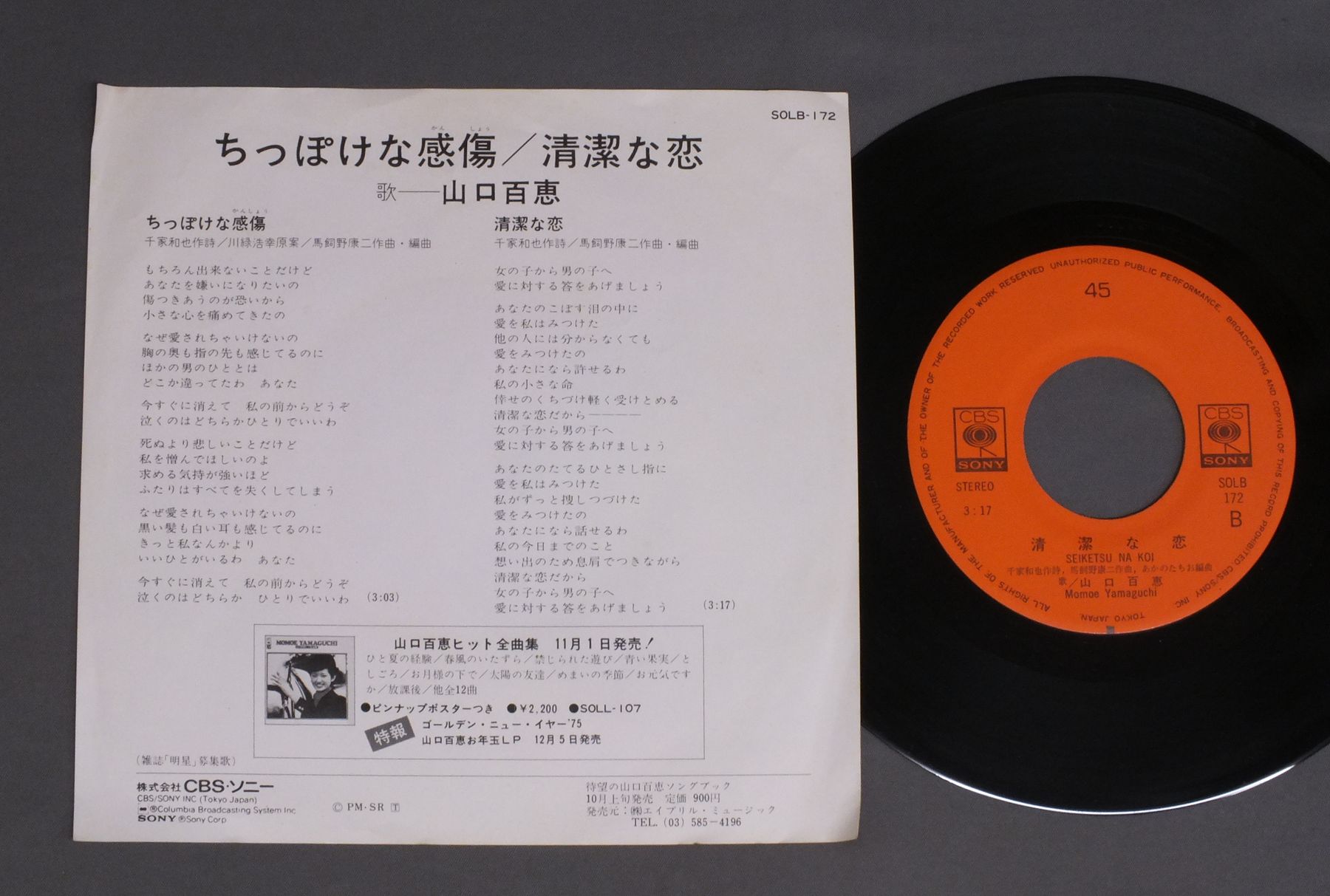 MOMOE YAMAGUCHI山口百恵/CHIPPOKE NA KANSHOちっぽけな感傷 SOLB172 製造国:日本盤 / Media:7inch外観:EX盤の状態:EX 価格(税込):¥550 送料 7inch:定形外郵便 360円~LP:定形外郵便 660円~送料は、注文の最終画面で確認頂けます。 レコード検索 > J-POP > MOMOE YAMAGUCHI/CHIPPOKE NA KANSHO 外観 (EX)特記事項:ヨレ有り外観EXの共通説明:ダメージが限定的。中古品としては保存状態がよい方。シミ、ヨゴレ、スレ 少し~軽度。 盤の状態 (EX)特記事項:薄いスリキズ・スレ軽くある感じ。殆どが軽微なものの様子です。盤EXの共通説明:盤面のスリキズが薄いものが少し~軽度 音に出そうなものは無いように見える(軽微なソフトティック音は除く)。 Tweet それぞれの画像をクリックすると、大きい写真が見られます こちらの商品もお勧めです 1,210円 USHIRO-YUBI SASAREGUMIうしろゆびさされ組 / 1st LP ( FUWAFURA )ふ・わ・ふ・ら 880円 MOMOE YAMAGUCHI山口百恵 / 16s THEME16才のテーマ 1,210円 SONOKO KAWAI河合その子 / MODE DE SONOKO 1,210円 SAORI MINAMI南沙織 / HITOKAKERANO JUNJYOひとかけらの純情 770円 SEIKO MATSUDA松田聖子 / SEIKO TOWN 990円 SONOKO KAWAI河合その子 / SIESTAシエスタ 990円 SONOKO KAWAI河合その子 / SIESTAシエスタ 660円 MIYOKO ASADA浅田美代子 / TRAVELLING AROUND THE WORLD WITH MIYOKOしあわせの一番星-恋は真珠いろ -(美代子と世界の旅)