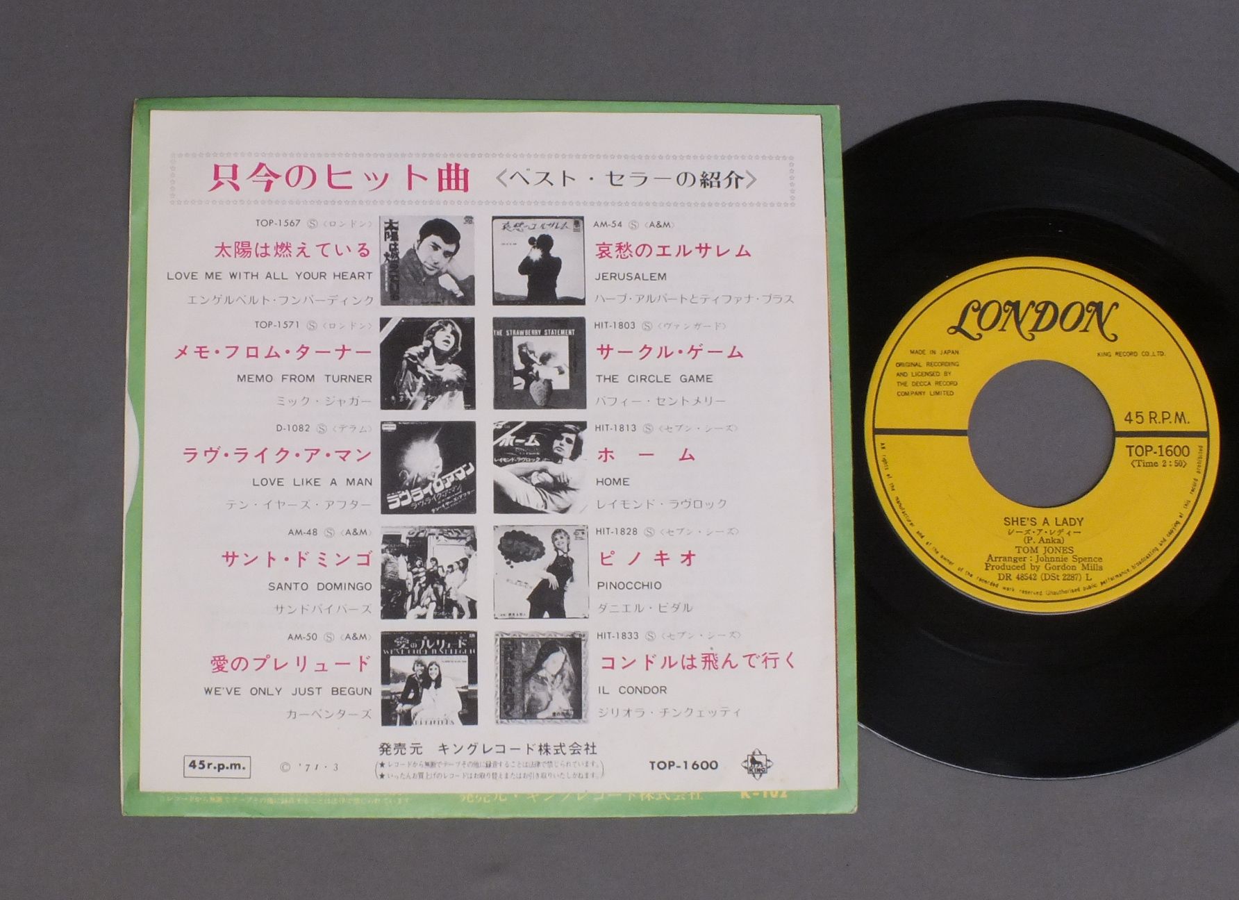 TOM JONESトム・ジョーンズ/SHE`S A LADYシーズ・ア・レディー TOP1600 製造国:日本盤 / Media:7inch外観:EX盤の状態:VG+ 価格(税込):¥330 送料 7inch:定形外郵便 360円~LP:定形外郵便 660円~送料は、注文の最終画面で確認頂けます。 レコード検索 > CLASSIC CHAMBER > TOM JONES/SHE`S A LADY 外観 (EX)特記事項:特記なし。外観EXの共通説明:ダメージが限定的。中古品としては保存状態がよい方。シミ、ヨゴレ、スレ 少し~軽度。 盤の状態 (VG+)特記事項:薄いスリキズ・細かいスレ軽度。プチ出そうな小キズ、線キズは数カ所で、全体的には軽微なものが殆どです。少し聴いてみましたが、音自体はしっかりクリアーに鳴っているようでした。盤VG+の共通説明:盤面にスリキズが多少~やや有り、音に出そうなものも多少ある。 Tweet それぞれの画像をクリックすると、大きい写真が見られます こちらの商品もお勧めです 990円 PAUL ANKAポール・アンカ / BEST OF PAUL ANKAポール・アンカのすべて 1,320円 GARY WRIGHTゲイリー・ライト / LIGHT OF SMILESライト・オブ・スマイル 1,210円 MICHEL POLNAREFFミッシェル・ポルナレフ / POLNAREF NOWポルナレフ・ナウ 880円 ROBERT PALMERロバート・パーマー / PRIDEプライド 880円 GRAHAM BONNET / LINE UP孤独のナイトゲーム 770円 JOHN DENVERジョン・デンバー / DREAMLAND EXPRESSドリームランド・エクスプレス 1,210円 FRANKIE VALLIフランキー・ヴァリ / OUR DAY WILL COME燃える初恋 1,210円 WILLIE NELSONウィリー・ネルソン / PARTNERSサムシング