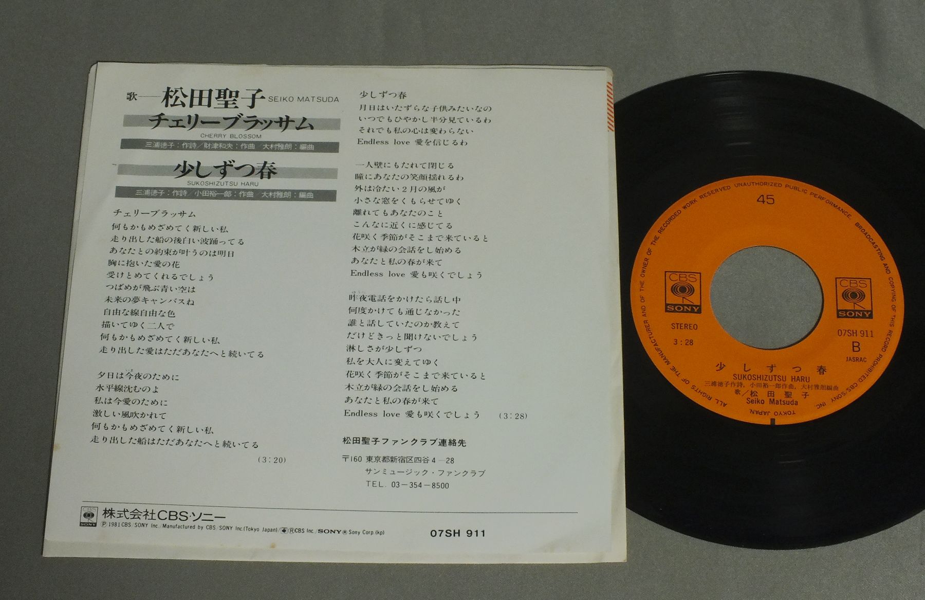 SEIKO MATSUDA松田聖子/CHERRY BLOSSOMチェリーブラッサム 07SH911 製造国:日本盤 / Media:7inch外観:EX盤の状態:EX+ 価格(税込):¥660 送料 7inch:定形外郵便 360円~LP:定形外郵便 660円~送料は、注文の最終画面で確認頂けます。 レコード検索 > J-POP > SEIKO MATSUDA/CHERRY BLOSSOM 外観 (EX)特記事項:特記なし。外観EXの共通説明:ダメージが限定的。中古品としては保存状態がよい方。シミ、ヨゴレ、スレ 少し~軽度。 盤の状態 (EX+)特記事項:薄いスリキズ・スレ少し。一見してきれいな状態です。盤EX+の共通説明:盤面の極薄いスリキズ、スレ少し程度 音に出そうなものは無いように見える(極軽微なソフトティック音は除く)。 Tweet それぞれの画像をクリックすると、大きい写真が見られます こちらの商品もお勧めです 1,210円 TSUKASA ITOH伊藤つかさ / SAYONARA KONNICHIWAさよなら、こんにちは 1,320円 MIKI ASAKURA麻倉未稀 / SEXY ELEGANCEセクシー・エレガント 550円 SONOKO KAWAI河合その子 / SONOKOその子 990円 YOSHIMI IWASAKI岩崎良美 / SAISONS (2nd ALBUM)セゾン(2nd ALBUM) 1,210円 HIROMI IWASAKI岩崎宏美 / ROMANTIC CONCERT 2ロマンティック・コンサート2 + ピンナップ付 770円 TOMOYO HARADA原田知世 / NADESHIKO JUNJO撫子純情(なでしこじゅんじょう)-拾七歳バースデイ・アルバム 990円 PINK LADYピンク・レディー / BYE BYE CARNIVALバイ・バイ・カーニバル 770円 SHOKO SAWADA沢田聖子 / KAZEN NO YOKAN風の予感