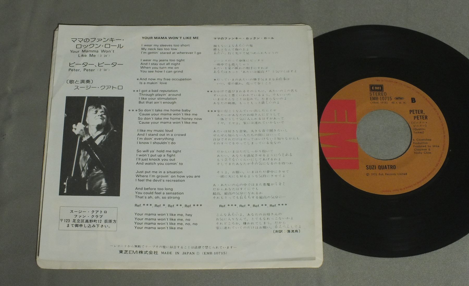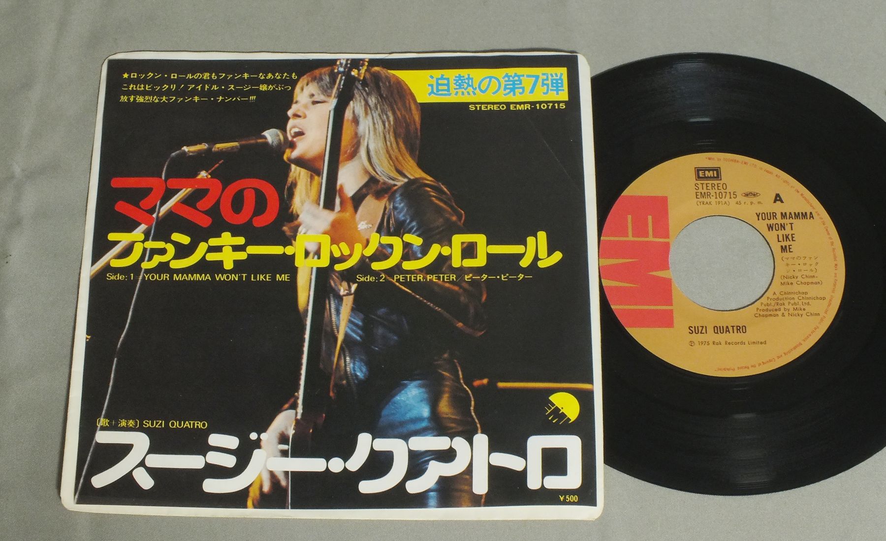 SUZI QUATROスージー・クアトロ/YOUR MAMMA WON`T LIKE MEママのファンキー・ロックン・ロール EMR10715 製造国:日本盤 / Media:7inch外観:EX盤の状態:EX 価格(税込):¥550 送料 7inch:定形外郵便 360円~LP:定形外郵便 660円~送料は、注文の最終画面で確認頂けます。 レコード検索 > J-POP > SUZI QUATRO/YOUR MAMMA WON`T LIKE ME 外観 (EX)特記事項:ヨレや薄いシミが少し。軽い折れ跡有り。外観EXの共通説明:ダメージが限定的。中古品としては保存状態がよい方。シミ、ヨゴレ、スレ 少し~軽度。 盤の状態 (EX)特記事項:薄いスリキズ・スレ少しある感じ。一見してきれいな感じです。盤EXの共通説明:盤面のスリキズが薄いものが少し~軽度 音に出そうなものは無いように見える(軽微なソフトティック音は除く)。 Tweet それぞれの画像をクリックすると、大きい写真が見られます こちらの商品もお勧めです 1,320円 TODD RUNDGREN`S UTOPIAトッド・ラングレン / RAトッド・ラングレンズ・ユートピア 1,320円 TUXEDO JUNCTIONタキシード・ジャンクション / CHATTANOOGA CHOO CHOOチャタヌガ・チュー・チュー 770円 TOTO / ISOLATIONアイソレーション 880円 SANTANAサンタナ / SANTANAサンタナのすべて 1,320円 KENNY ROGERS & THE FIRSY EDITIONケニー・ロジャーズとファースト・エディション / TELL IT ALL BROTHERテル・イット・オール・ブラザー 770円 REO SPEEDWAGONREO スピードワゴン / HI INFIDELITY禁じられた夜 1,320円 QUATRO SUZIスージー・クアトロ / QUATRO陶酔のアイドル 1,320円 CATE BROTHERS BANDケイト・ブラザーズ・バンド / RENDEZVOUSランデヴー